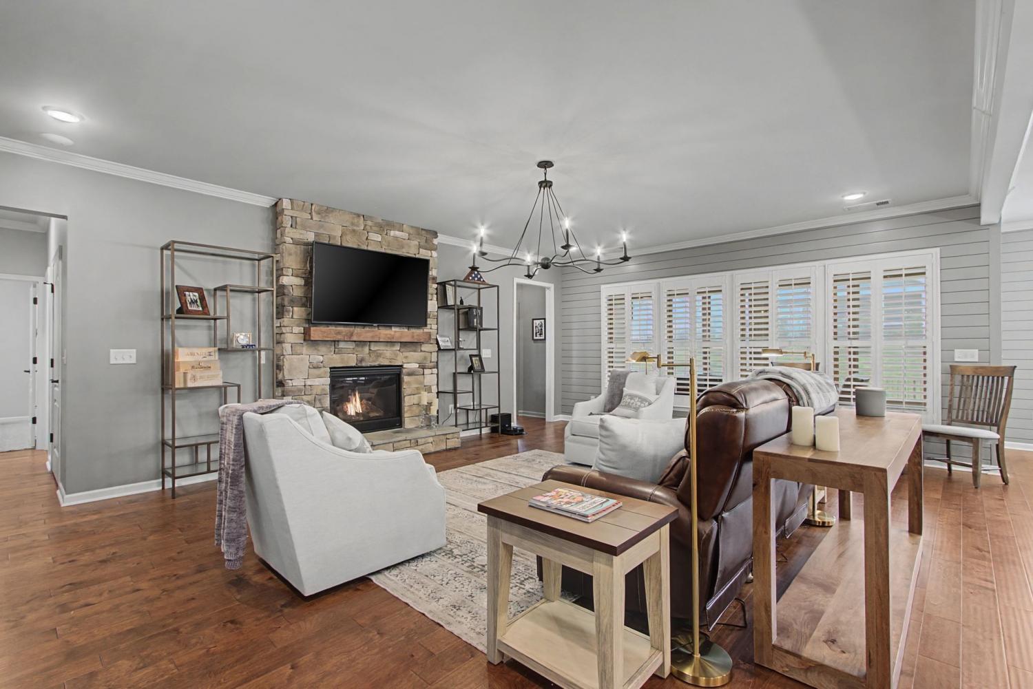 Awesome, 3 bedroom, 3 bath, Dunwoody floor plan in the highly sought after Southern Springs by Del Webb 55 plus active adult community with very low maintenance. Conveniently located in Spring Hill with easy access to I 65 and five minutes from shopping, dining, post office, and emergency room. This beautiful home is move in ready and available for immediate occupancy. Gorgeous gas log burning, stone fireplace in the open concept Great Room. Upgraded kitchen with wood cabinetry, soft close doors and drawers, beverage cooler, farmhouse sink, quartz countertops, gas cooktop, built in oven and microwave, walk in pantry, all appliances convey. Primary bedroom with accent wall, lots of natural light, engineered hardwood floors, and ensuite bath with double sink vanities, walk in tile shower with bench seat and rain shower head, separate water closet, linen closet, and access to huge owner's closet with modular closet system. Library/office with custom built in cabinetry perfect for the book and art collector. This executive style home, all one level, has many high end custom finishes. Storage in the laundry room with built in cabinetry, drop zone, and sink. Lanai with easy breeze windows for year round use overlooking the fenced backyard. Epoxy coating on front porch, lanai and garage for easy maintenance and cleaning. HOA maintains lawn. Community has both indoor and outdoor pools, pickle ball, and tennis courts, gas fire pit, pavilion with gas grills and patio tables, clubhouse with fitness center and fitness classes, ball rooms, kitchen, conference room, card/game room, massage room, men's and women's locker rooms, and a dog park. Over 70 clubs and special interest groups, special programs, presentations, concerts, Southern Springs choir and band, as well as photography, painting, quilting, solo clubs, coffee club, Veteran's club, and so much more. Living in Southern Springs is like vacationing at a very active resort. Thirty-five minutes to/from BNA.