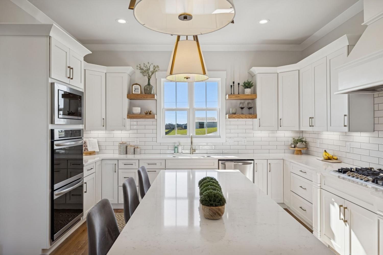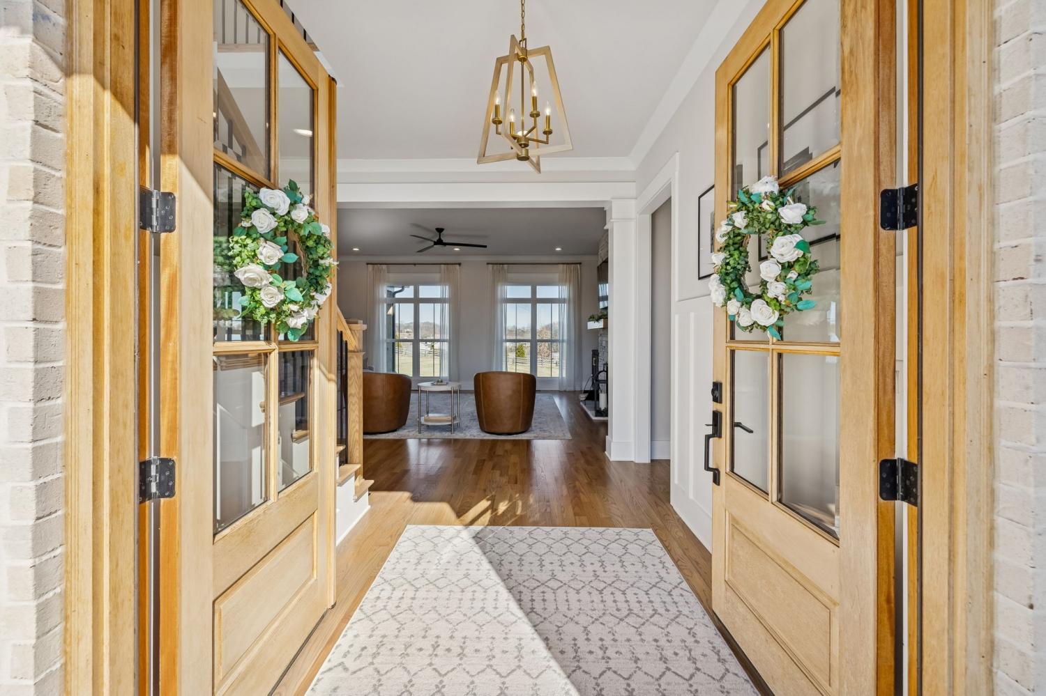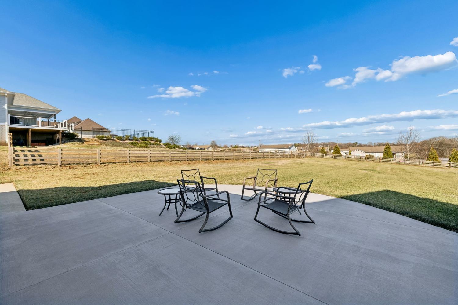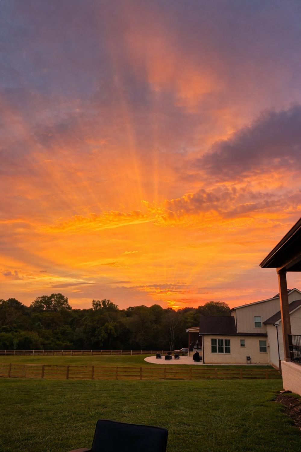 This luxury home offers a level of quality, space, and intentional design that goes beyond a typical new build. Located in a boutique neighborhood with minimal traffic and wide open surroundings, it provides peaceful living without sacrificing convenience. The home features expansive views with beautiful sunrises and sunsets, along with abundant natural light from large windows overlooking the surrounding hills. The layout is thoughtfully designed for functionality, including a massive, separate playroom ideal for kids or flexible living space. All bedrooms are en-suites. The primary and a secondary bedroom are downstairs, with two additional bedrooms upstairs. A large walk-in attic offers exceptional storage or future build-out potential, while the lengthy, wide driveway allows for ample parking and outdoor play. The epoxy-finished 3 car garage adds a polished, durable touch. Outdoor living is enhanced on a larger than normal lot, by both a covered patio that remains shaded for much of the day during warmer months, and an uncovered patio for more room for entertaining. Additional features include an encapsulated walk-in crawl space and a storm shelter, reinforcing the home’s quality and practicality. All of this is just minutes from everyday conveniences like the new Publix, restaurants, movie theater, Fischer Park, and quick access to I-65. Designed intentionally and built for everyday living, this home delivers luxury, privacy, and functionality in one exceptional package.