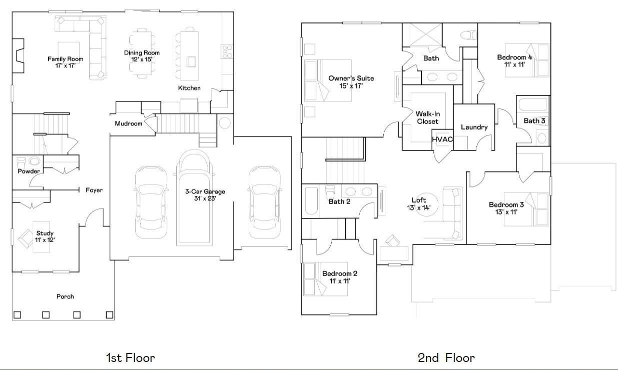 Past the welcoming front porch of this new two-story home, there is a practical study well-suited for those work-from-home days. At the back is a free-flowing open layout shared among a fully equipped modern kitchen, a dining room and a family room. Residing upstairs is a versatile loft surrounded by all four bedrooms, including the tranquil owner’s suite with an attached bathroom and walk-in closet. *Images from a furnished model of this home. Actual configuration and features may vary.