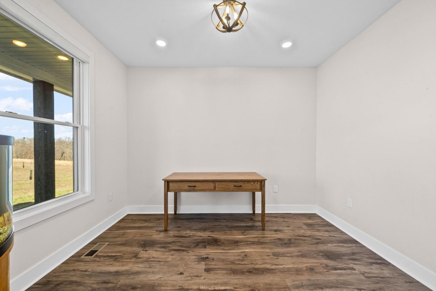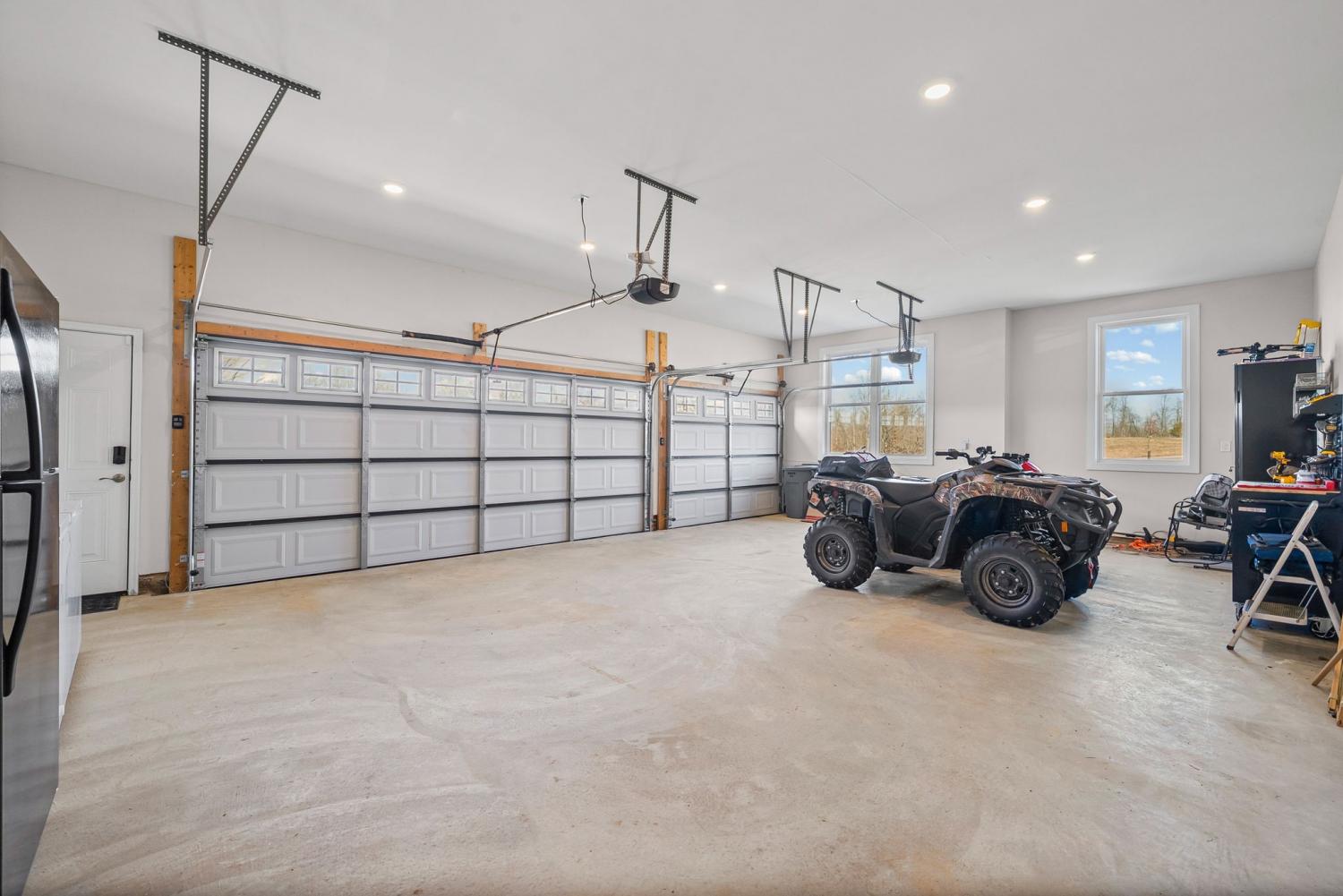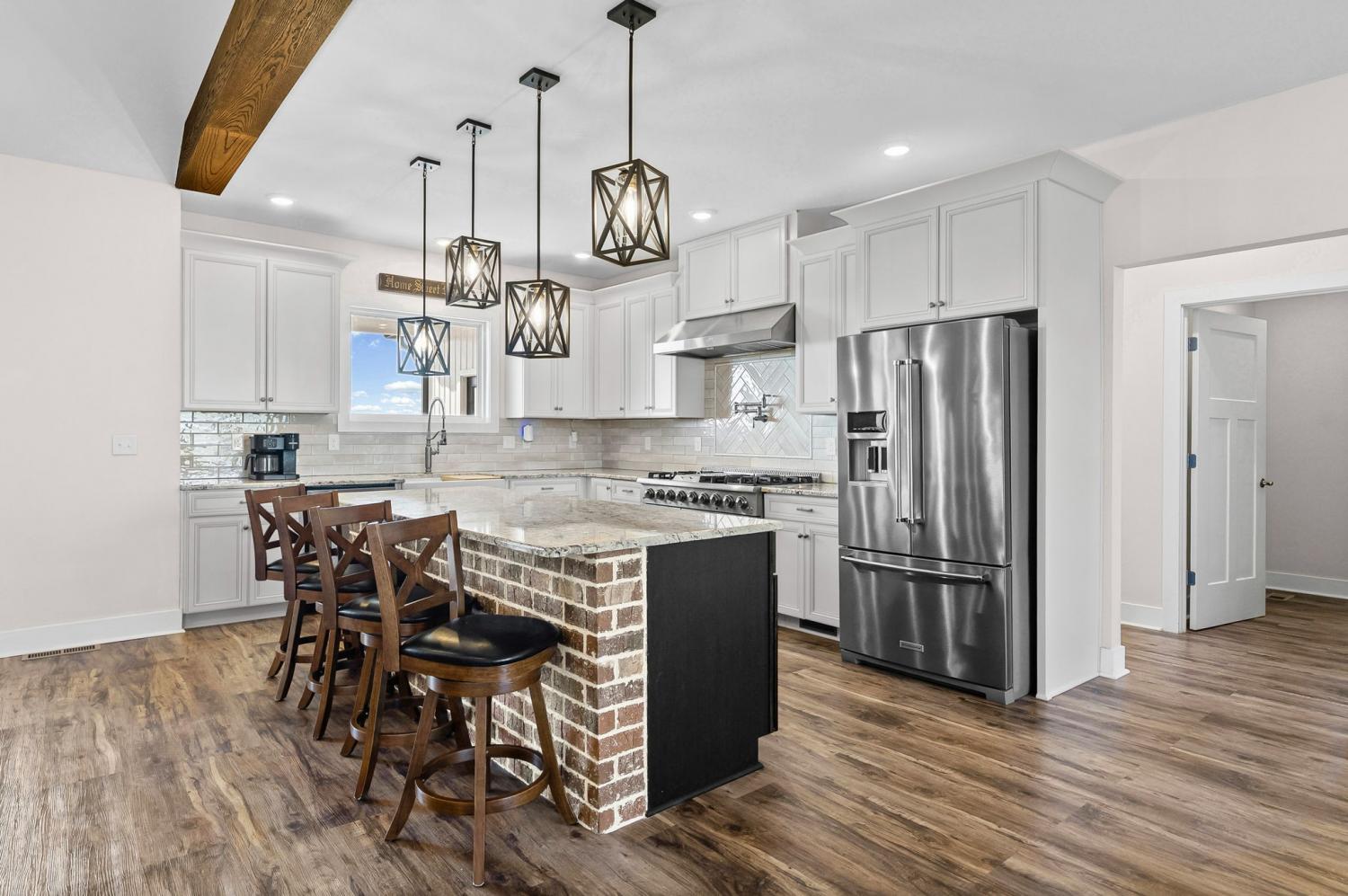 Welcome to your private estate on 47 Acres! Custom built in 2024; this sprawling 2,799 SqFt ranch home is beautifully surrounded by acres of hardwoods and is set back from the road for ultimate privacy. French doors welcome you into the vaulted entryway. A flex room, perfect for a home office or formal dining room, is conveniently located off the entryway. Luxury vinyl floors flow from the front door into the spacious living area where wood beams and a brick fireplace accent the space beautifully. Two sets of French doors allow the best view of your acreage, oversized back porch, back patio and backyard. The chef’s kitchen is adorned with a Thor double oven gas range with griddle, pot filler, large farmhouse sink and an extra-large island with storage and a built-in microwave. A large open dining area and walk-in pantry with custom door complete the open-concept space. The primary suite features a wood beam to compliment the vaulted ceiling, French doors to the back patio, two large walk-in closets, and luxury vinyl flooring while the primary bathroom boasts separate vanities, extra storage cabinetry, tiled shower and a free-standing tub with surround tile. Bedroom two features its own full bathroom, perfect for guests, while bedrooms three and four share a joined full bathroom. The main level is completed by a half bath, a tiled laundry space with sink and extra storage cabinetry and a three-car garage. Outside you will find a giant covered deck with propane line installed for a grill, and a large patio. The home features a tankless hot water system, full home filtration system and downstairs, a full unfinished walkout basement (2,799 SqFt) with plumbing for future bathroom. The property has an abundance of deer and wildlife and is in greenbelt to help save on property taxes. The large 30x50 (1,500 SqFt) shop/barn has all the space you will ever need for equipment storage. Home recently appraised for $1,425,000.00.