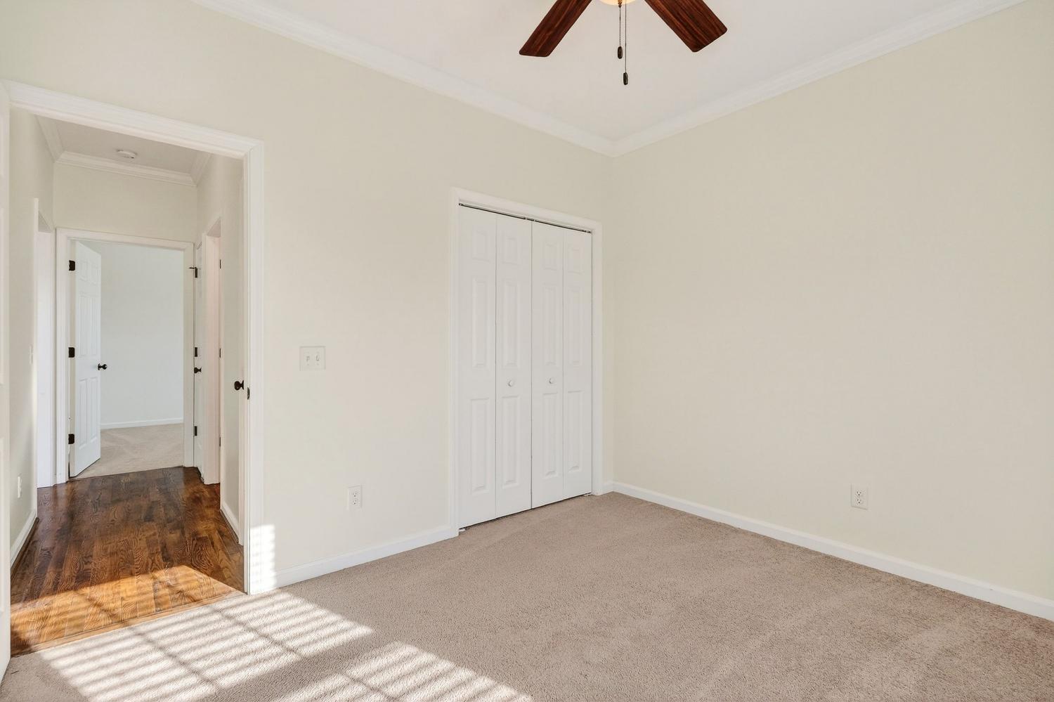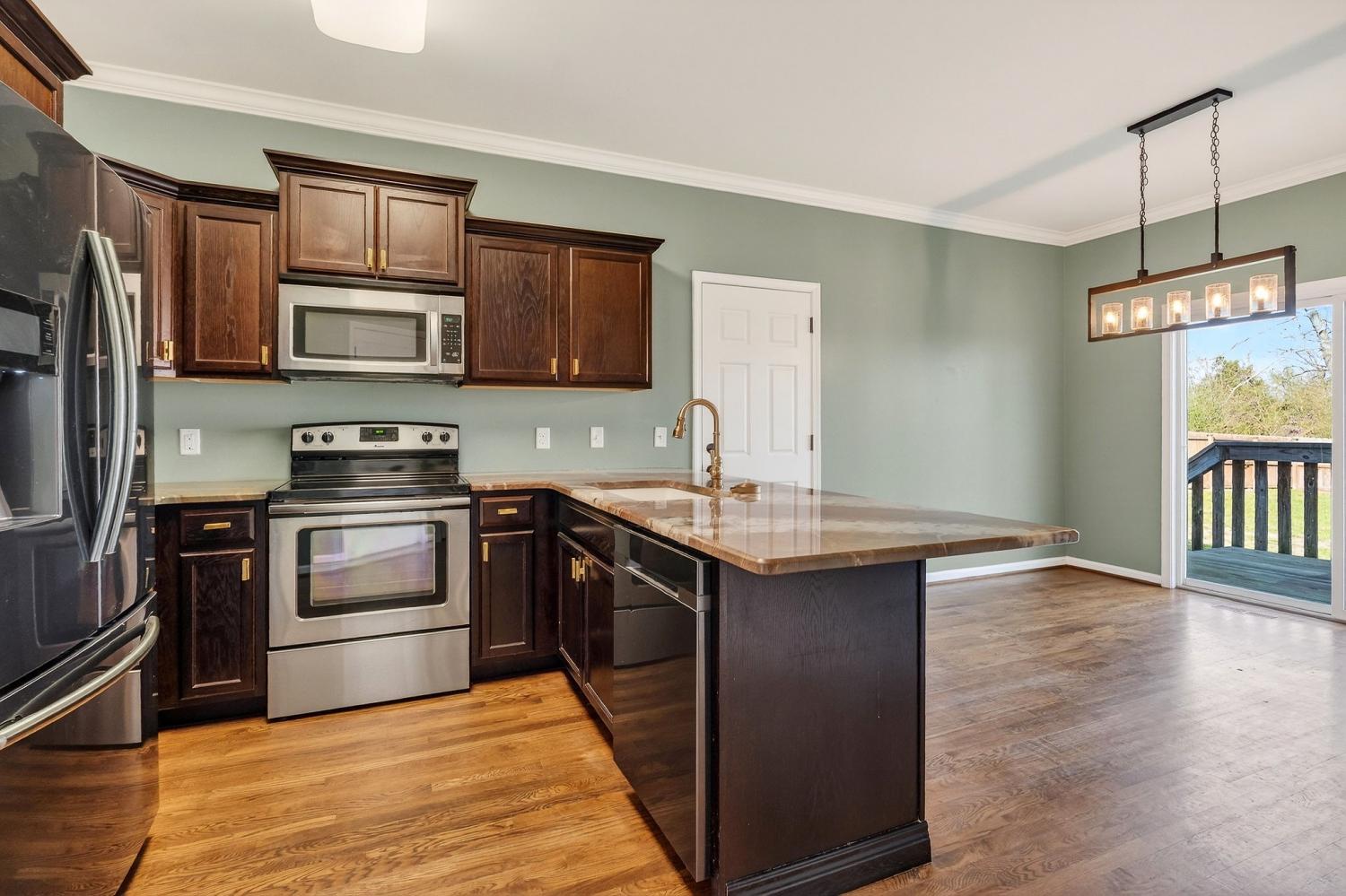 Adorable & well-maintained 3-bedroom, 2-bath home featuring soaring 9-foot ceilings & elegant crown molding throughout. Beautiful hardwood floors flow through the living area, kitchen, & spacious primary bedroom, creating a warm and inviting atmosphere. The open kitchen and dining area offer the perfect space for everyday living & entertaining, complete with stainless steel appliances, custom quartzite countertops & a generous walk-in pantry for added storage. Step outside to the open rear deck overlooking a huge backyard—ideal for relaxing, gardening, or hosting gatherings. Enjoy the charm of peaceful country living while still being conveniently close to shopping, dining, and local activities. This home offers the perfect blend of comfort, style, & location.