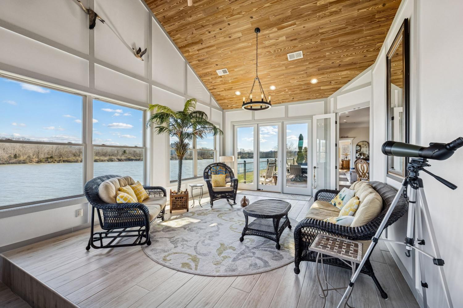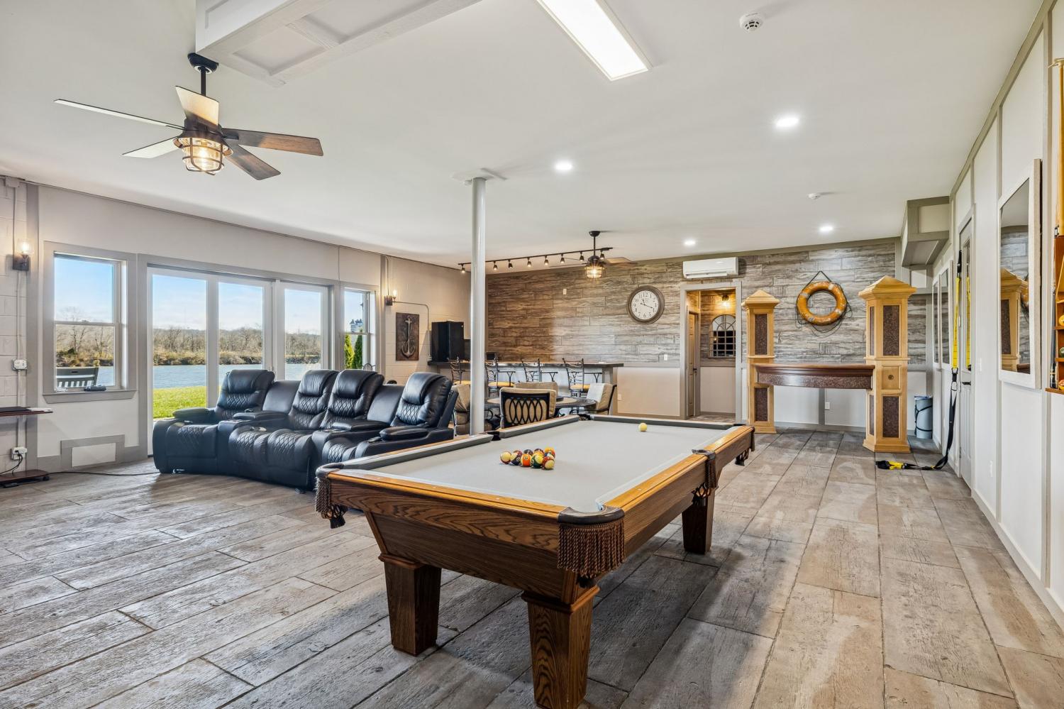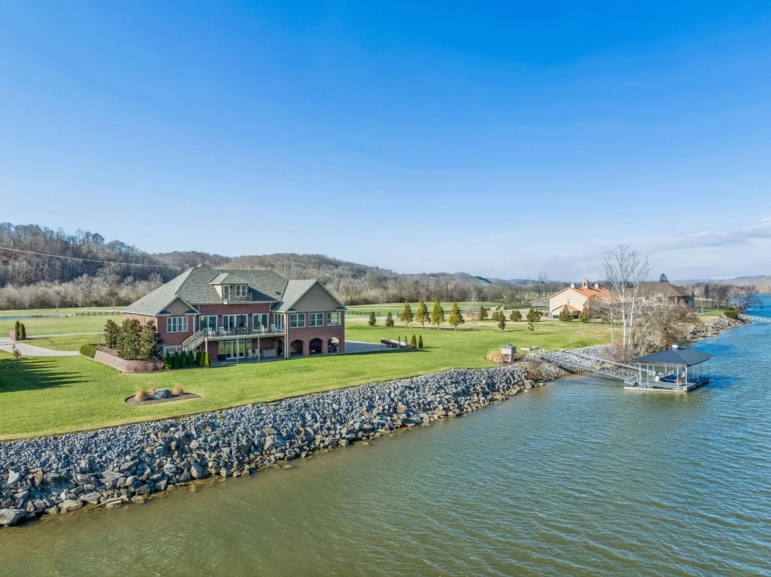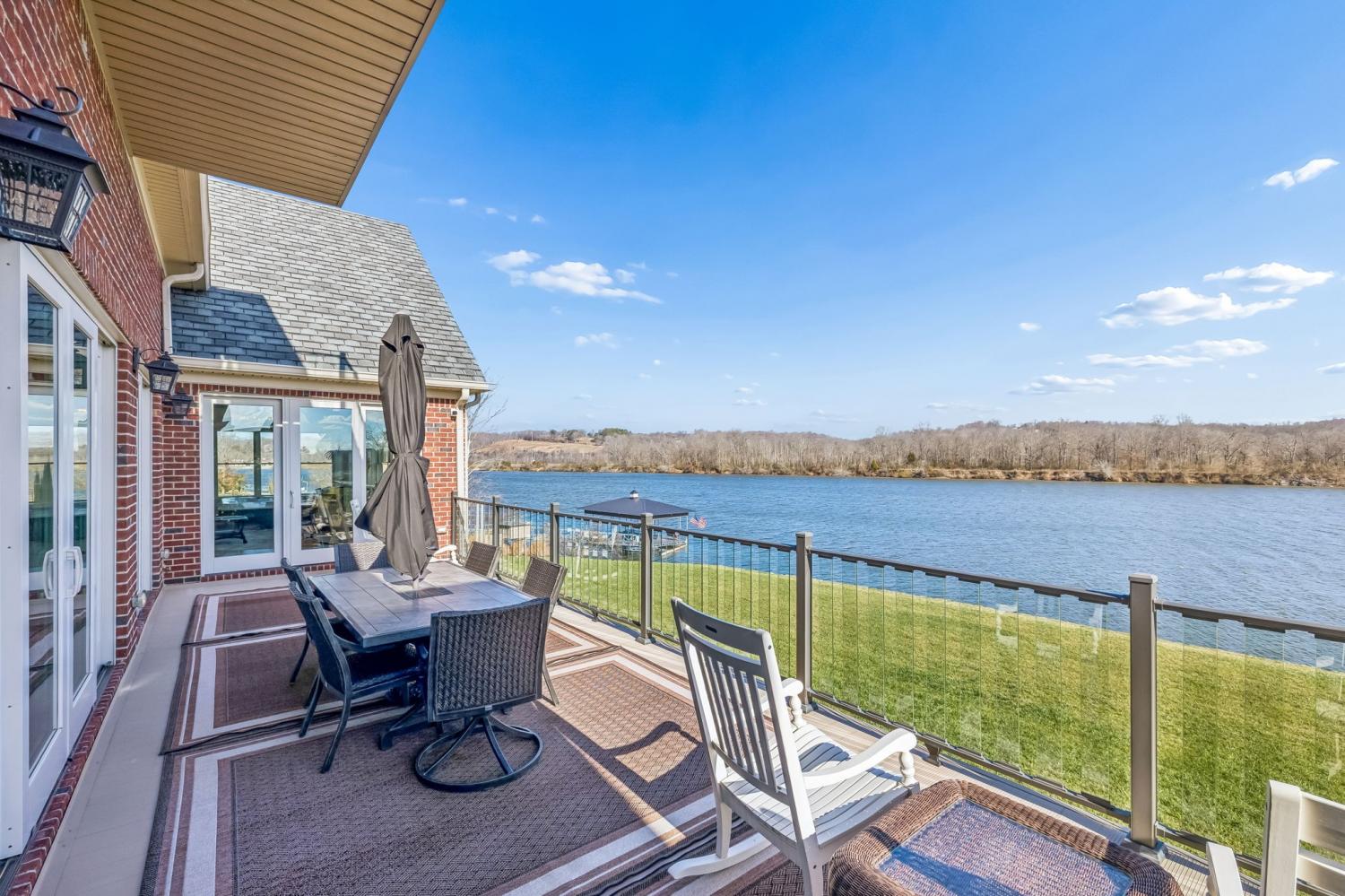 This exceptional custom riverfront estate offers timeless architecture, refined craftsmanship, & breathtaking water views from nearly every room. Set on a manicured lot w direct river access, the home features a stately brick & stone exterior, expansive patios & balconies, & a private covered dock perfect for boating, entertaining, or peaceful sunset evenings. The grand foyer welcomes you w arched double doors, gleaming hardwood floors, & elegant millwork throughout. The home seamlessly blends formal & casual living w a private office, elegant dining room, & an open-concept living area designed for both comfort & entertaining. The gourmet kitchen is a showpiece w custom cabinetry, premium appliances, oversized island, & intricate detailing, flowing effortlessly into the main living spaces. The primary suite is a true retreat, offering spa-inspired finishes, a luxurious bath, & a custom walk-in closet. Additional bedrooms & living areas provide ample space for family and guests. A dedicated fitness room, private elevator, & thoughtfully designed storage add both convenience & versatility. Designed to embrace the waterfront setting, the home’s sunroom w hot tub overlooks sweeping river views, creating a year-round oasis. Multiple outdoor living spaces, mature landscaping, and gently sloping grounds lead to the dock, making this property ideal for entertaining or quiet relaxation. Some of the other great features are a steel front door, Monogram kitchen appliances, Sub Zero Fridge, 8 person indoor jacuzzi, 4 person sauna, wood exterior ceilings, boat dock WITH LIFT, 8' interior doors, giant stocked pond with light/water fountain~4 BEDROOM SEPTIC~A rare opportunity to own a distinguished riverfront estate offering privacy, elegance, & unmatched views—this is luxury living at its finest and only 15 minutes from Briley Parkway and 25 minutes from Downtown Nashville and by BOAT only 15 minutes to my favorite BLUE MOON CAFE