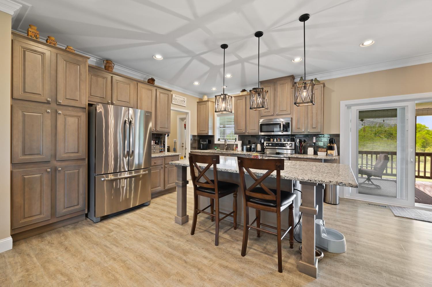 Hands down, this may be one of the coolest smart homes you’ll ever see. This meticulously maintained 3-bedroom, 2-bath home sits on 2 acres and is packed with custom upgrades and smart features you truly have to see in person to appreciate. Every inch of this home was thoughtfully upgraded. The home offers an open floor plan with 9’ ceilings, crown molding, and 8” baseboards throughout. The kitchen features granite countertops, raised panel cabinetry, a large island, and a double oven, making it ideal for entertaining and everyday living. The primary suite includes a custom vanity and tiled walk-in shower. Enjoy outdoor living on the covered back porch with TV hookup and surround sound wiring, overlooking a fully fenced backyard. The property also includes a 40×32 detached 3-car garage/shop, gardening shed, and storm shelter. Additional features include a smart Ecobee thermostat, continuous hot water recirculation system, automatic sprinkler system for flowerbeds, concrete curbing, and a whole-home generator outlet.