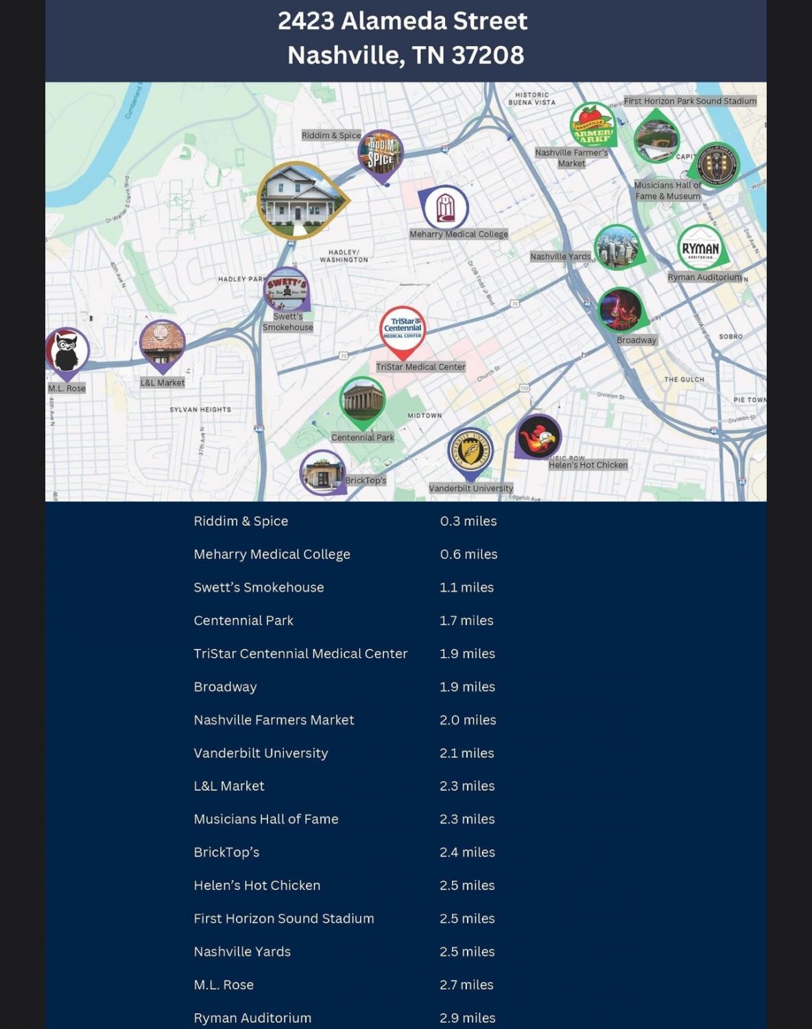 From Downtown Take Charlotte Ave To 28th Ave N. Turn Right Onto 28th Ave N Until Herman St. Turn Right Onto Herman St To 24th Ave N. Turn Left Onto 24th Ave N To Alameda St. Turn Left Onto Alameda St. Home will Be On Your Left @ 2423 Alameda St- Welcome!