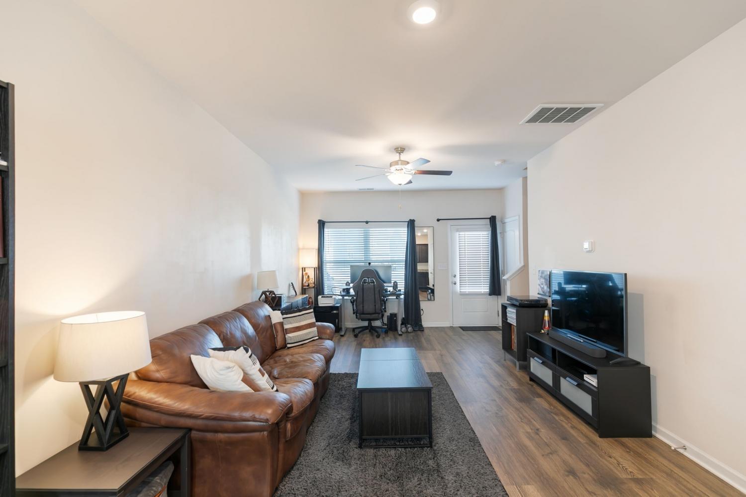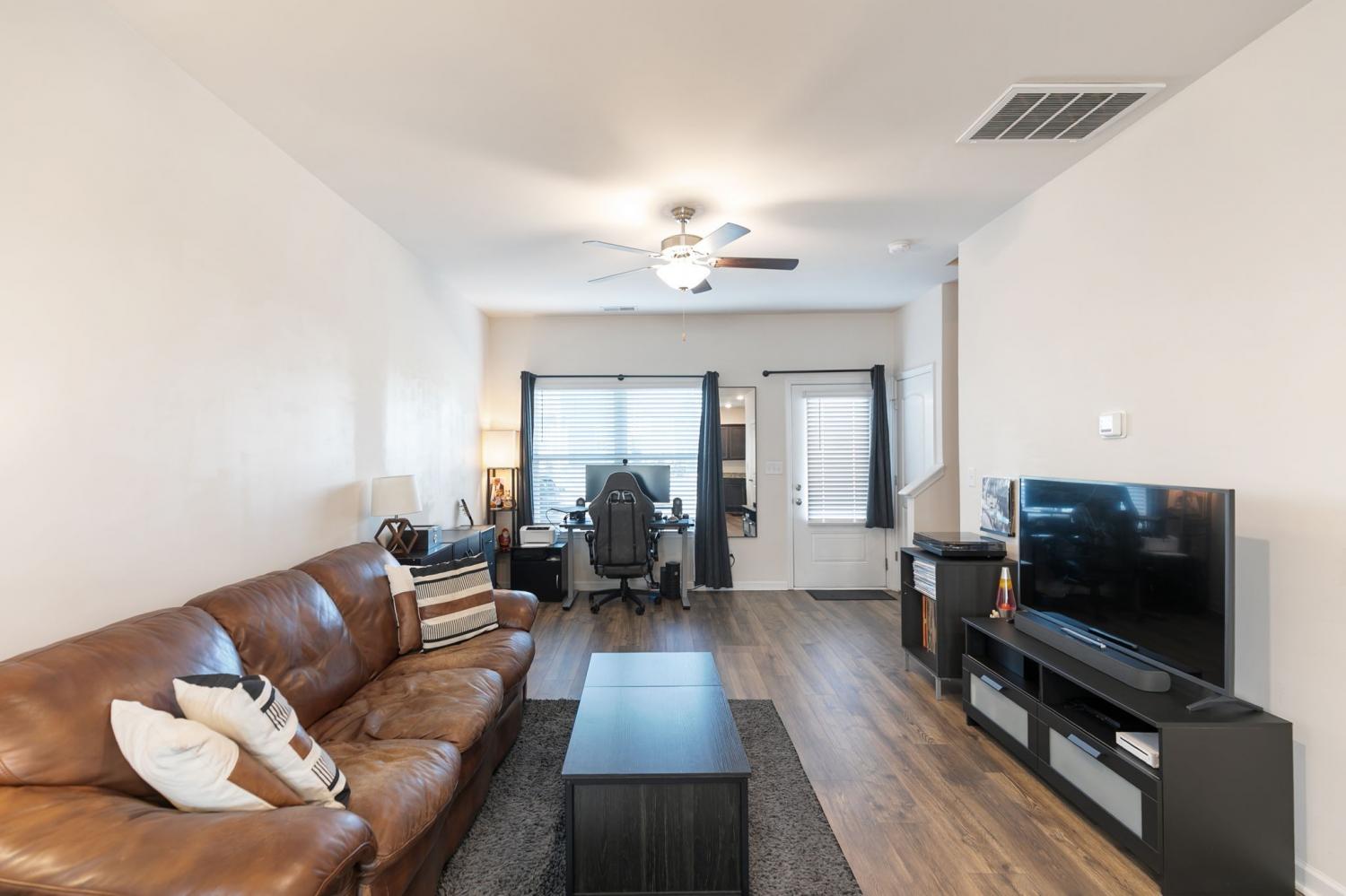 Come take a look at this beautiful 2 beds / 2.5 baths townhome. Step inside to an open-concept main level where the living room flows into the kitchen and dining area. The kitchen features granite countertops, luxury, wood-style flooring and energy-efficient, stainless steel appliances. Upstairs has two bedrooms, each with its own private full bathroom. Perfect sized private fenced-in backyard which provides the perfect place to unwind and relax. Furry friends will love it! This community offers quick access to shopping and dining. All kitchen appliances, washer and dryer will remain with the home.