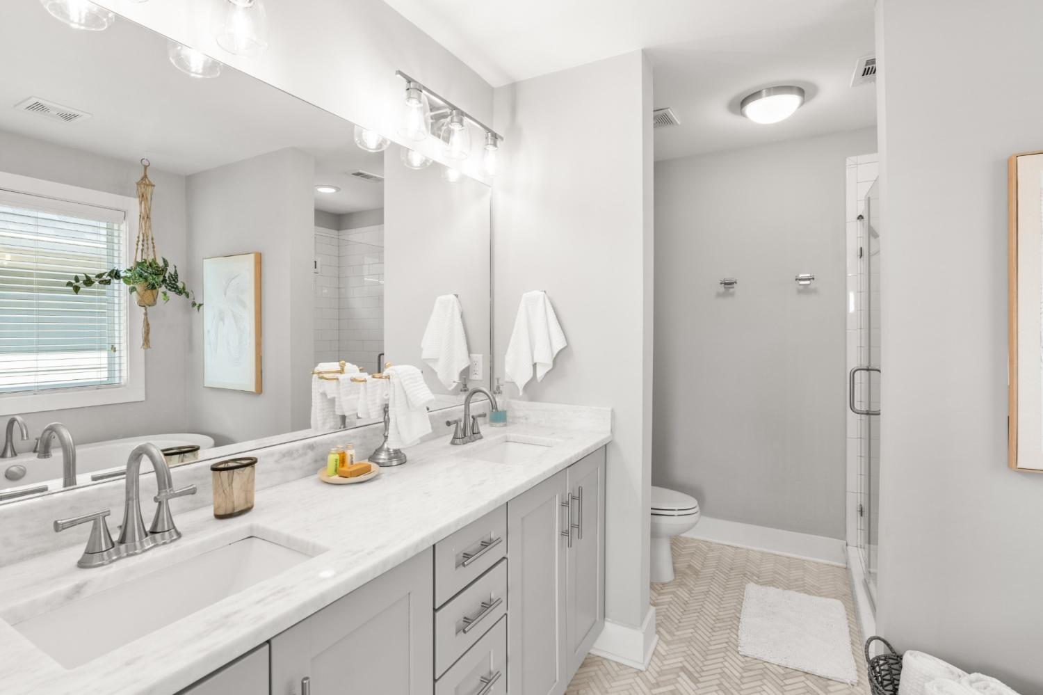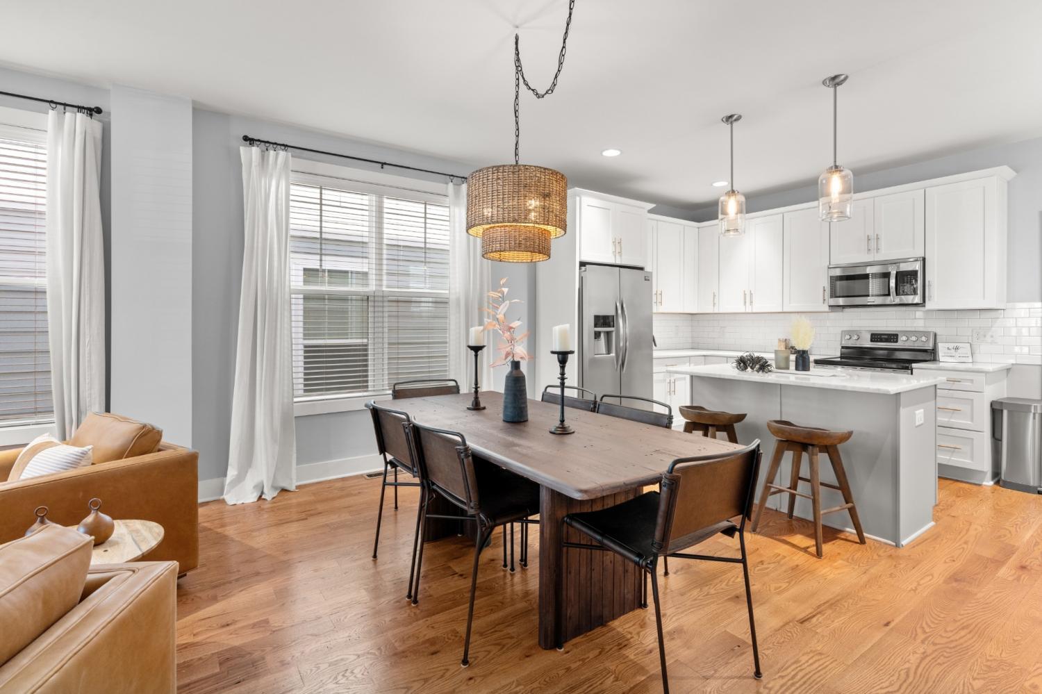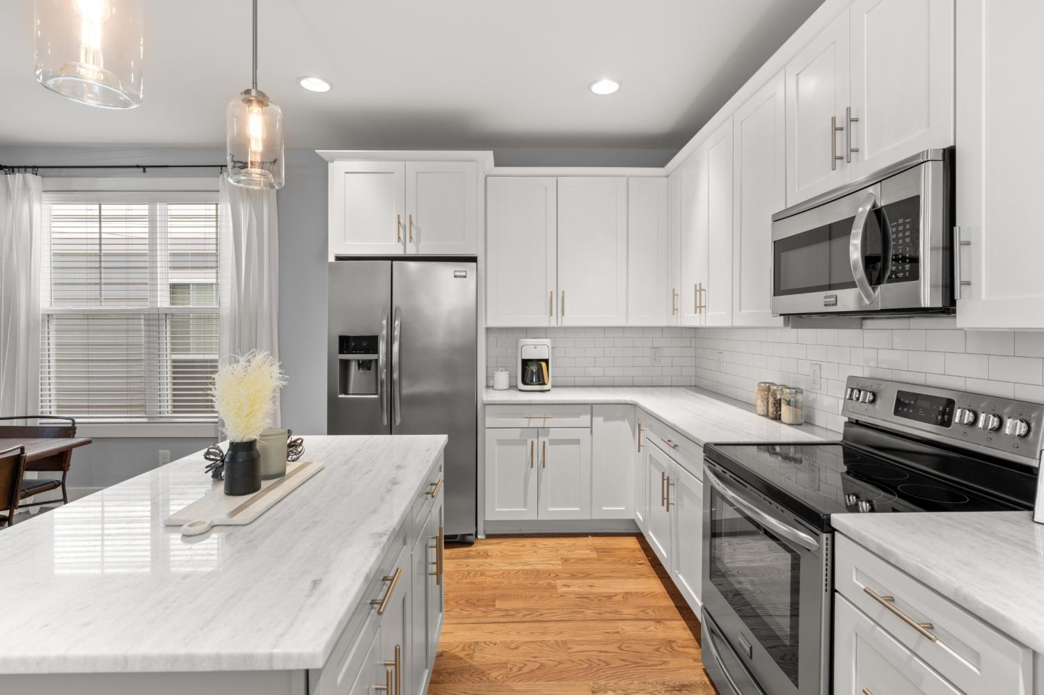 Welcome to Better-Than-New Construction in The Nations. This 4-bedroom, 3-bath home offers a flexible layout with two living areas, hardwood floors, marble countertops, and natural light throughout. A main-level bedroom functions perfectly as a guest suite, office, or second living space. The vaulted primary suite upstairs features a spa-like bath with double vanities, a walk-in shower, marble tile, and a soaking tub. Enjoy two covered porches, a white picket fence, and a two-car carport with alley access. Located just minutes from Nashville’s best restaurants, coffee shops, and Downtown.