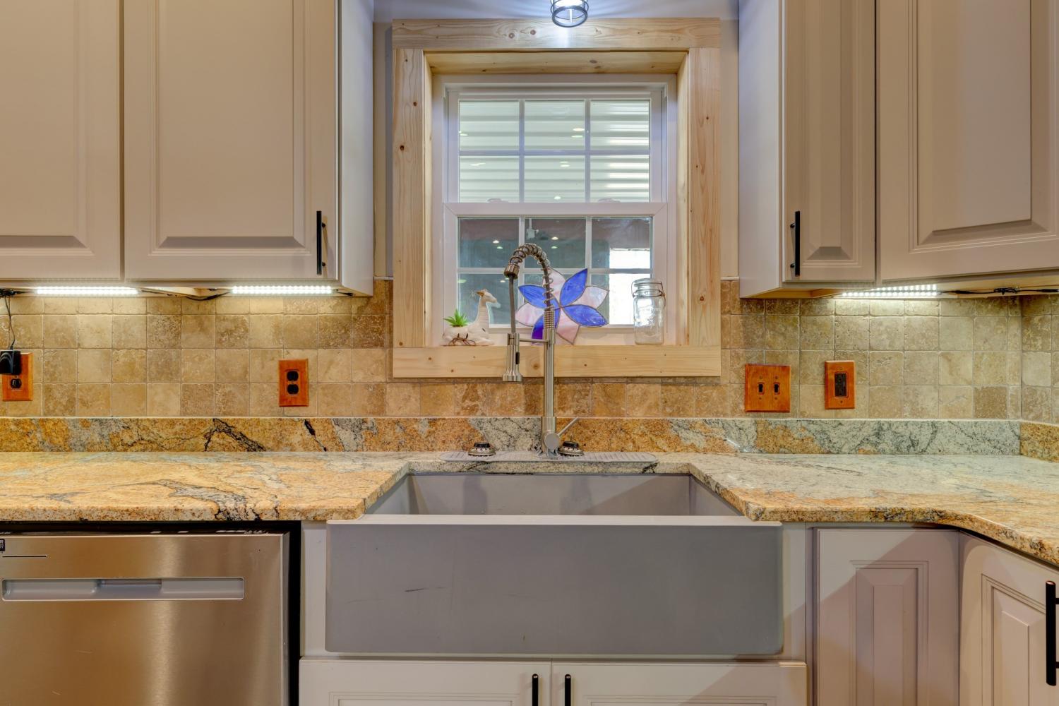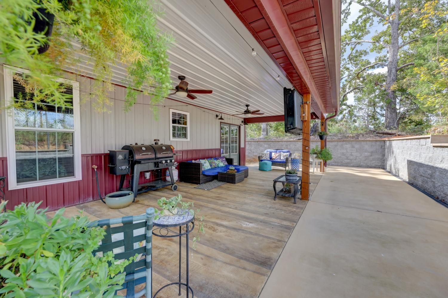 Welcome home to this breathtaking barndominium, where quality craftsmanship meets country serenity. Nestled on 4 private acres, this corrugated metal-constructed home with a durable metal roof (complete with leaf guard) was built with exceptional attention to detail and energy efficiency in mind—featuring spray foam insulation throughout the entire structure, 4” to 6” thick, keeping the home comfortable year-round. Step through the grand 8-foot solid pecan wood double doors into a bright, open-concept living space. Beautiful floors flow throughout, leading to a spectacular vented propane fireplace—the perfect centerpiece for cozy evenings. The custom kitchen is a chef’s dream, featuring marble countertops, a farmhouse sink, custom cabinetry, stainless steel appliances and a spacious open pantry. The primary suite is a peaceful retreat, wrapped in warm pine wood walls with solid wood blinds that convey. Continue into the luxurious primary bath, where you’ll find a clawfoot tub, custom cabinetry and a gorgeous walk-in shower—a true spa-like escape. The primary closet offers generous space and includes a walk-in storm shelter certified for Category 4 winds and equipped with an automatic light. Once you’ve made it through the rest of this beauty and all that it has to offer, step out back through the double French doors to your private oasis. Enjoy the covered back patio with cement overlay floors designed to look like wood, dual ceiling fans, a designated space pre-wired for a hot tub and a fire pit area — all with no view of neighbors for ultimate privacy. Every inch of this home was thoughtfully designed, from the foam-insulated garage to the portable generator hookup outside the property, ensuring comfort and peace of mind in any season. If you’ve been searching for the perfect mix of rustic elegance, privacy and practicality—this one-of-a-kind barndominium is it.