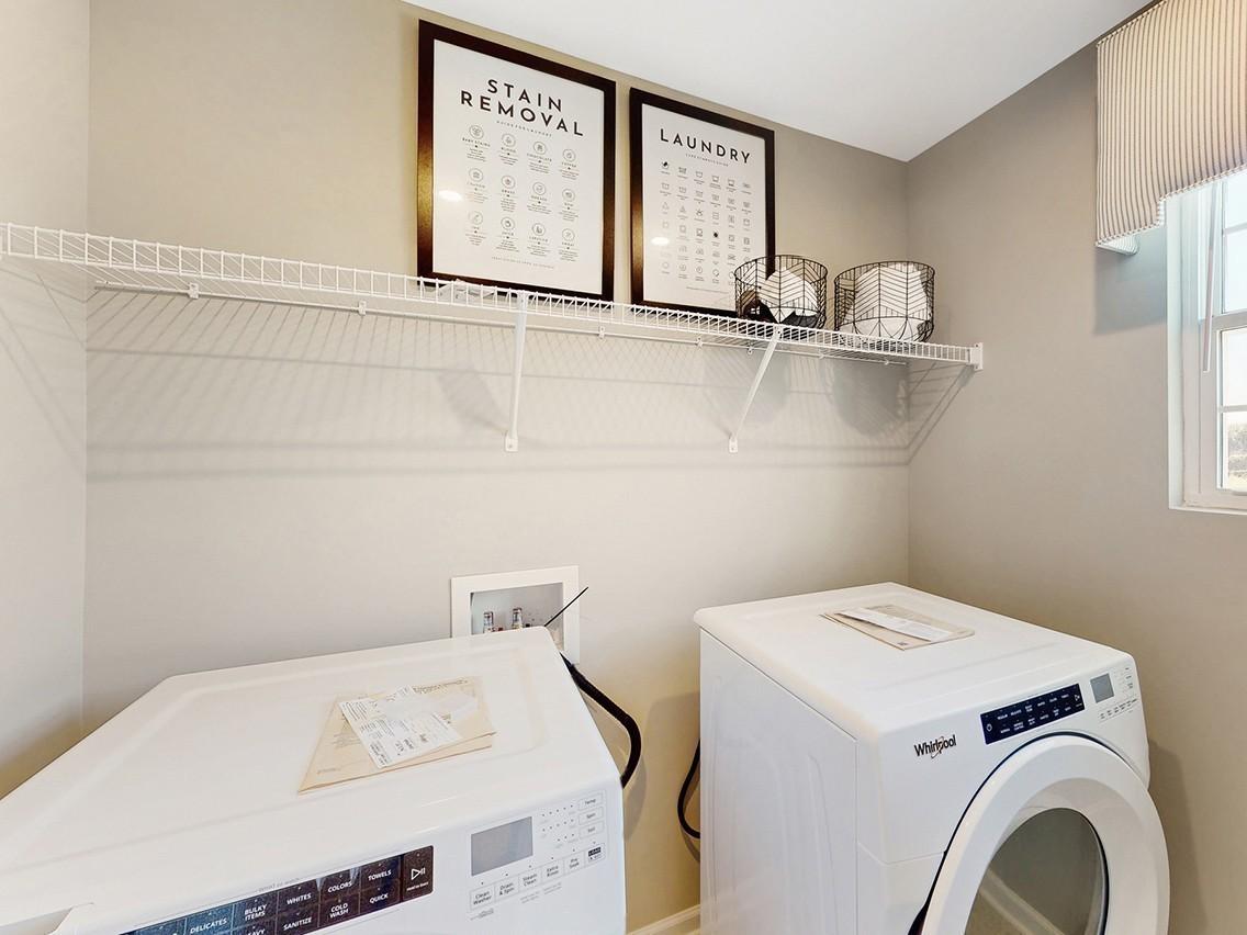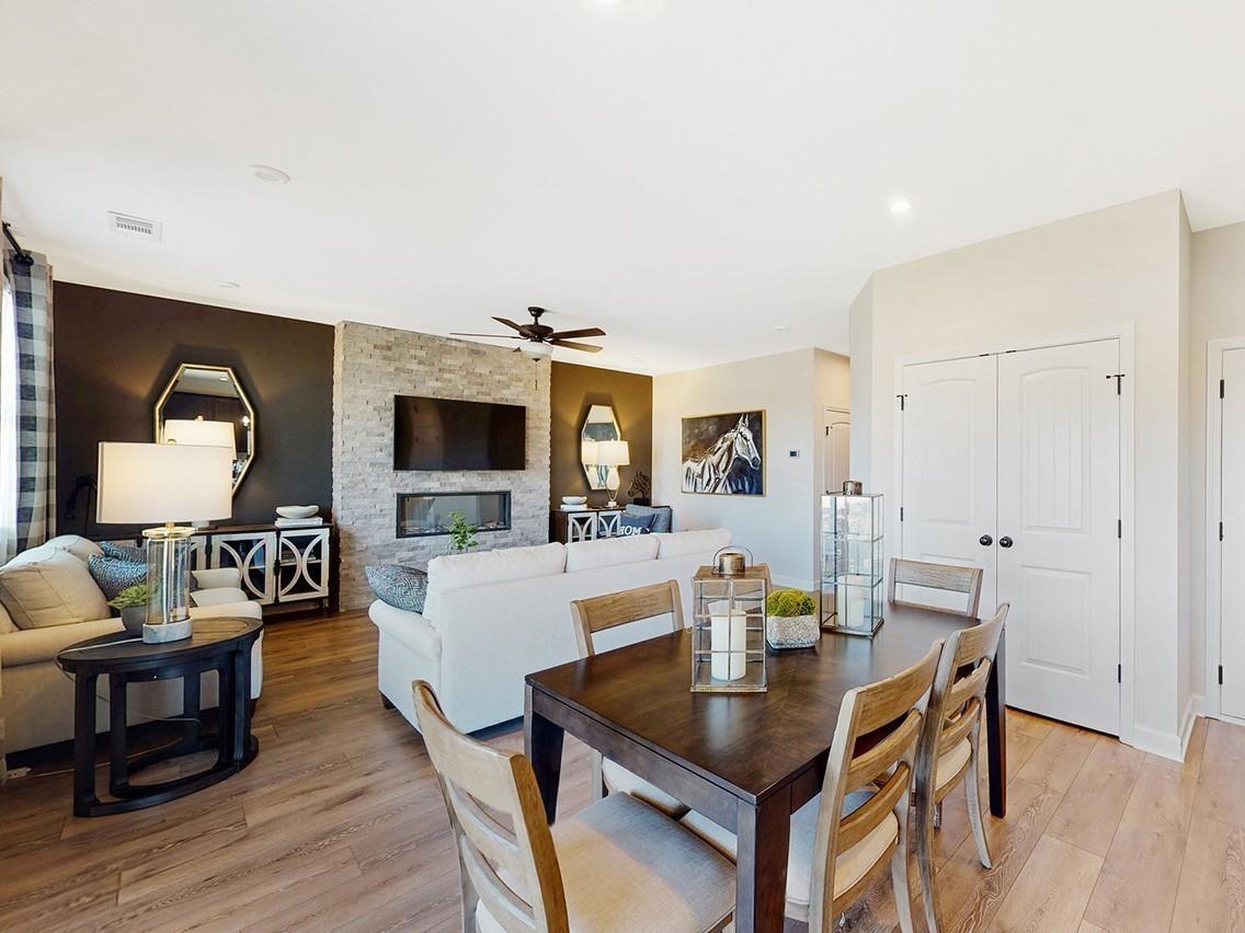 Designed with everyday living and entertaining in mind, this Chastain plan at Canebrake at Hickory Hills in Old Hickory, TN offers a bright, open-concept main level with elevated design details throughout. The alternate kitchen features light gray cabinetry and a center island that overlooks the dining area and great room, making it easy to cook, gather, or host with ease. A shiplap-accented electric fireplace adds warmth and character, while the covered patio just off the dining space extends your living area outdoors for relaxed mornings or evening downtime. Upstairs, a flexible loft provides space for a home office, media room, or play area, alongside two secondary bedrooms. The private primary suite includes a spacious bedroom, walk-in closet, and en-suite bath, creating a comfortable retreat at the end of the day. Wrought iron spindle stairs and wood tread stairs add a refined, designer finish that ties the home together.