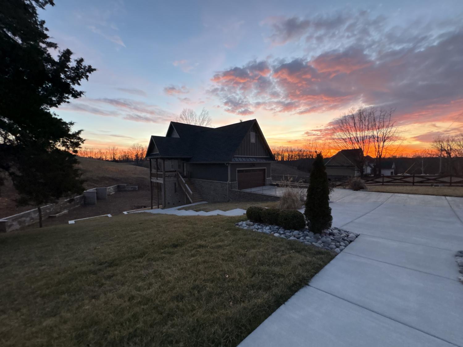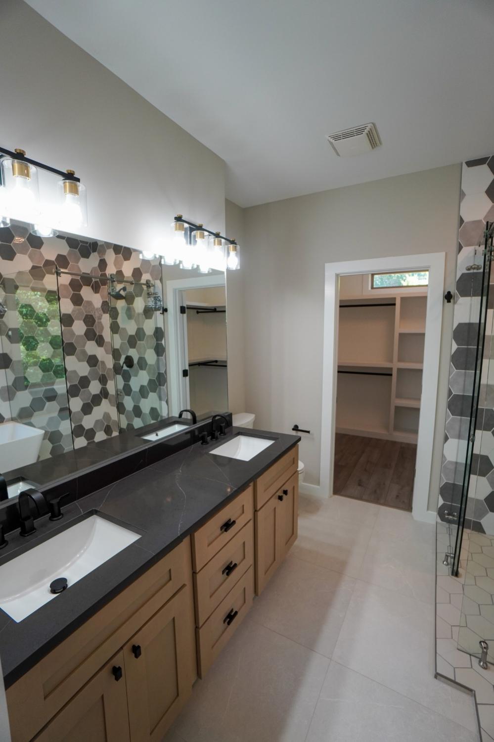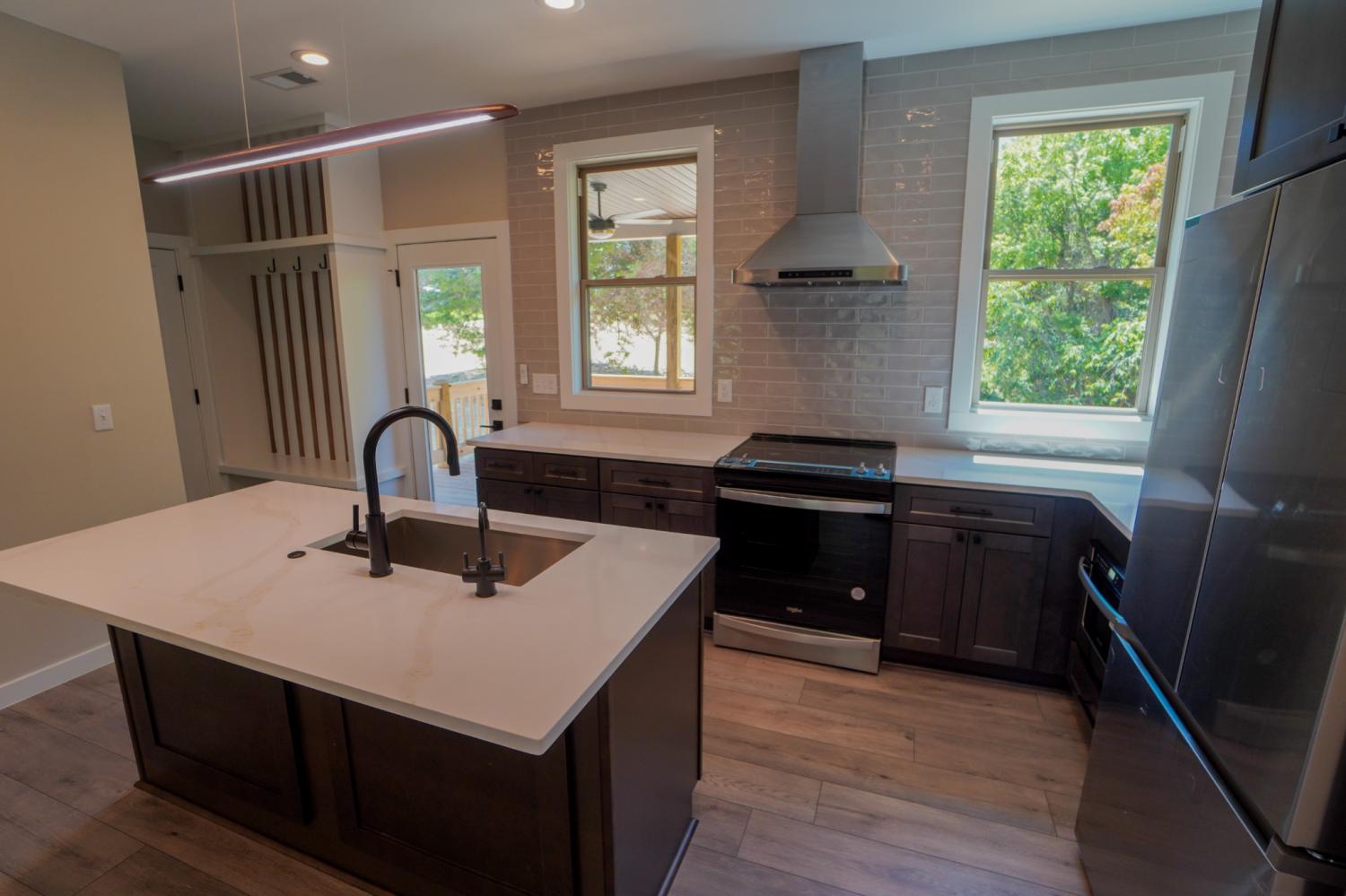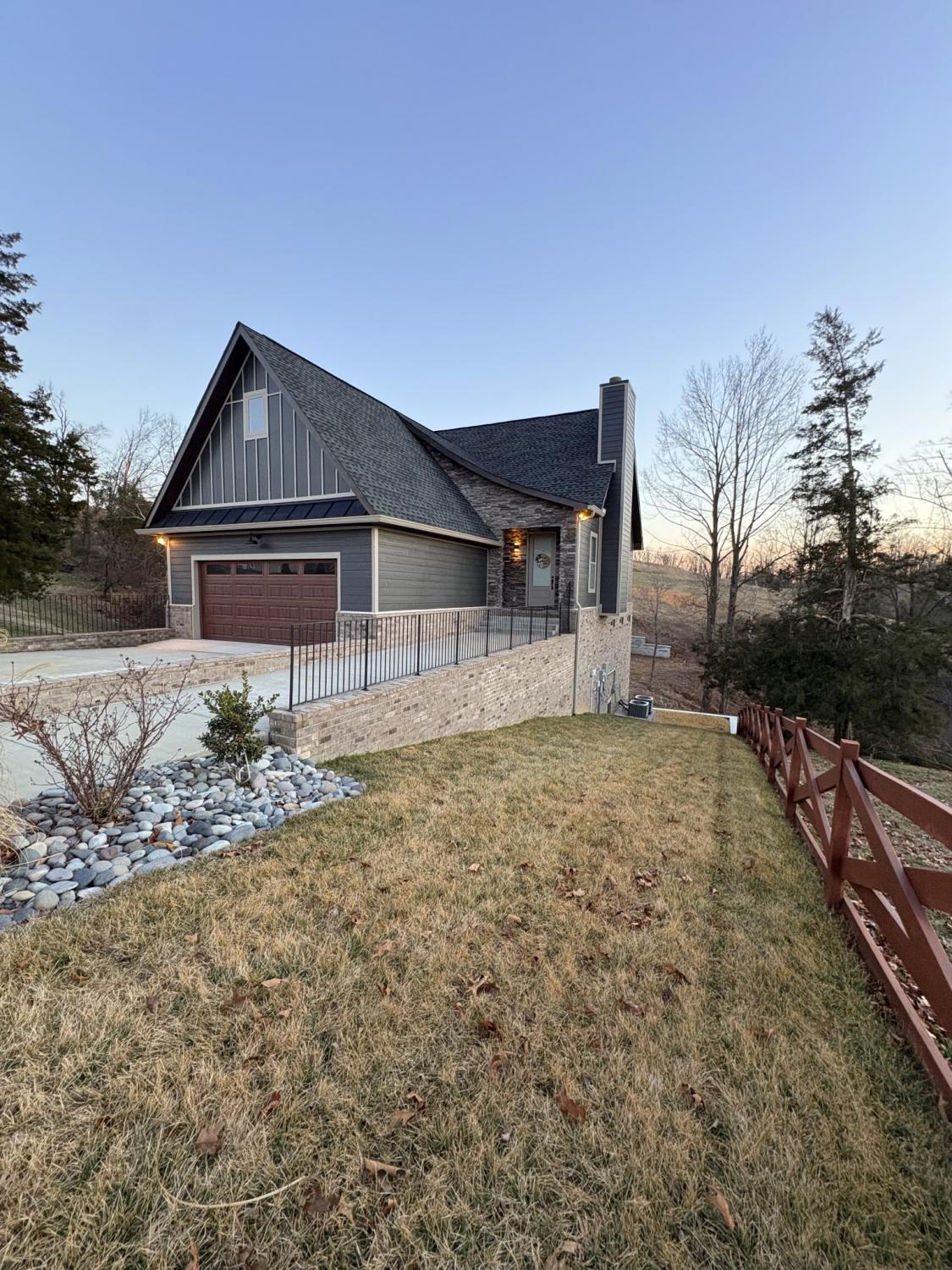 Built in 2024, this beautifully designed home offers modern style and peaceful surroundings. The open-concept layout features soaring ceilings, wide-plank flooring, and a stunning fireplace with custom vertical accent detail. The gourmet kitchen showcases a large quartz island, stainless steel appliances, subway tile backsplash, and sleek cabinetry—perfect for everyday living and entertaining. The primary suite includes a spa-inspired bath with dual vanities, bold hexagon tile accents, matte black fixtures, and a glass walk-in shower. Enjoy the elevated covered deck with ceiling fan and serene wooded views. Outside, extensive upgrades have already been completed for you. Fresh sod creates a beautiful green yard, complemented by a newly installed irrigation system. The property also features expanded driveway parking plus a large gravel lot for additional parking. Fencing has been added around the lot, along with new steps to both decks, backyard stairs, and a retaining wall. With a timeless blend of brick and modern siding and a spacious two-car garage, home combines comfort, style, and thoughtful improvements throughout. Photos taken in 2024. Updated photos of exterior of the home are from 2026.