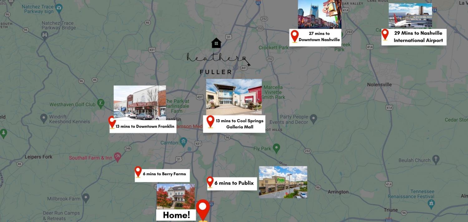 From downtown Nashville, take I-65S to Goose Creek Bypass. Turn right onto Goose Creek Bypass. Turn left onto US-441 S. Turn left into Stream Valley (Bushnell Farm Lane). Turn left onto Narrow Ford Lane. Home is on the left.