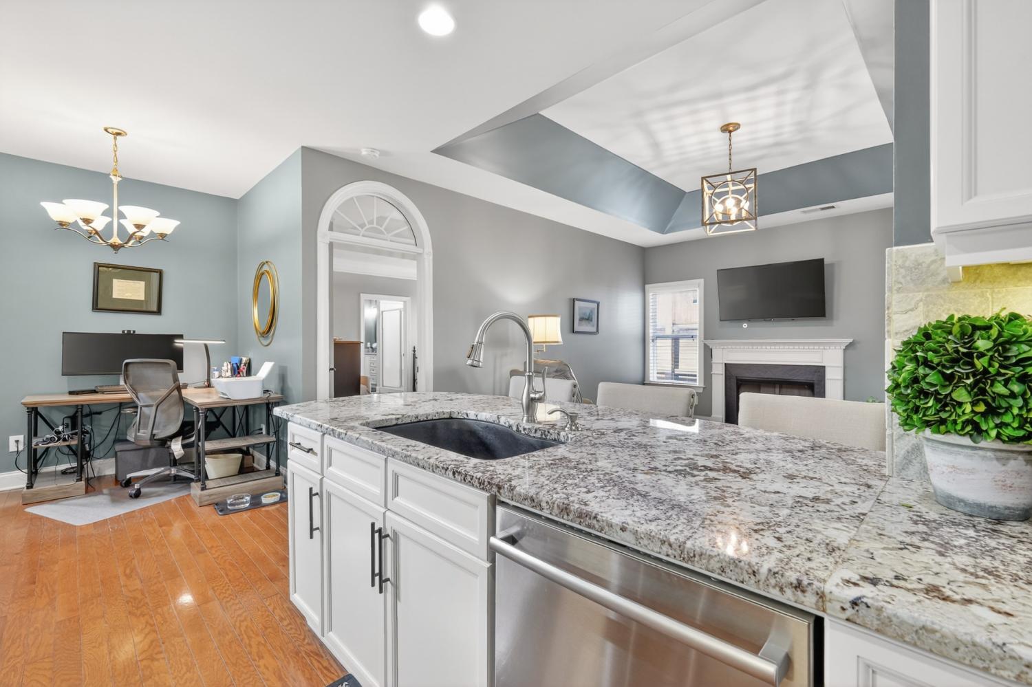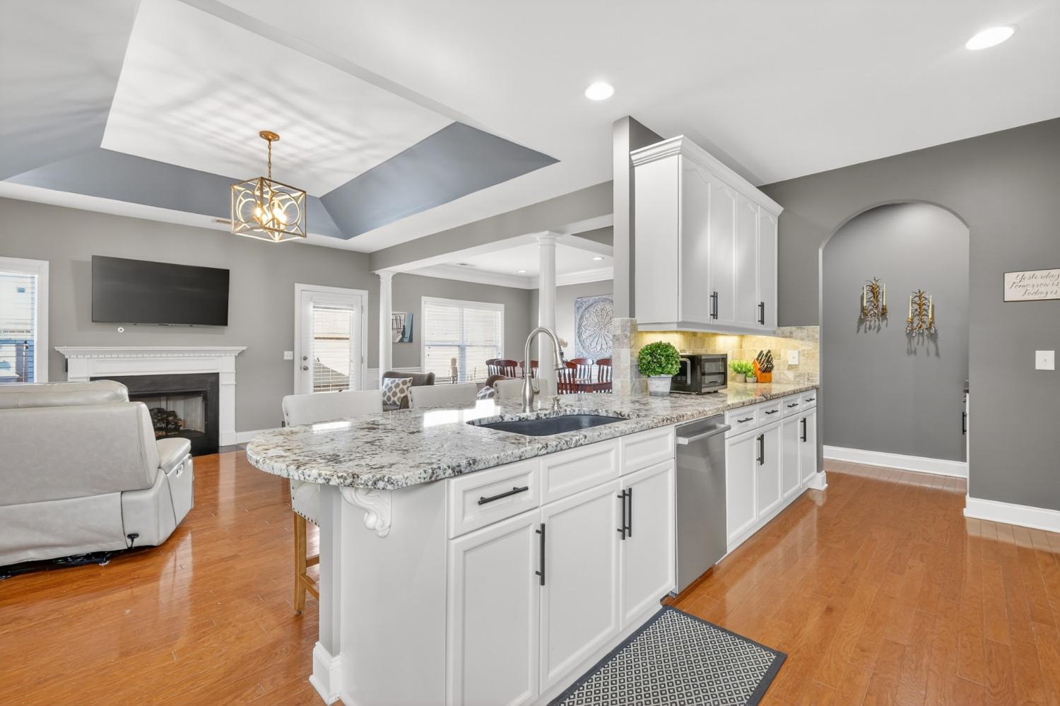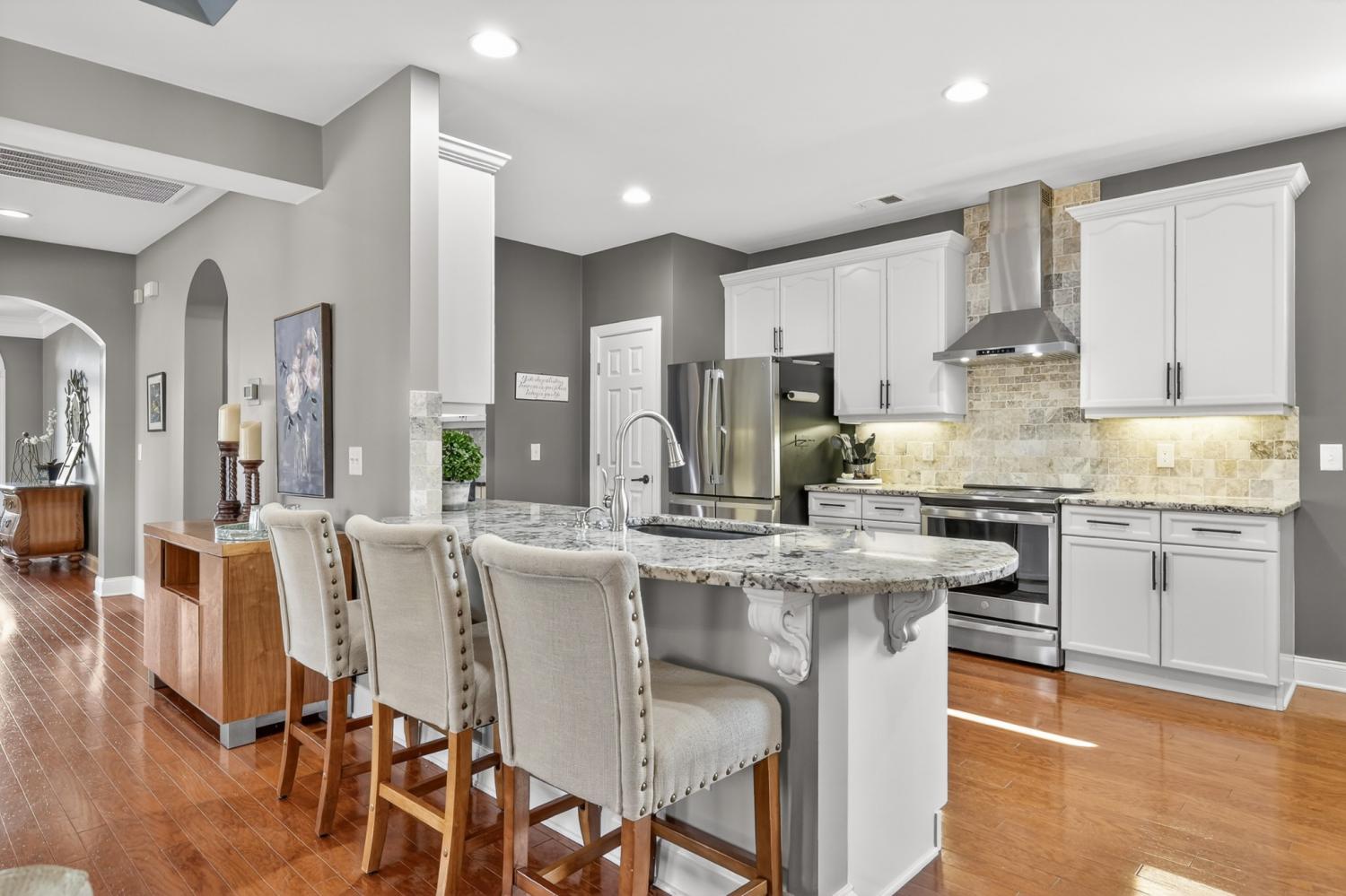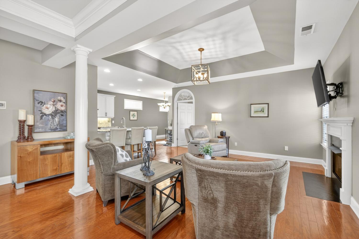 Refined one-story living in the gated Village of Providence, positioned on a premium corner lot directly across from a community park. This beautifully maintained 1,990 sq ft brick home blends timeless design, modern upgrades, and exceptional convenience. Hardwood flooring flows through the main living areas into a bright, elegant kitchen featuring white cabinetry, granite countertops, stainless steel appliances, a new refrigerator and stove, and a Bosch dishwasher. The home offers two spacious bedrooms and two beautifully updated bathrooms with honed quartz countertops, new lighting, and modern fixtures, while the owner’s suite is enhanced by a custom closet shelving system. The two gas fireplaces w/ remotes create inviting living spaces ideal for both comfort and entertaining. Additional highlights include a 2024 water heater and an oversized garage with space for a workshop and storage. HOA-maintained lawn care provides true low-maintenance living. The location is exceptional: just steps from Providence Mall, approximately one mile to I-40, and minutes from Nashville International Airport and everyday conveniences. This home offers a rare blend of privacy, green space, elegance, and accessibility in one of Mt. Juliet’s most desirable gated communities.