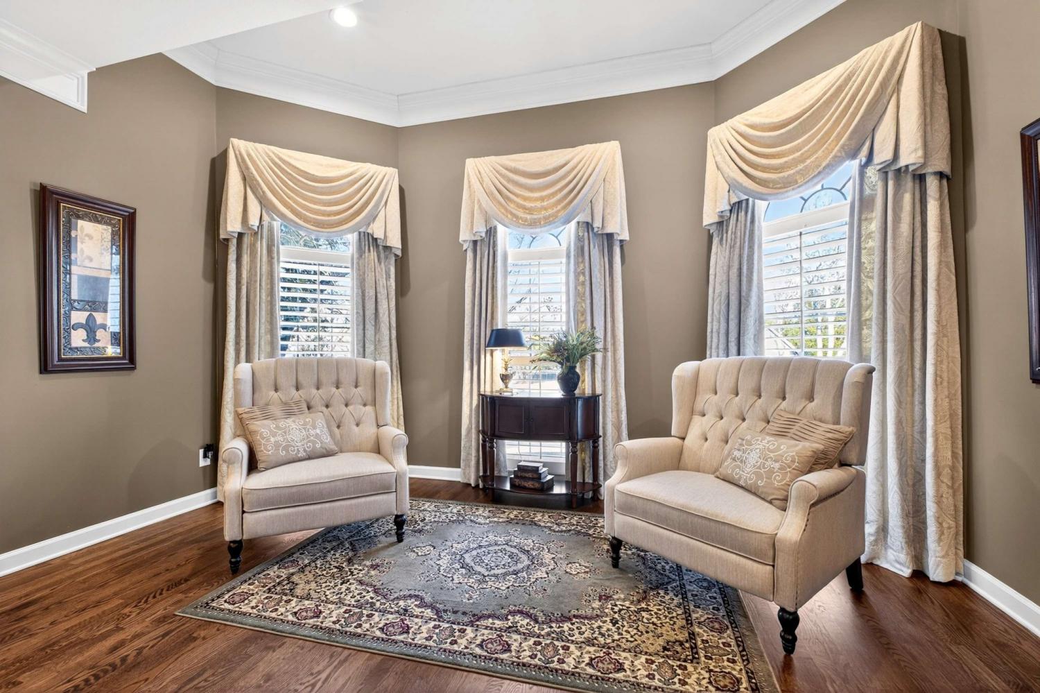 Set on almost half an acre with beautiful landscaping & towering trees, this elegantly updated home blends high-end finishes with effortless comfort in one of the area's most desirable locations! Step into a grand 2 story living room with high ceilings & fresh décor, flowing across newly sanded & stained hardwoods after removing all downstairs carpet & replacing every lower-level floor with hardwood, plus new flooring in the kitchen, laundry room, & both downstairs baths. The fully remodeled eat-in kitchen features a center island, granite counters, customized cabinetry, & all new appliances from Ferguson's, while the remodeled bathrooms showcase hand-hammered copper sinks & all new plumbing fixtures, including a stunning master bath transformation. The main floor offers a spacious master suite with two walk-in closets, plus an additional bedroom with its own full bath. Upstairs includes two bedrooms, a full bath & half bath, & brand-new carpet, along with a large bonus room over the garage with its own half bath. Major upgrades include a new roof, fully encapsulated crawlspace, gutter filters, newer heating & air units, a newer water heater, replaced smoke & carbon monoxide detectors, custom drapes, full interior repaint, solid wood shutters on all windows, all new exterior wall lighting, & redesigned exterior accent lighting with brass fixtures & underground wiring installed by TN Lighting. The attached side-entry 2 car garage has been rebuilt with added outlets, fluorescent lighting, & fresh paint. Outside, enjoy a lush yard supported by a 10-station irrigation system fed by its own well, along with regular professional servicing for HVAC, plumbing, electrical, pest control, seeding, & lawn fertilizing. A spacious 2-level patio completes this inviting outdoor space, offering the perfect setting for grilling & relaxation.