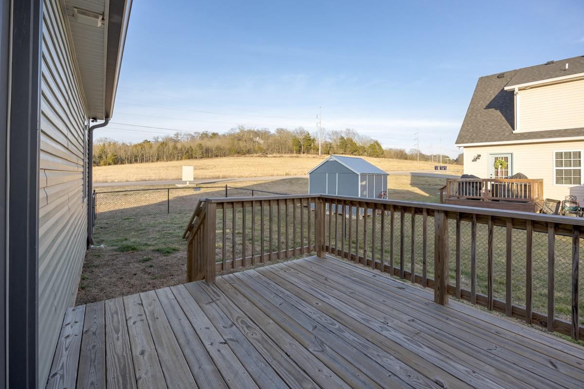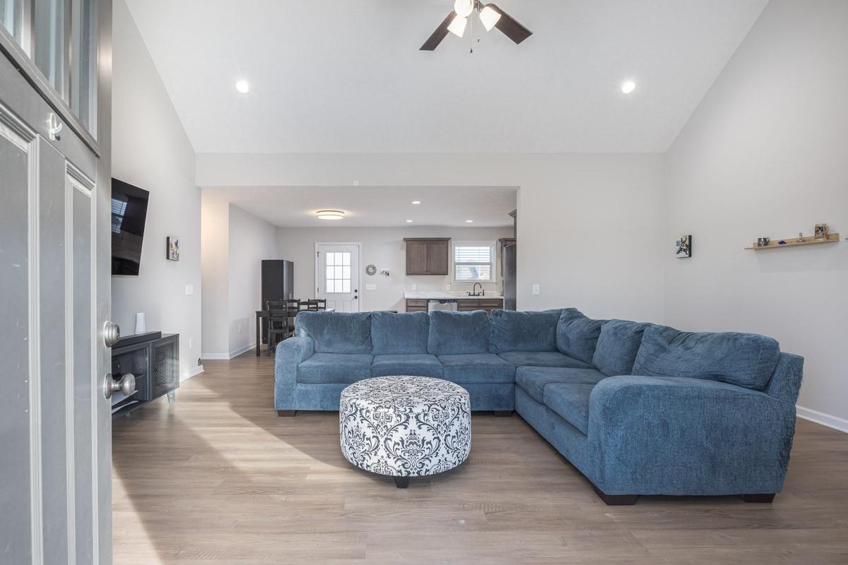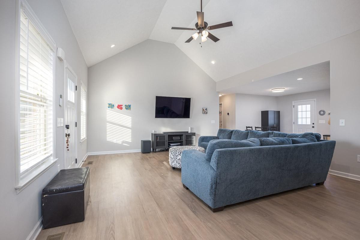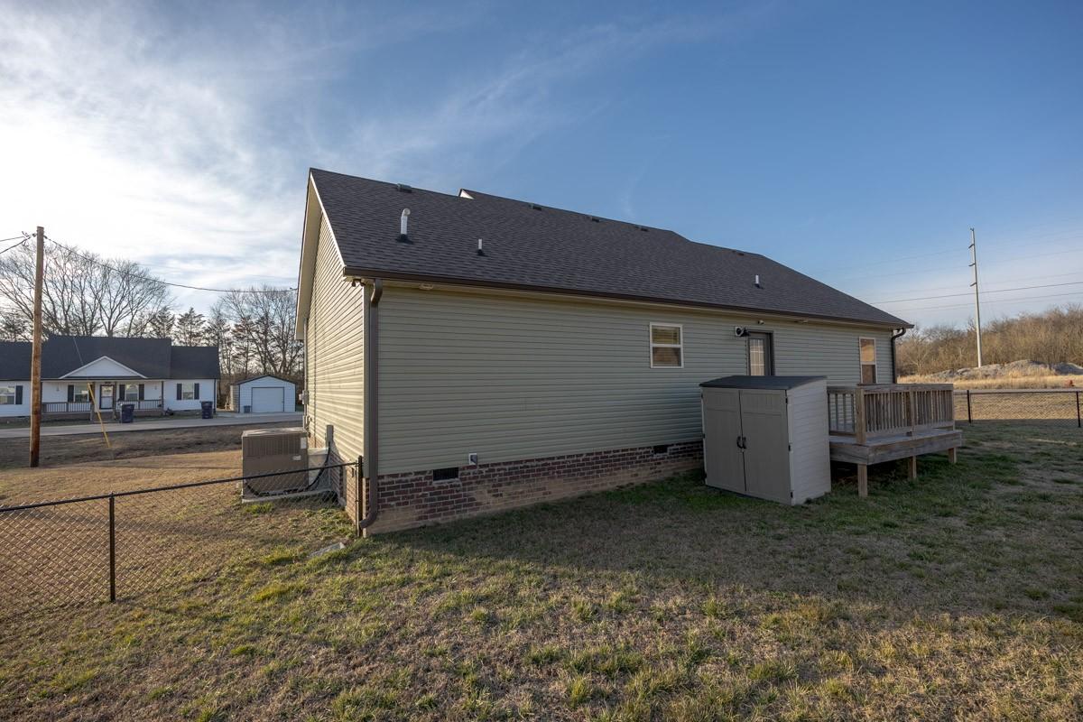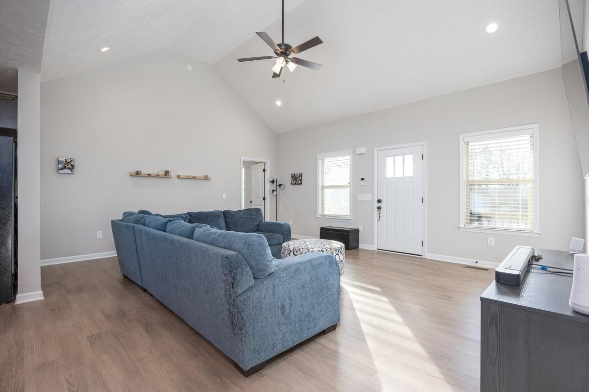 Welcome home to this open & airy floor plan featuring cathedral ceilings and a stunning kitchen complete w/ mocha cabinetry, oil rubbed bronze hardware and SS appliances - including the refrigerator. The spacious primary suite offers a beautiful tray ceiling, full bath w/ double vanities and an oversized 6x12 walk-in closet. The laundry room includes custom shelving and the washer and dryer will remain. All closets are outfitted with custom wooden shelving and ceiling fans enhance every bedroom and living area, along with 2" blinds throughout. Situated on approximately one-third of an acre, this property offers plenty of space to spread out and enjoy. Relax on the charming rocking-chair front porch in this quaint community with no drive through traffic. The fenced backyard is perfect for kids or pets and features a nice deck for outdoor enjoyment. The storage building remains. Ideal for remote work, the home is equipped with TDS high-speed fiber internet.