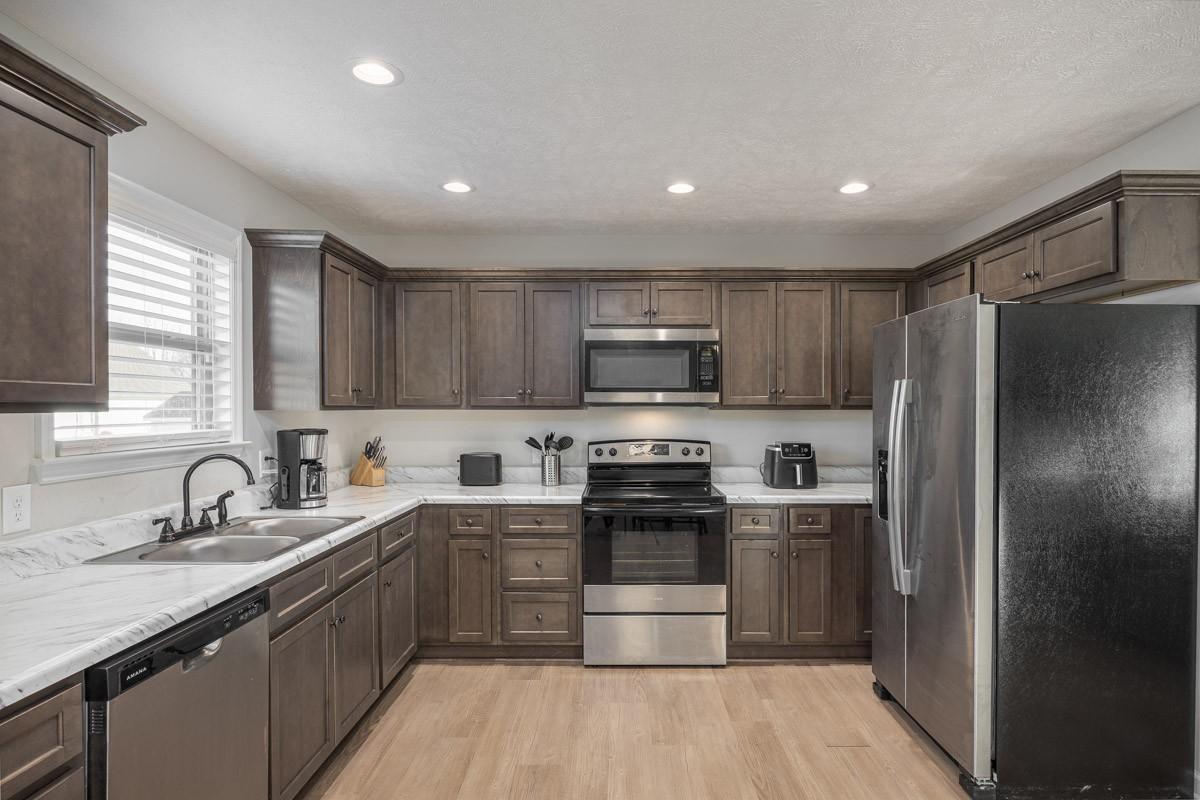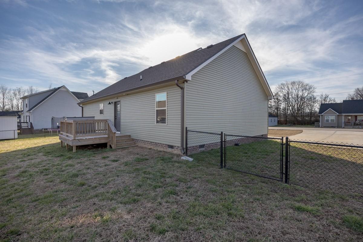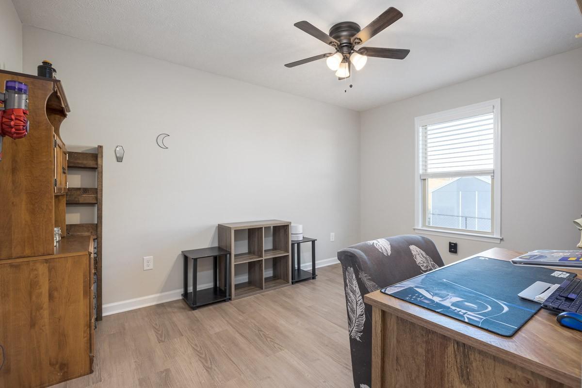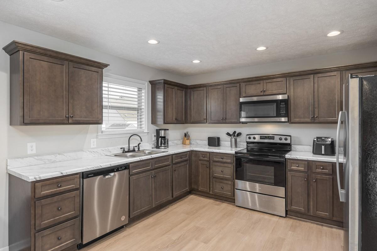Welcome home to this open & airy floor plan featuring cathedral ceilings and a stunning kitchen complete w/ mocha cabinetry, oil rubbed bronze hardware and SS appliances - including the refrigerator. The spacious primary suite offers a beautiful tray ceiling, full bath w/ double vanities and an oversized 6x12 walk-in closet. The laundry room includes custom shelving and the washer and dryer will remain. All closets are outfitted with custom wooden shelving and ceiling fans enhance every bedroom and living area, along with 2" blinds throughout. Situated on approximately one-third of an acre, this property offers plenty of space to spread out and enjoy. Relax on the charming rocking-chair front porch in this quaint community with no drive through traffic. The fenced backyard is perfect for kids or pets and features a nice deck for outdoor enjoyment. The storage building remains. Ideal for remote work, the home is equipped with TDS high-speed fiber internet.