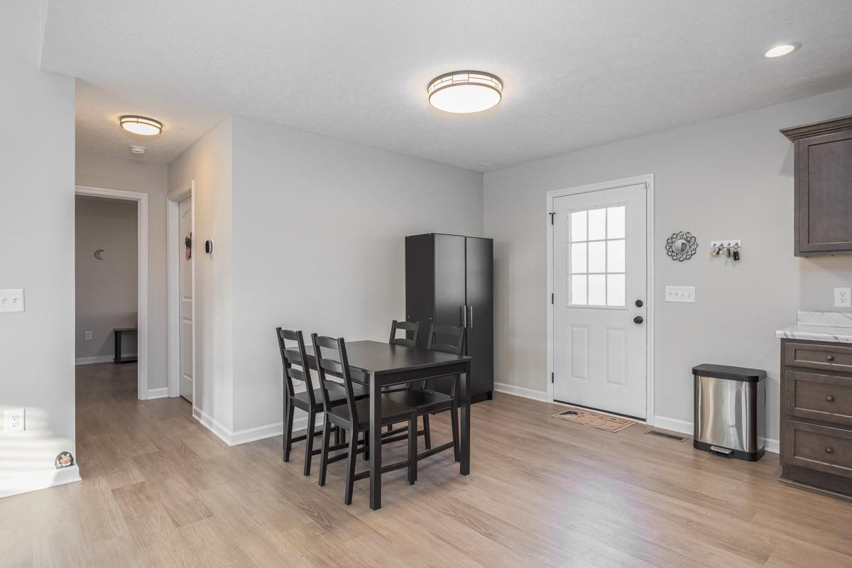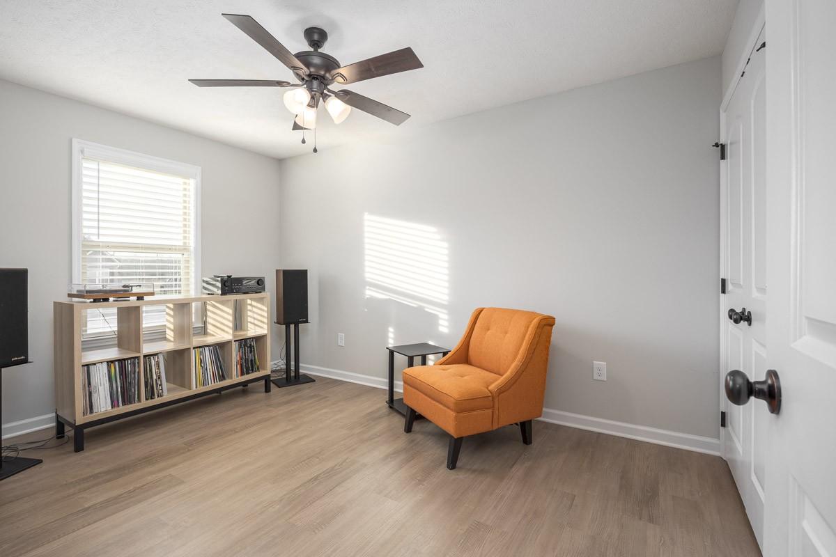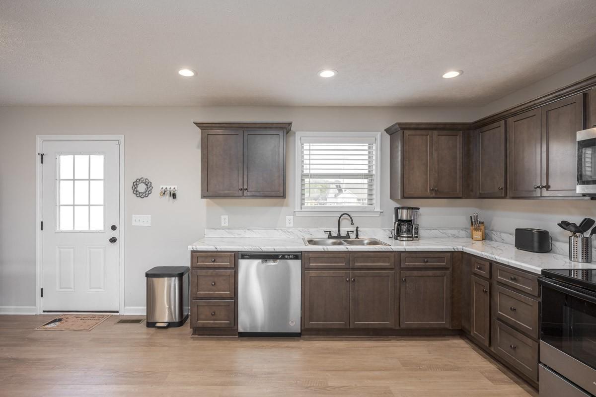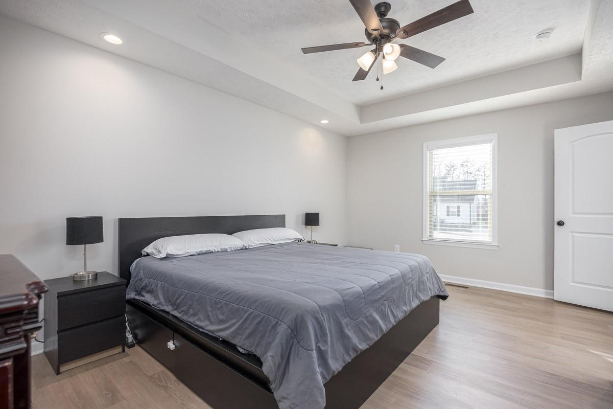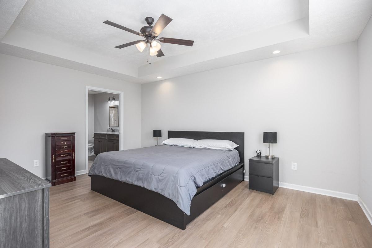 Welcome home to this open & airy floor plan featuring cathedral ceilings and a stunning kitchen complete w/ mocha cabinetry, oil rubbed bronze hardware and SS appliances - including the refrigerator. The spacious primary suite offers a beautiful tray ceiling, full bath w/ double vanities and an oversized 6x12 walk-in closet. The laundry room includes custom shelving and the washer and dryer will remain. All closets are outfitted with custom wooden shelving and ceiling fans enhance every bedroom and living area, along with 2" blinds throughout. Situated on approximately one-third of an acre, this property offers plenty of space to spread out and enjoy. Relax on the charming rocking-chair front porch in this quaint community with no drive through traffic. The fenced backyard is perfect for kids or pets and features a nice deck for outdoor enjoyment. The storage building remains. Ideal for remote work, the home is equipped with TDS high-speed fiber internet.