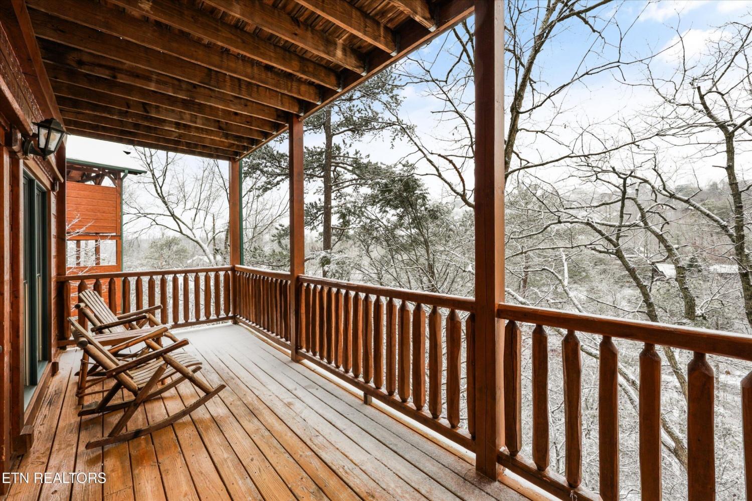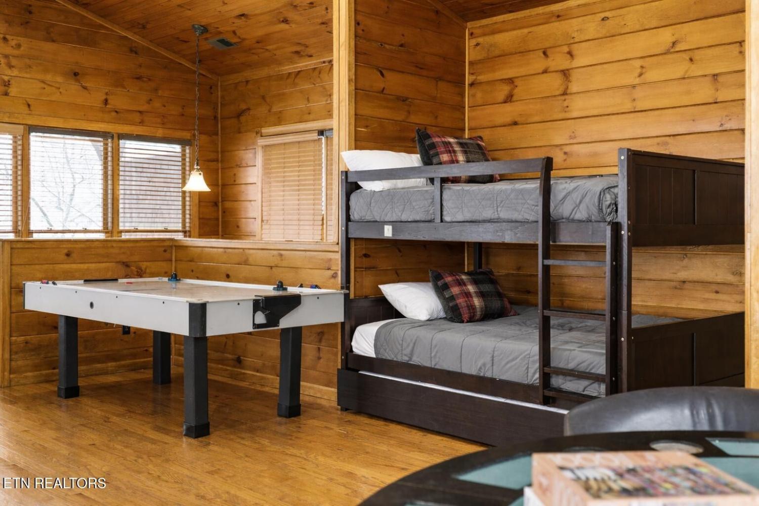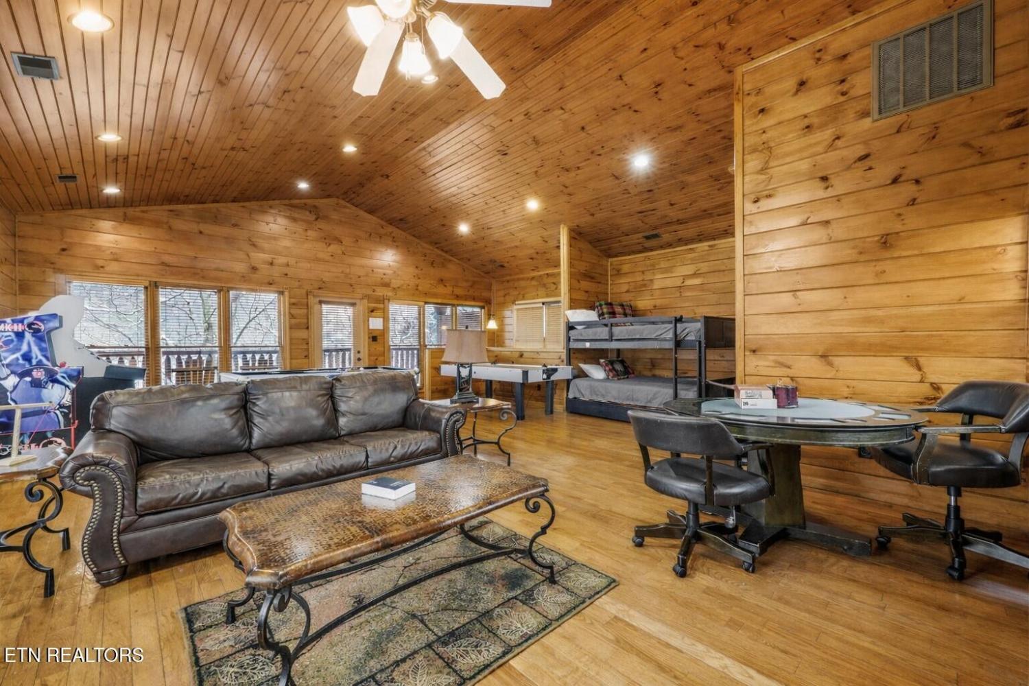 Turnkey luxury investment opportunity in the heart of the Smoky Mountains! Located inside the highly sought-after Gatlinburg Falls Resort, this fully furnished log cabin is the perfect short-term rental, second home, or mountain getaway already set up and ready to generate income from day one. Designed with guests in mind, the main level features an inviting open-concept floorplan with a fully equipped kitchen, spacious dining area, and comfortable living room centered around a cozy gas log fireplace which is perfect for relaxing after a day exploring the mountains. This level also includes a large private bedroom with its own ensuite bathroom, offering convenience and privacy for main-level guests. The lower level is built for comfort and occupancy, housing two additional oversized bedrooms each with their own ensuite bathrooms creating the ideal layout for hosting multiple people or group rentals. Head upstairs to the top level where entertainment takes center stage. This loft/game room space is designed for fun and memory-making, complete with ample room for games, lounging, and guest enjoyment, plus a fourth full bathroom for added convenience along with the bunks. The exterior is just as impressive, with three covered expansive decks providing peaceful wooded surroundings and mountain ambiance. One deck features a private hot tub which is a must-have amenity for maximizing short-term rental bookings and guest satisfaction. Gatlinburg Falls Resort offers incredible community amenities including a resort-style swimming pool, conference center, and even a wedding facility; making it a popular destination for vacationers year-round. Perfectly positioned just minutes from both Gatlinburg and Pigeon Forge and located right off the Spur, guests have quick access to the Great Smoky Mountains National Park, Dollywood, dining, attractions, and entertainment while still enjoying the privacy of a luxury cabin resort setting.