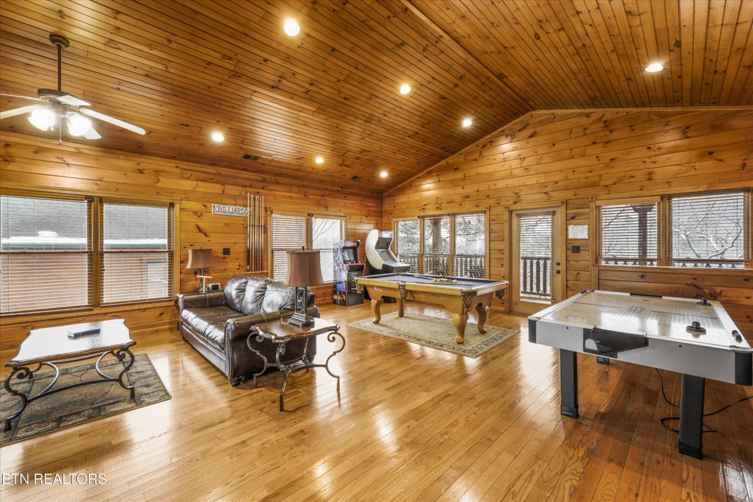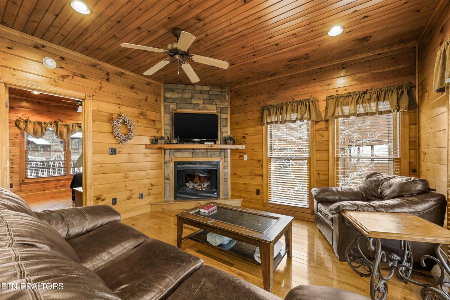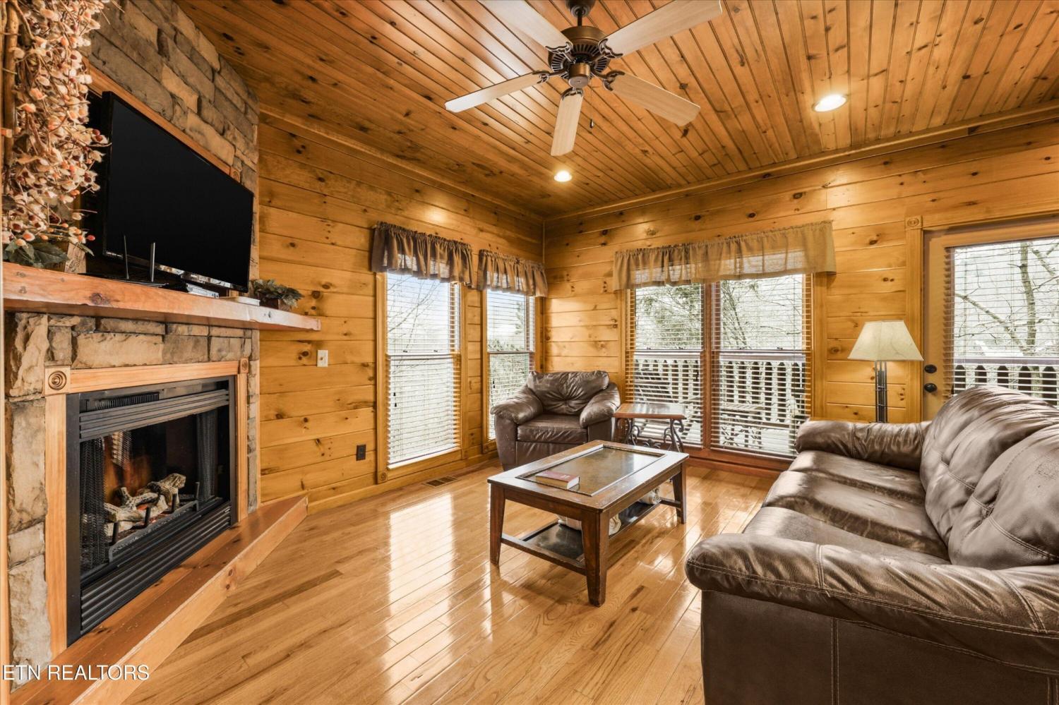 Turnkey luxury investment opportunity in the heart of the Smoky Mountains! Located inside the highly sought-after Gatlinburg Falls Resort, this fully furnished log cabin is the perfect short-term rental, second home, or mountain getaway already set up and ready to generate income from day one. Designed with guests in mind, the main level features an inviting open-concept floorplan with a fully equipped kitchen, spacious dining area, and comfortable living room centered around a cozy gas log fireplace which is perfect for relaxing after a day exploring the mountains. This level also includes a large private bedroom with its own ensuite bathroom, offering convenience and privacy for main-level guests. The lower level is built for comfort and occupancy, housing two additional oversized bedrooms each with their own ensuite bathrooms creating the ideal layout for hosting multiple people or group rentals. Head upstairs to the top level where entertainment takes center stage. This loft/game room space is designed for fun and memory-making, complete with ample room for games, lounging, and guest enjoyment, plus a fourth full bathroom for added convenience along with the bunks. The exterior is just as impressive, with three covered expansive decks providing peaceful wooded surroundings and mountain ambiance. One deck features a private hot tub which is a must-have amenity for maximizing short-term rental bookings and guest satisfaction. Gatlinburg Falls Resort offers incredible community amenities including a resort-style swimming pool, conference center, and even a wedding facility; making it a popular destination for vacationers year-round. Perfectly positioned just minutes from both Gatlinburg and Pigeon Forge and located right off the Spur, guests have quick access to the Great Smoky Mountains National Park, Dollywood, dining, attractions, and entertainment while still enjoying the privacy of a luxury cabin resort setting.