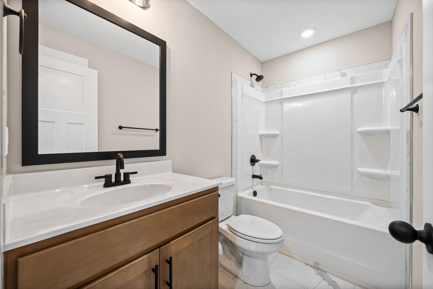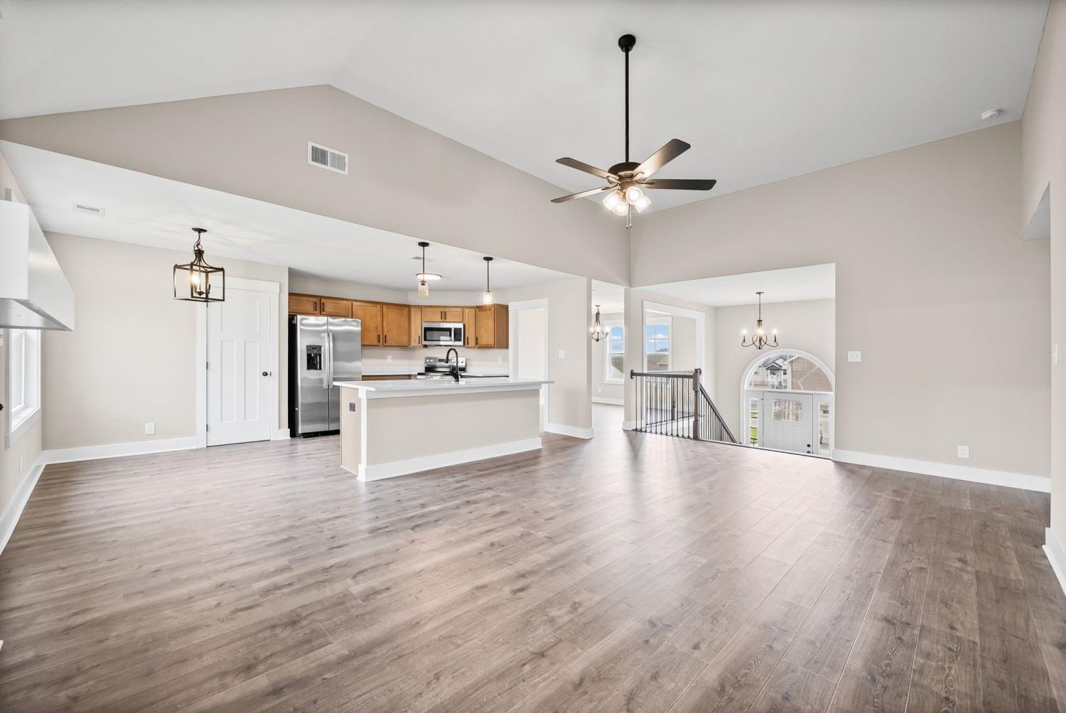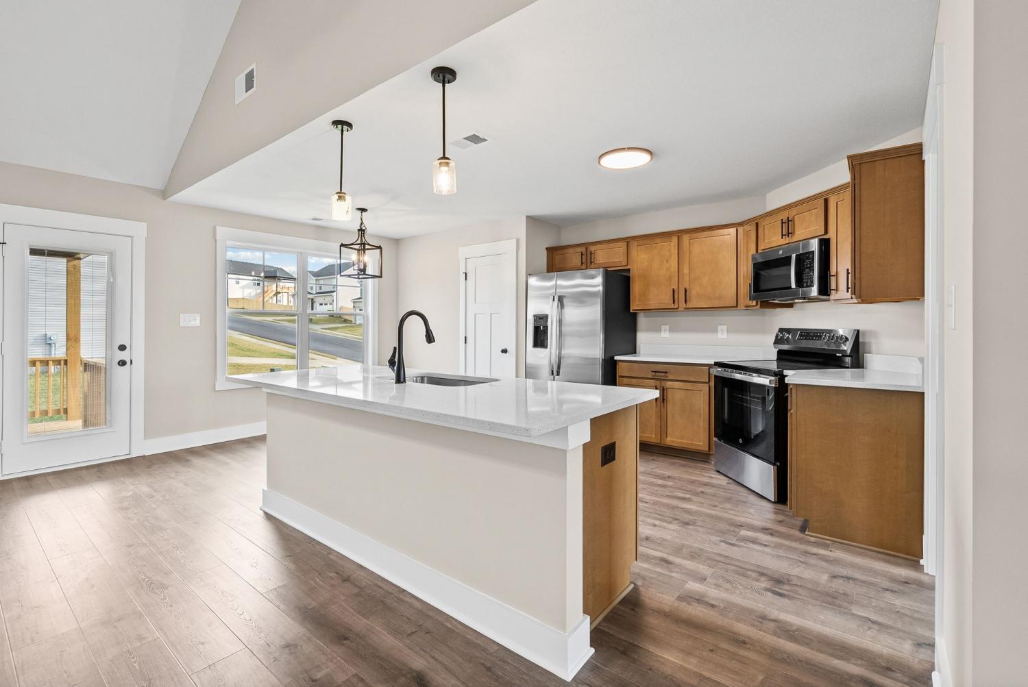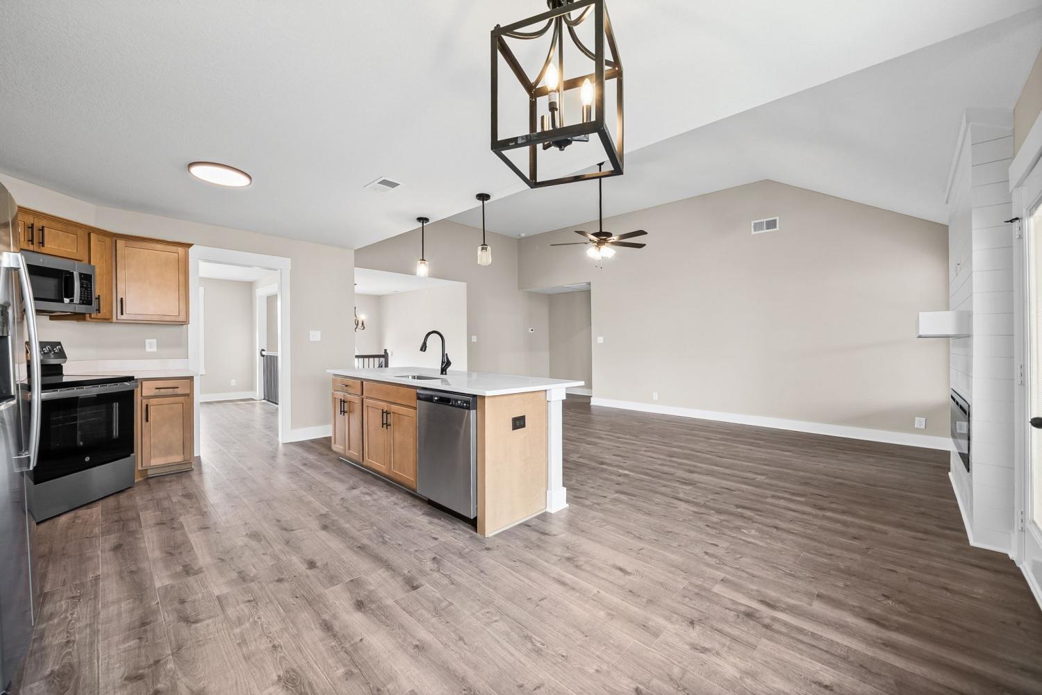 Welcome to the Oakmont Floor plan! - This open-concept split-level home features vaulted ceilings, a gas fireplace, and a chef’s kitchen with granite counters, stainless steel appliances, and a pantry. Luxury plank flooring throughout, carpeted bedrooms, and tile in wet areas. The primary suite includes a trey ceiling, huge walk-in closet, soaking tub, large tile shower, and double vanities. Two more bedrooms are on the main level. Downstairs offers a bonus room, laundry, two additional bedrooms, and a full bath. Enjoy a 3-car garage. ***Sample photo! Colors/ finishes may vary***