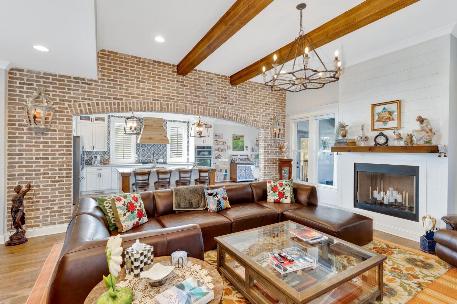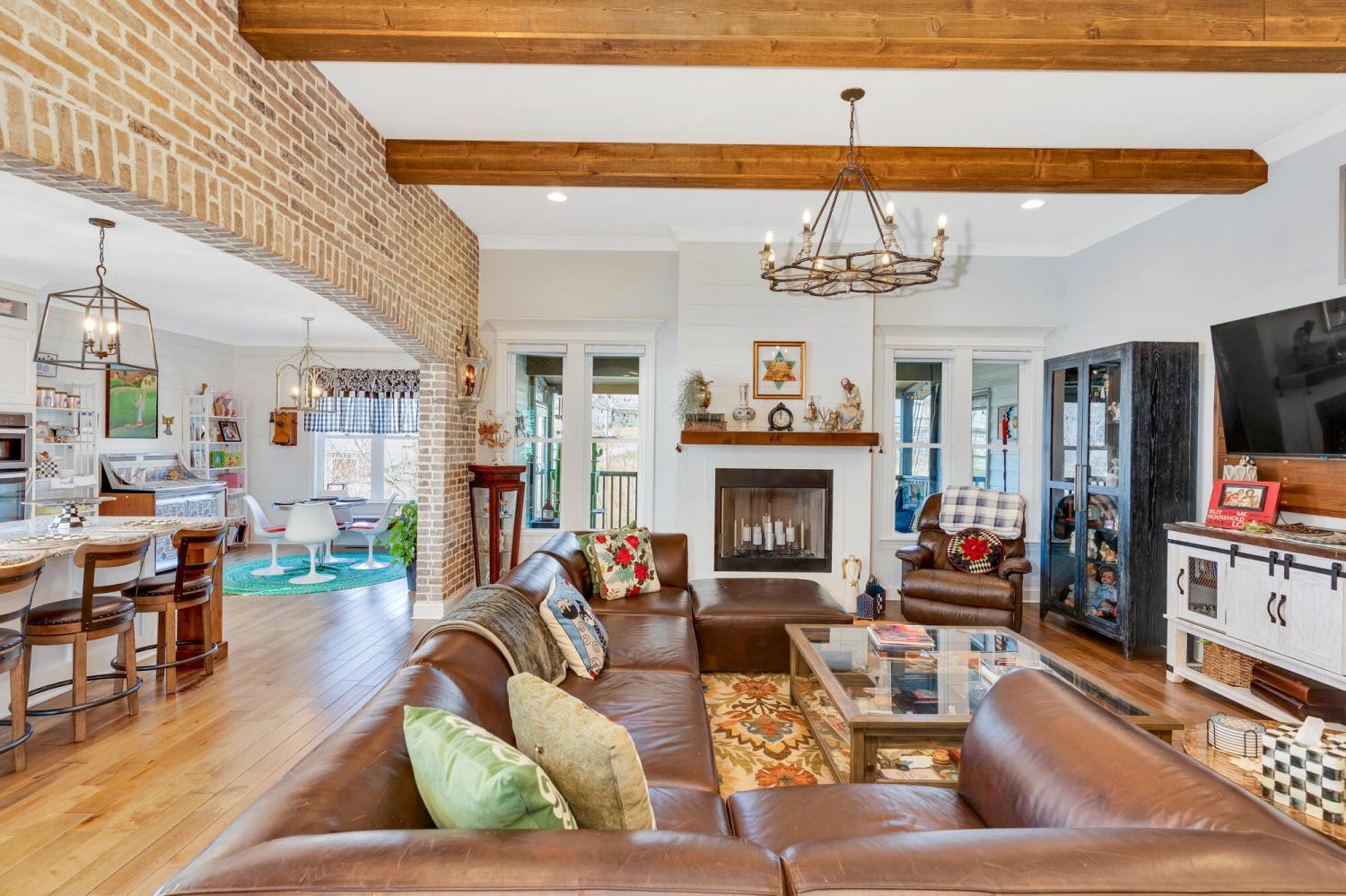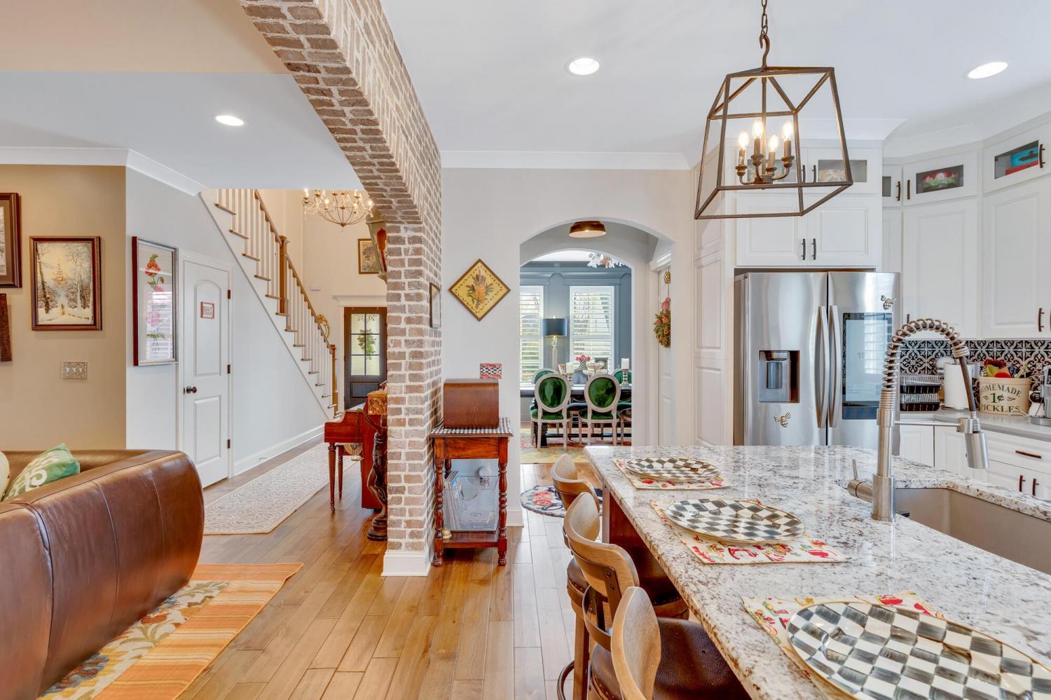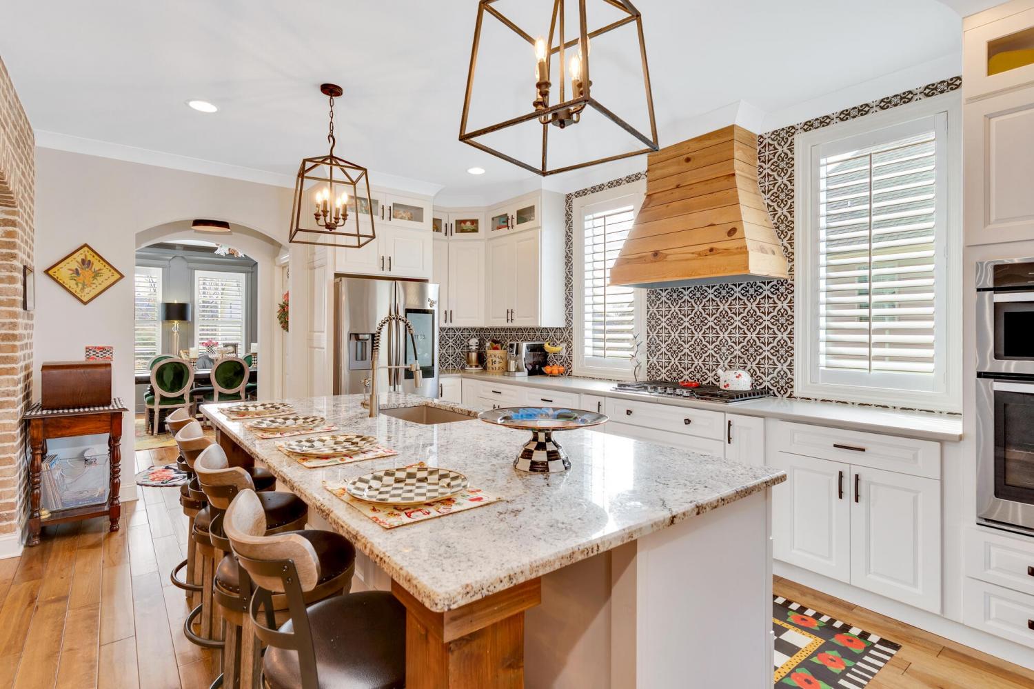 Welcome to 9408 Peppy Branch Trail — a beautifully designed home offering open-concept living, upscale finishes, and incredible indoor-outdoor entertaining space in a highly desirable community with a pool. Step inside to rich hardwood floors and a flowing floor plan designed for both everyday living and hosting. The stunning kitchen serves as the heart of the home, featuring exposed brick accents, a massive center island, abundant cabinetry, and seamless connection to the living and dining areas. Just off the kitchen, a formal dining room and butler's pantry provide the perfect setup for gatherings and holiday entertaining. The spacious primary suite on the main level offers privacy and convenience, while generously sized secondary bedrooms provide comfort for family and guests alike. Enjoy year-round outdoor living on the covered porch overlooking a thoughtfully designed entertaining area complete with an outdoor fireplace — ideal for cozy evenings or weekend get-togethers. *Washer and dryer,Refrigerator, Kitchen curtains, Dining room light fixture are not included in the sale