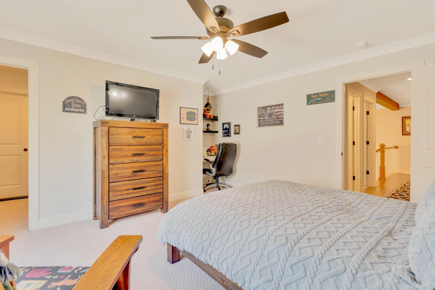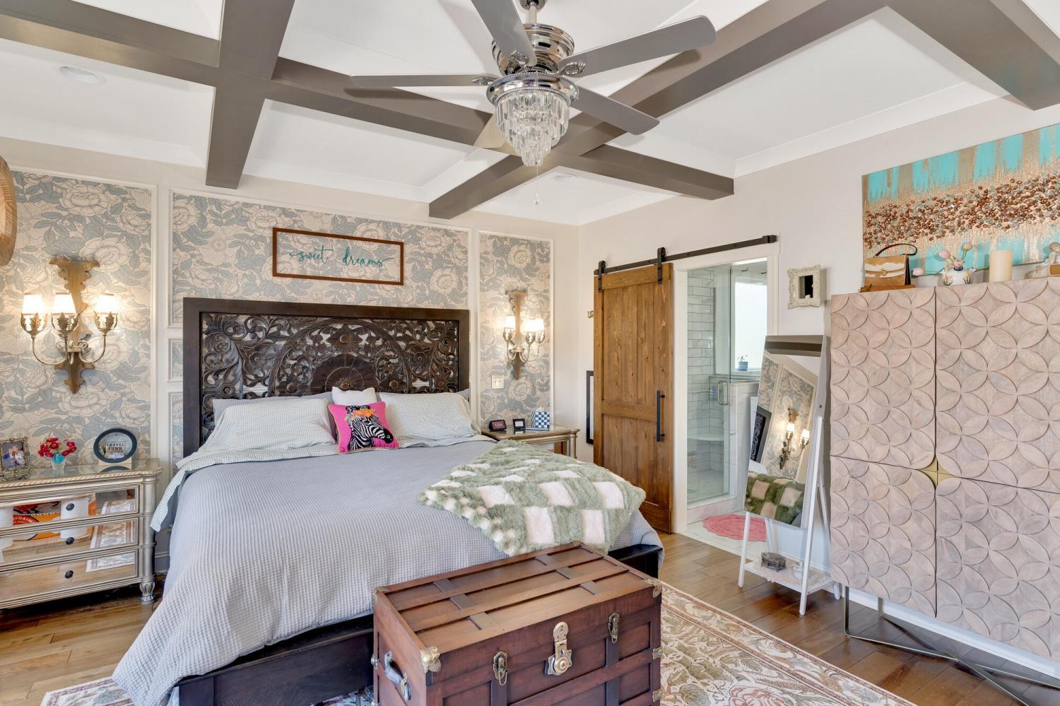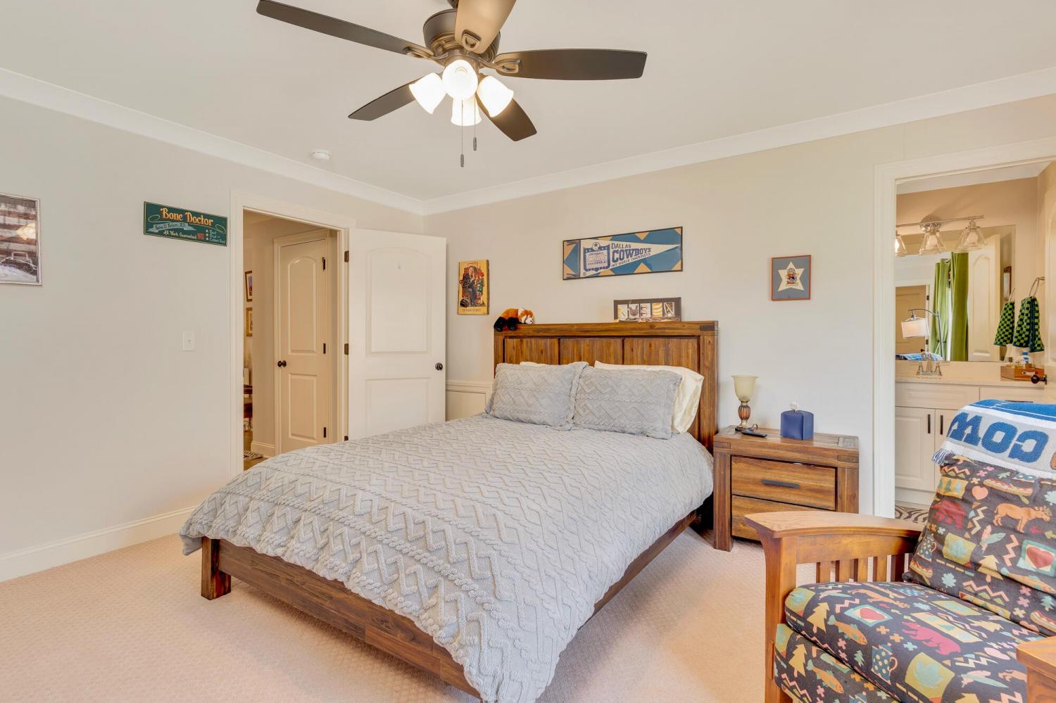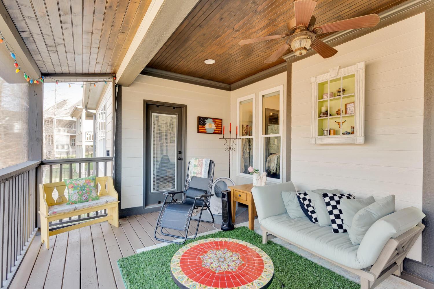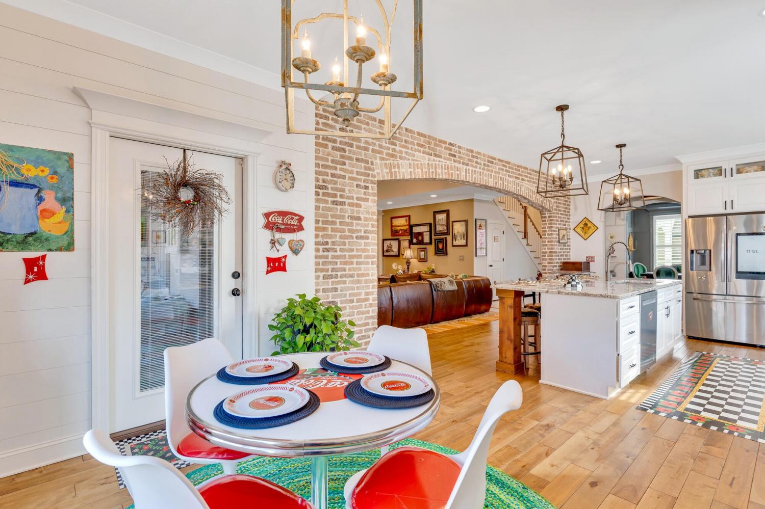 Welcome to 9408 Peppy Branch Trail — a beautifully designed home offering open-concept living, upscale finishes, and incredible indoor-outdoor entertaining space in a highly desirable community with a pool. Step inside to rich hardwood floors and a flowing floor plan designed for both everyday living and hosting. The stunning kitchen serves as the heart of the home, featuring exposed brick accents, a massive center island, abundant cabinetry, and seamless connection to the living and dining areas. Just off the kitchen, a formal dining room and butler's pantry provide the perfect setup for gatherings and holiday entertaining. The spacious primary suite on the main level offers privacy and convenience, while generously sized secondary bedrooms provide comfort for family and guests alike. Enjoy year-round outdoor living on the covered porch overlooking a thoughtfully designed entertaining area complete with an outdoor fireplace — ideal for cozy evenings or weekend get-togethers. *Washer and dryer,Refrigerator, Kitchen curtains, Dining room light fixture are not included in the sale