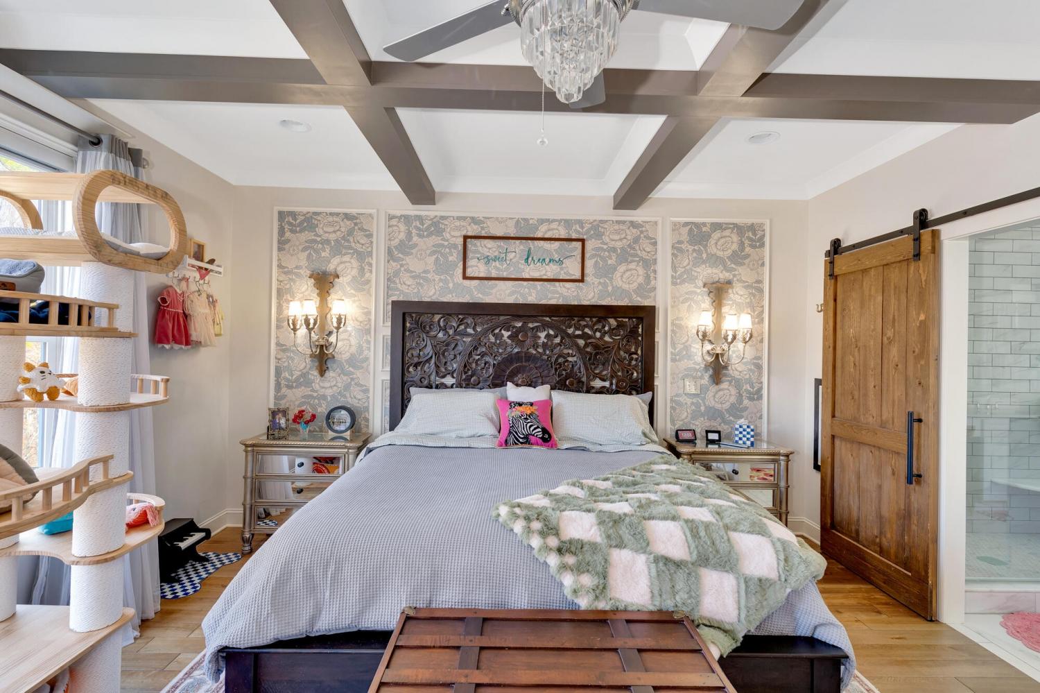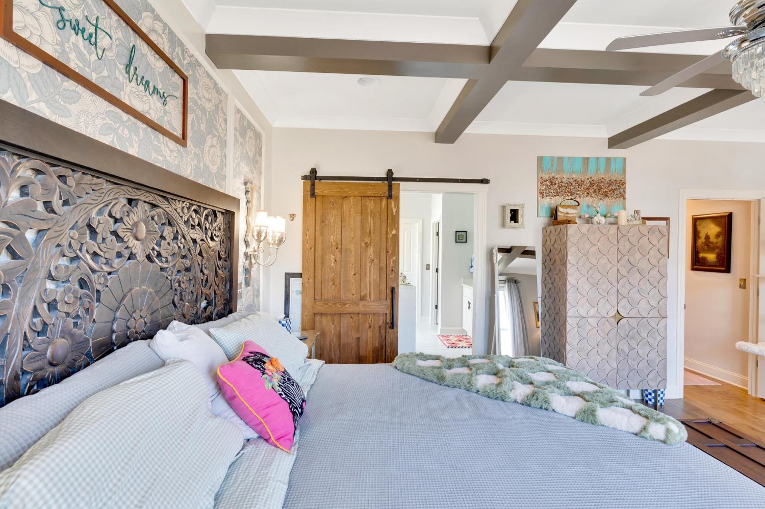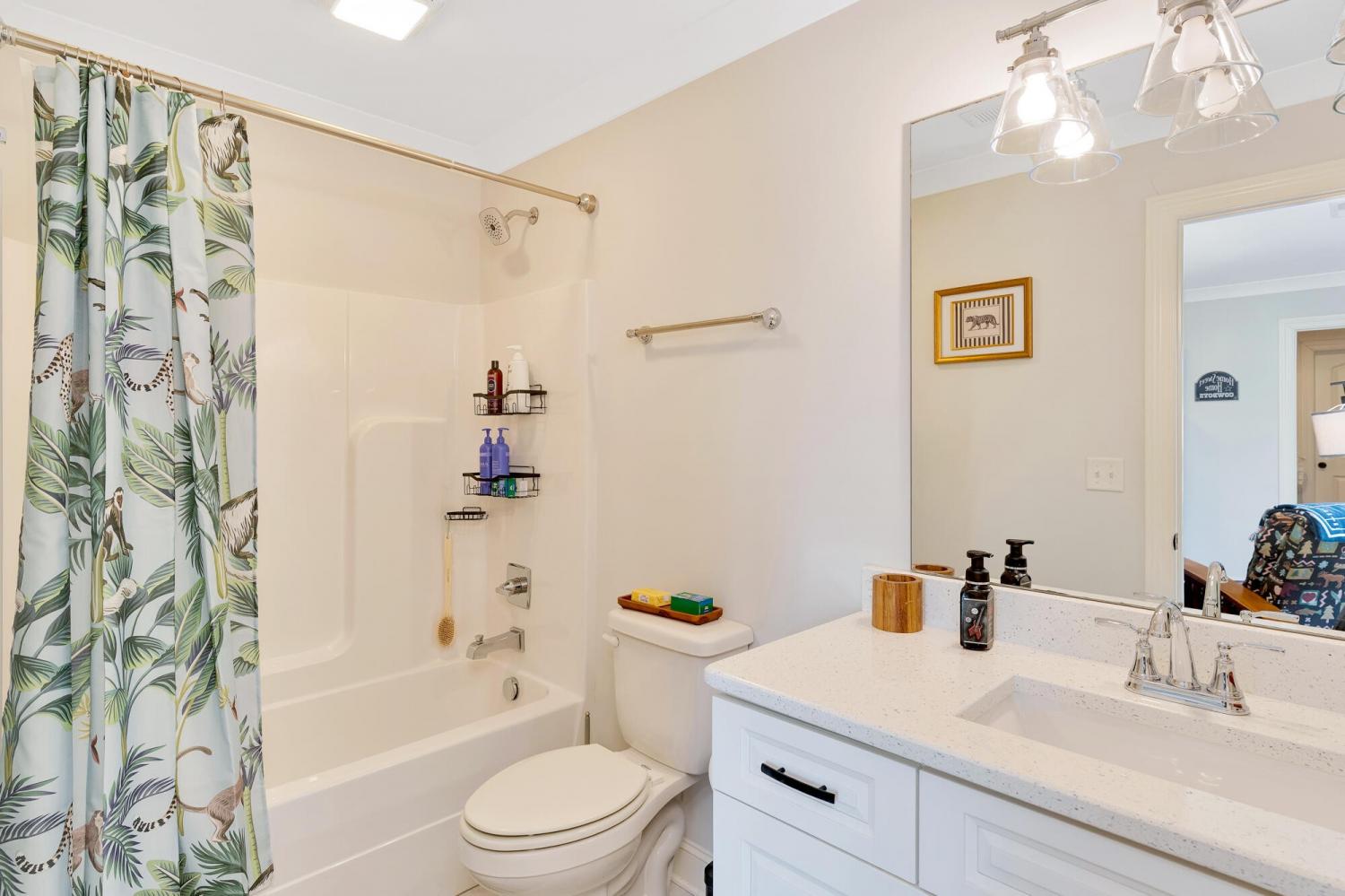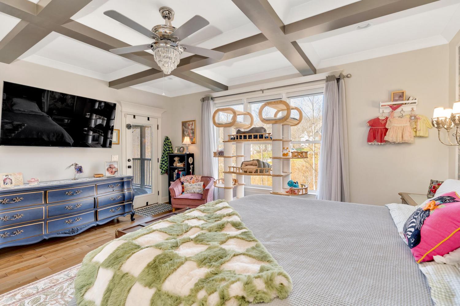 Welcome to 9408 Peppy Branch Trail — a beautifully designed home offering open-concept living, upscale finishes, and incredible indoor-outdoor entertaining space in a highly desirable community with a pool. Step inside to rich hardwood floors and a flowing floor plan designed for both everyday living and hosting. The stunning kitchen serves as the heart of the home, featuring exposed brick accents, a massive center island, abundant cabinetry, and seamless connection to the living and dining areas. Just off the kitchen, a formal dining room and butler's pantry provide the perfect setup for gatherings and holiday entertaining. The spacious primary suite on the main level offers privacy and convenience, while generously sized secondary bedrooms provide comfort for family and guests alike. Enjoy year-round outdoor living on the covered porch overlooking a thoughtfully designed entertaining area complete with an outdoor fireplace — ideal for cozy evenings or weekend get-togethers. *Washer and dryer,Refrigerator, Kitchen curtains, Dining room light fixture are not included in the sale