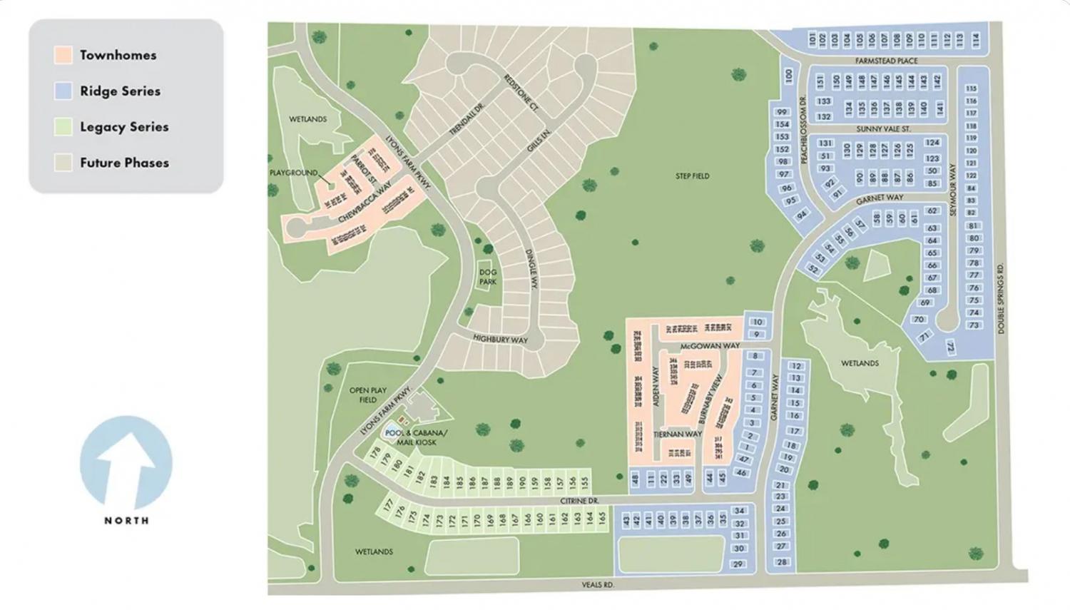 From Nashville, take I-24 East, then US-231 South. Turn right on S Rutherford Blvd, then right on Bradyville Pike. Turn left on Veals Rd, then left on Garnet Way—the community is straight ahead.