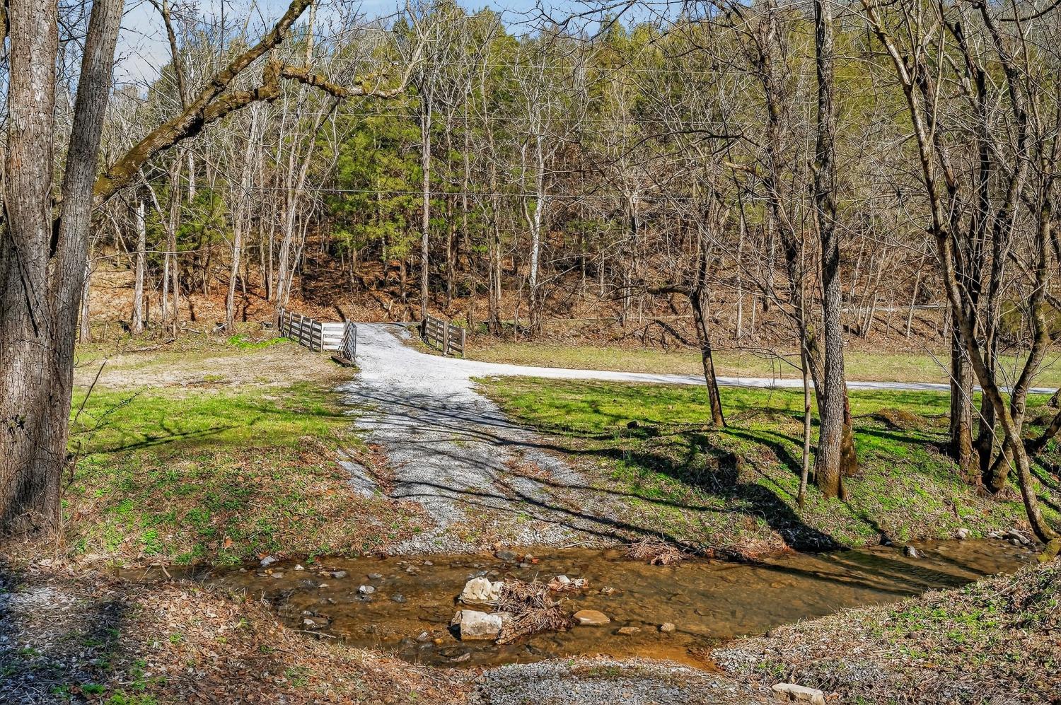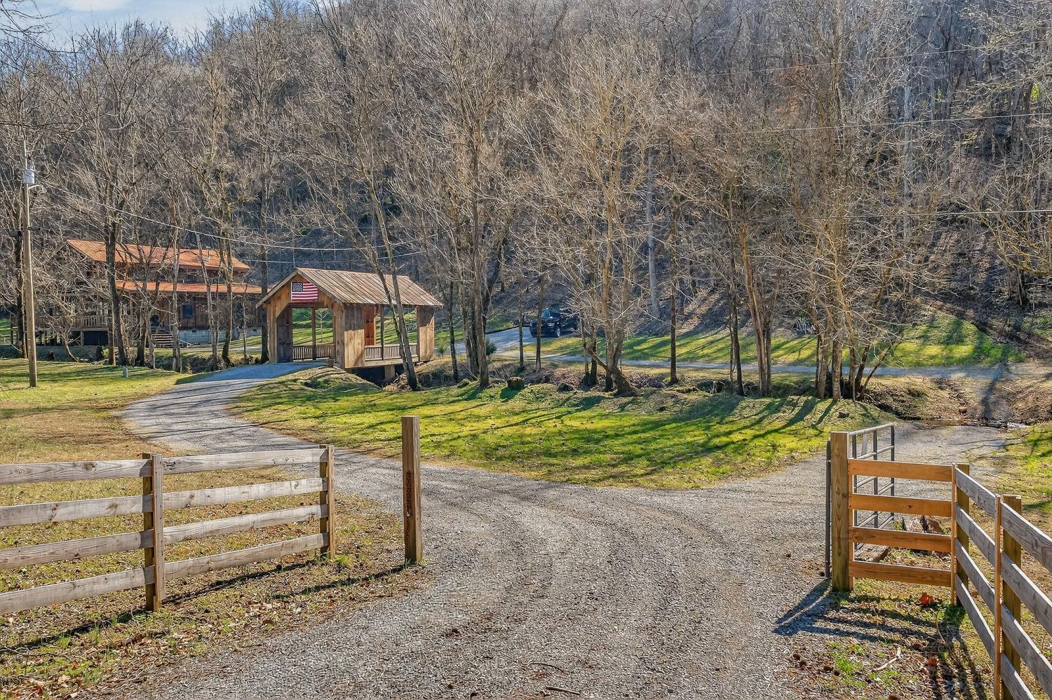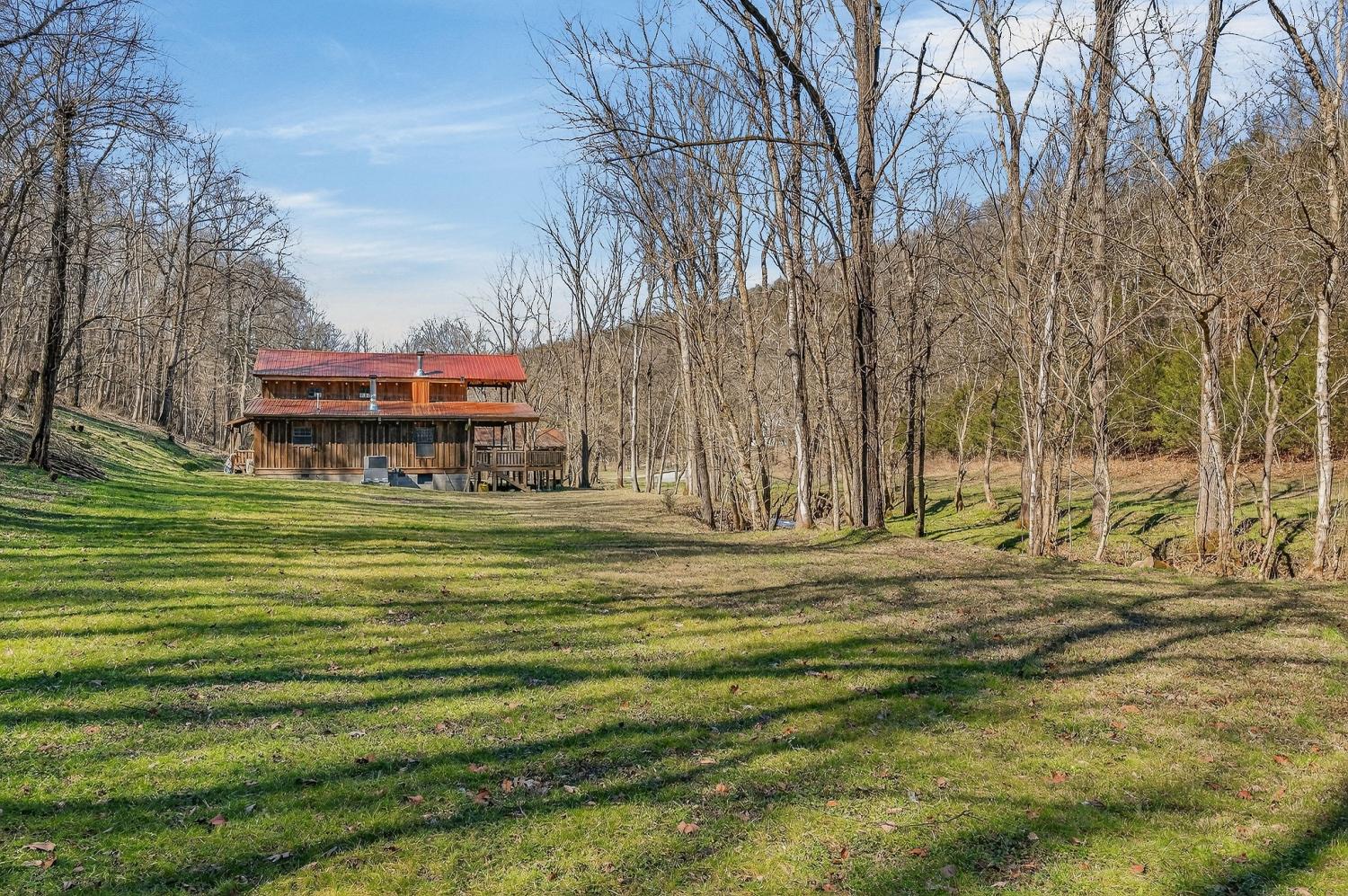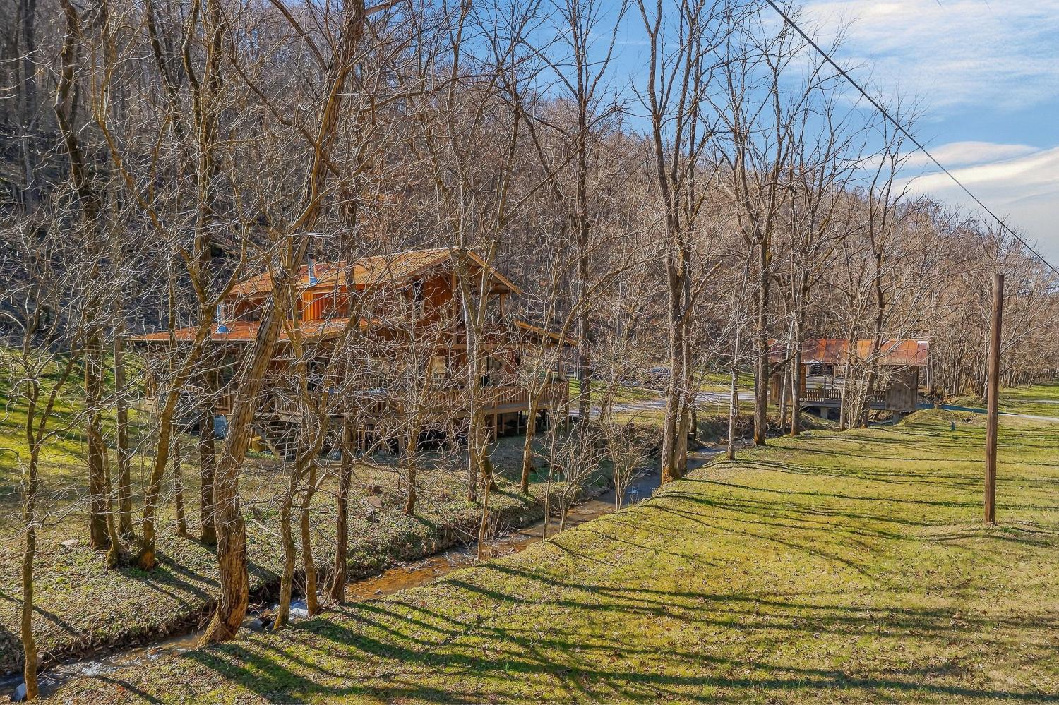 As you enter the property, you cross a covered bridge with the creek running along the front, immediately setting the tone for the peaceful setting. The home sits overlooking the water with an 800 sq ft full-length front deck that provides plenty of space for entertaining or relaxing. A hot tub is already in place, making it easy to enjoy the view year-round. Inside, the home features 3 bedrooms and 2 bathrooms with an open-concept layout. The kitchen includes an island and a wood-burning stove that serves as an additional heat source. There are two wood-burning fireplaces, one located in the living room and another in the primary bedroom. Wood walls, natural wood flooring, and vaulted ceilings with exposed beams give the home a warm, cabin-style feel. Upstairs, an 18 x 20 loft provides flexible space for an office, bonus area, or additional sleeping space. The loft is carpeted, while the bathrooms feature tile flooring and classic clawfoot tubs. The primary bathroom is currently needing to be finished. Spacious closets and additional storage areas add functionality. Outside, the property includes a two-car detached garage with an attached carport, a workshop with a concrete floor, a gravel driveway, and a trail that runs through the acreage leading to an additional potential building site. A natural spring is also located on the property in addition to the creek.. With approximately 1,895 feet of road frontage, this tract offers potential for subdivision or future development if desired. Property is being sold as is. HVAC NEW 2024. Tankless Water Heater.