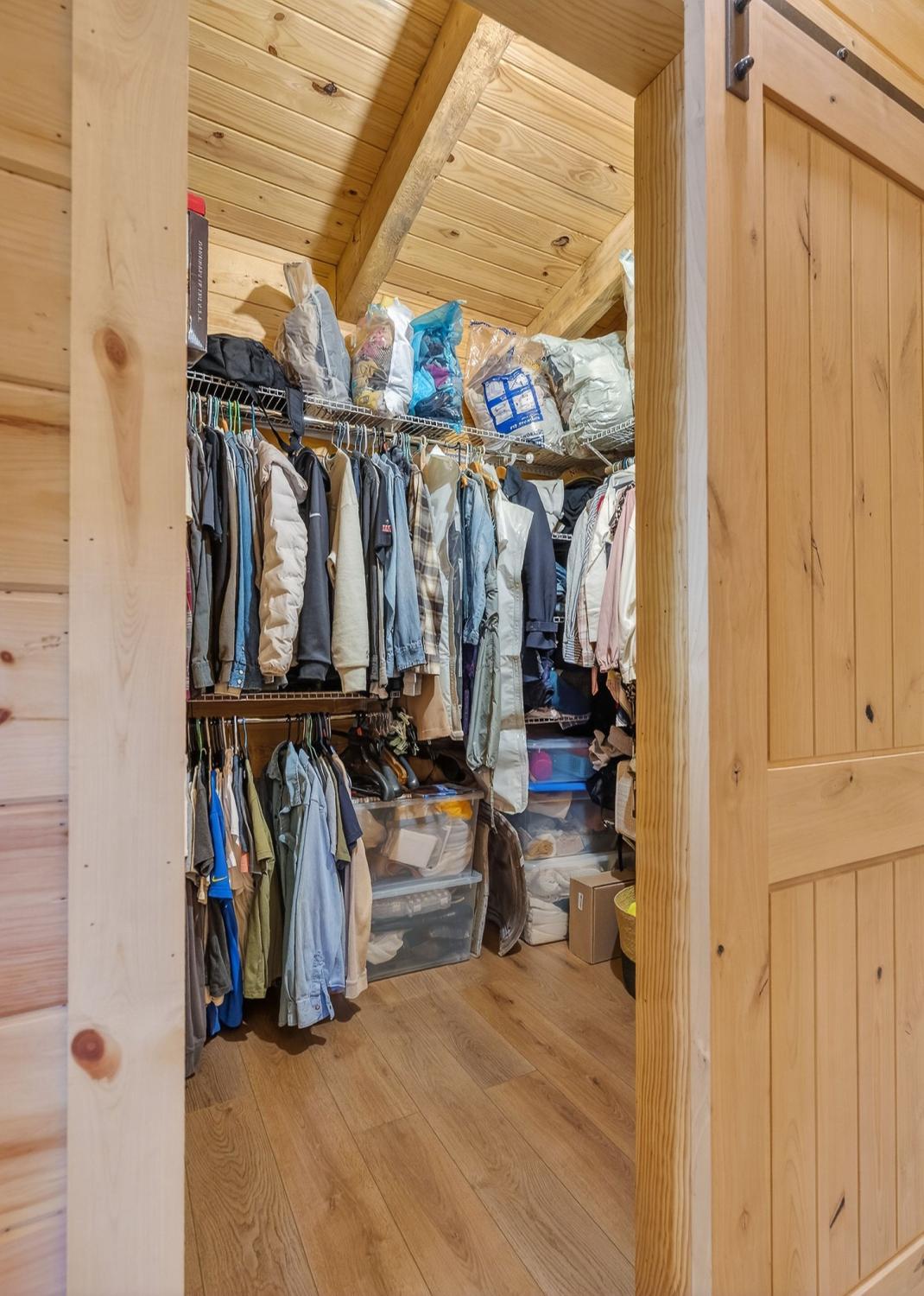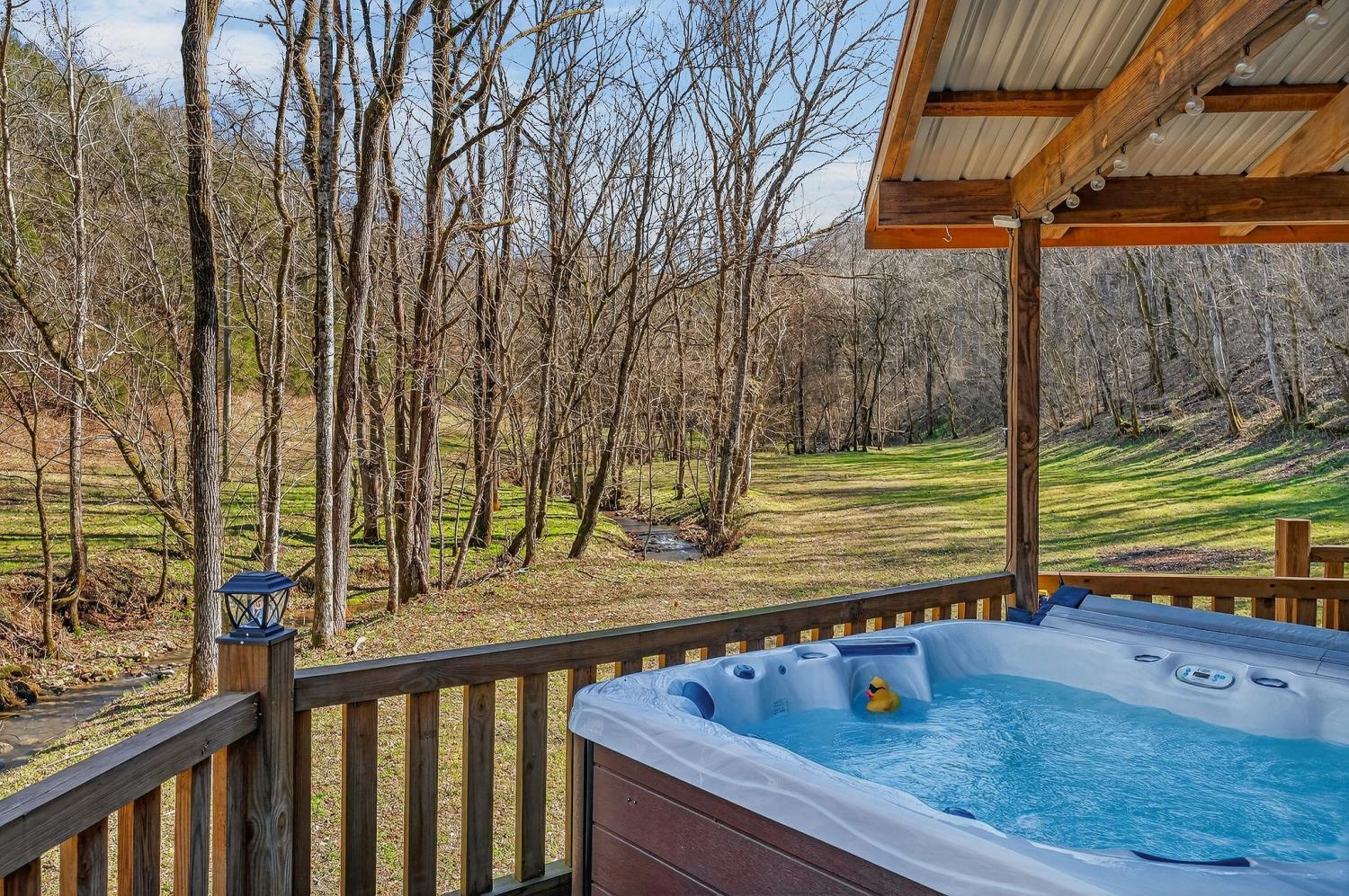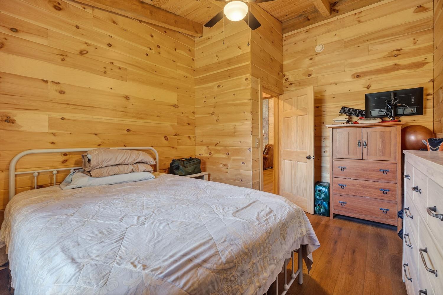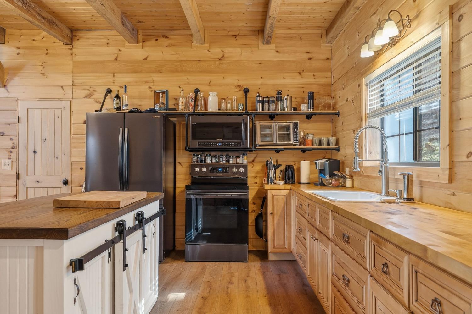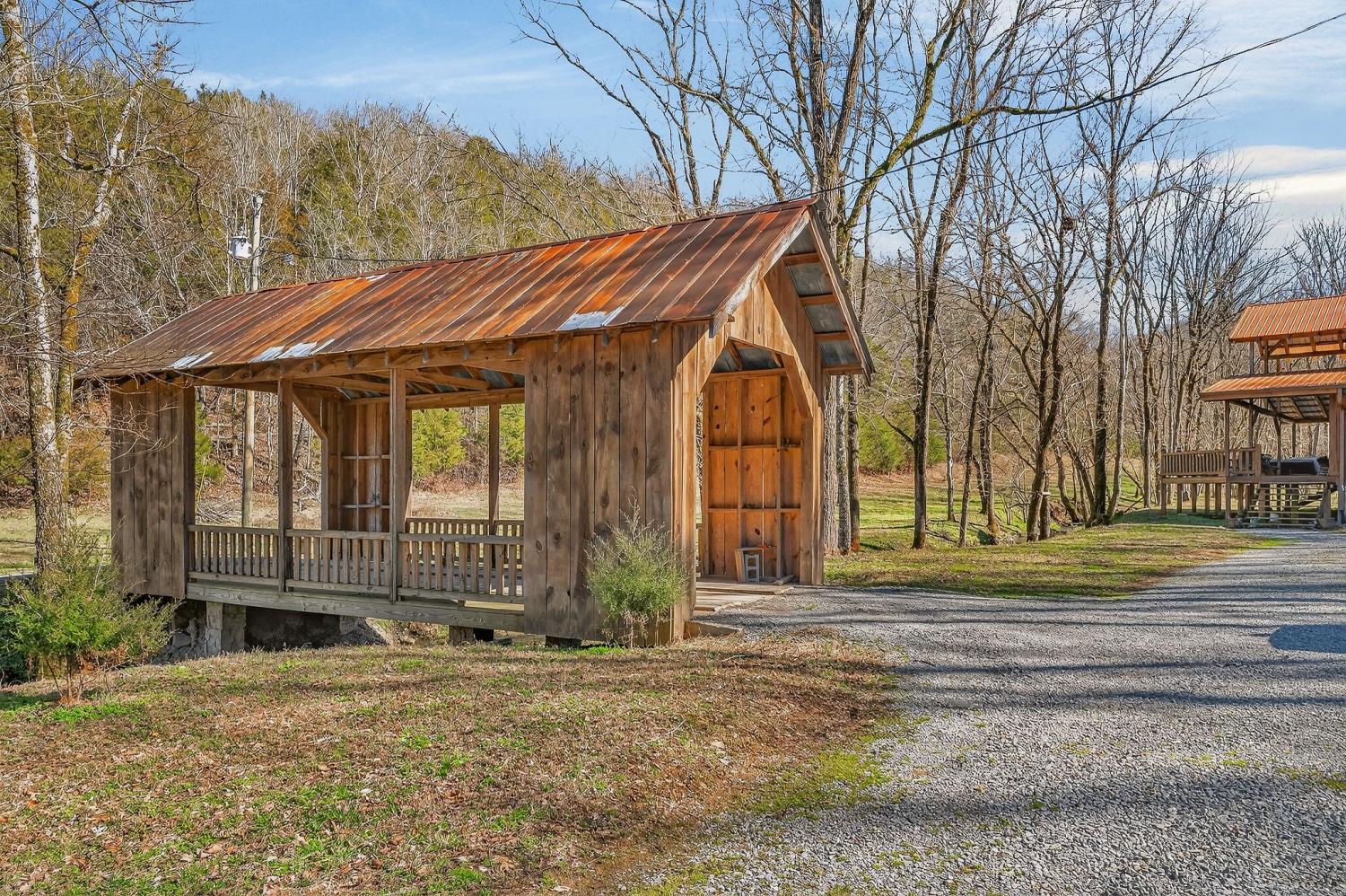 As you enter the property, you cross a covered bridge with the creek running along the front, immediately setting the tone for the peaceful setting. The home sits overlooking the water with an 800 sq ft full-length front deck that provides plenty of space for entertaining or relaxing. A hot tub is already in place, making it easy to enjoy the view year-round. Inside, the home features 3 bedrooms and 2 bathrooms with an open-concept layout. The kitchen includes an island and a wood-burning stove that serves as an additional heat source. There are two wood-burning fireplaces, one located in the living room and another in the primary bedroom. Wood walls, natural wood flooring, and vaulted ceilings with exposed beams give the home a warm, cabin-style feel. Upstairs, an 18 x 20 loft provides flexible space for an office, bonus area, or additional sleeping space. The loft is carpeted, while the bathrooms feature tile flooring and classic clawfoot tubs. The primary bathroom is currently needing to be finished. Spacious closets and additional storage areas add functionality. Outside, the property includes a two-car detached garage with an attached carport, a workshop with a concrete floor, a gravel driveway, and a trail that runs through the acreage leading to an additional potential building site. A natural spring is also located on the property in addition to the creek.. With approximately 1,895 feet of road frontage, this tract offers potential for subdivision or future development if desired. Property is being sold as is. HVAC NEW 2024. Tankless Water Heater.