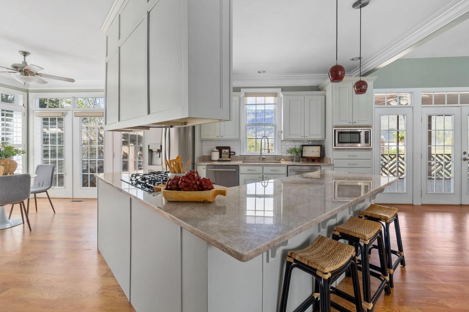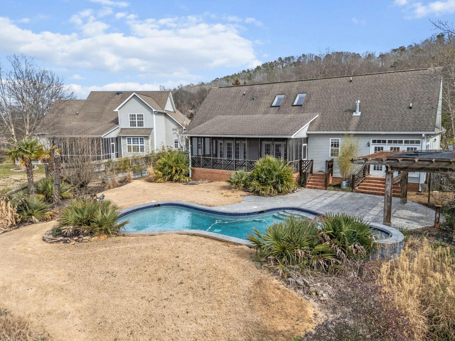 Opportunities like this don't come along every day. Perched on a hill in the scenic Horse Creek Farms neighborhood, this home affords you spectacular sunsets over Signal and Elder Mountains. This architect designed and custom built home will delight you with space and all the thoughtful details. From the courtyard entry garage and columned front porch to the expansive screened porch overlooking the private gunite, salt water pool and spa, this is the one. Hardwood floors and vaulted ceilings greet you at the front door, along with the views. The open floor plan is perfect for entertaining with a columned dining room, charming breakfast nook and open kitchen to the vaulted great room with gas log fireplace. This beautiful kitchen was updated about two years ago with light painted cabinets, handsome stone countertops, stainless appliances including gas cooktop and two dishwashers(how handy is that!). Rest and relaxation is for everyone in spacious bedrooms including a main floor primary suite that provides heated floors in the bathroom, double vanity in new cabinetry and countertops, a large tiled shower and a boat of a soaking tub and walk-in closet. If this wasn't enough, french doors lead to an office with classic wood built-ins and bay windows.Beautiful french doors give you access to the large rear screened porch directly from your primary suite. Imagine waking up to views of the mountains. The main level also includes a large laundry room and full bath with exterior door for pool guests. Upstairs features three bedrooms and a massive, vaulted bonus room that features media built-ins and a closet plus additional storage. The bedrooms are spacious with ample closets. A charming, reading loft sits between the bedrooms. PLUS, there is another full bath already plumbed and ready to be finished for a total of four! You're likely going to live as much in the backyard as inside this home.