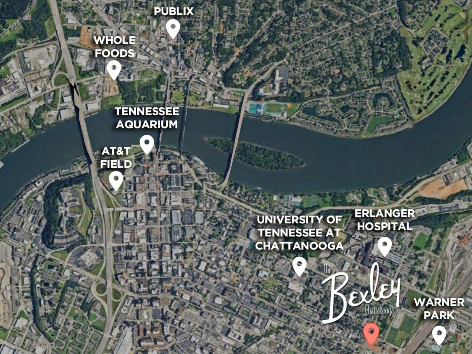Located at the corner of McCallie and Central Avenues. From McCallie Ave, turn onto Central Ave, then turn right on Oak Street. Turn right into The Bexley community. Alternate route: From McCallie Ave, turn onto O'Neal Street, then turn left on Oak Street. Turn left into The Bexley community. Parking is available near the mailboxes and dog park. The model is located in the building facing McCallie Ave.