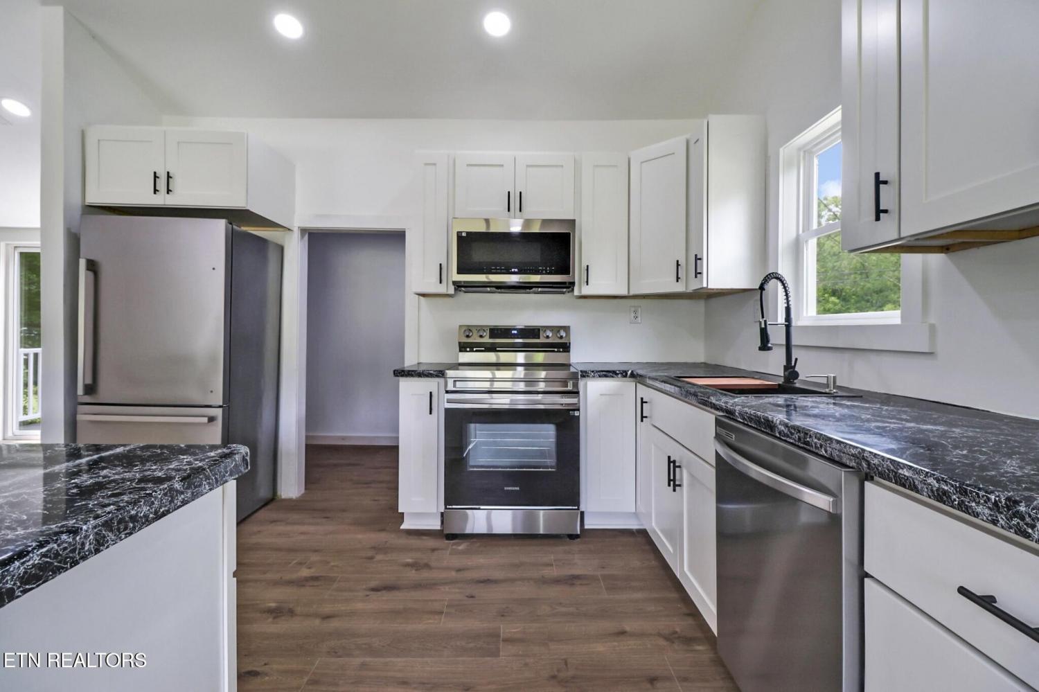 Beautifully remodeled from top to bottom, this charming home sits on just under an acre and offers the perfect blend of convenience and country feel--located just 5 minutes from downtown Jamestown. The interior features all-new drywall, lighting, and durable laminate flooring throughout. The kitchen includes brand-new stainless steel appliances (including refrigerator), new cabinetry, and a full-size pantry. Bathrooms have been completely renovated floor-to-ceiling with new vanities and a stunning tiled master shower. Additional upgrades include new interior doors, trim, and energy-efficient low-E vinyl windows. Exterior improvements feature low-maintenance composite siding with foam backing, wood beam accents on the front porch, a tongue-and-groove ceiling, new metal roof, new gutters, and a composite rear deck with railing. The property offers mature trees, a spacious backyard, and a separate laundry room for added convenience.
