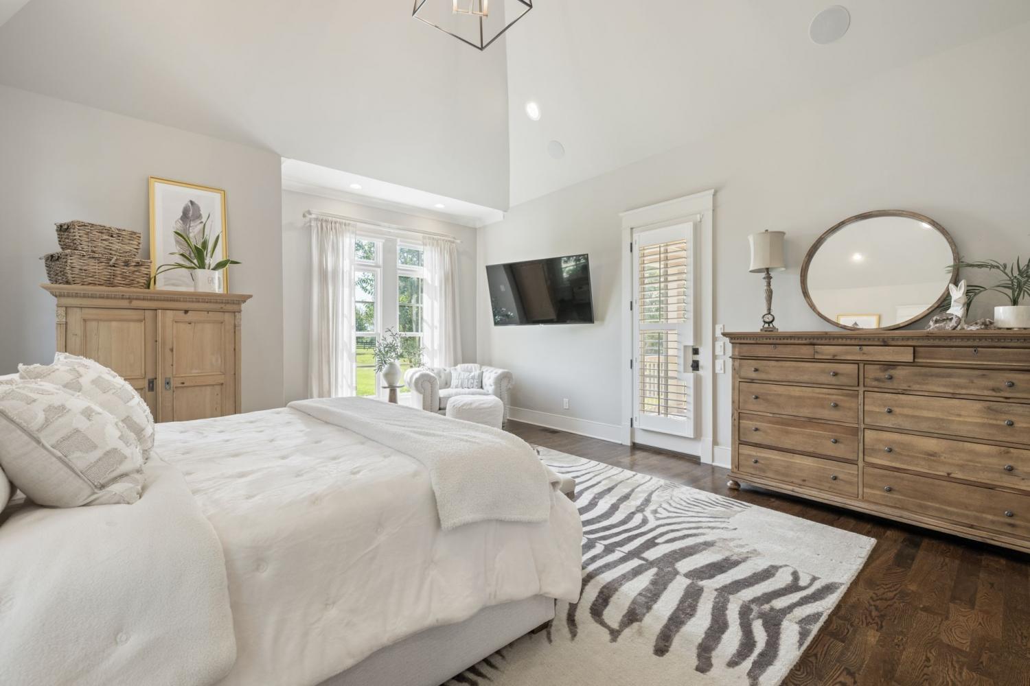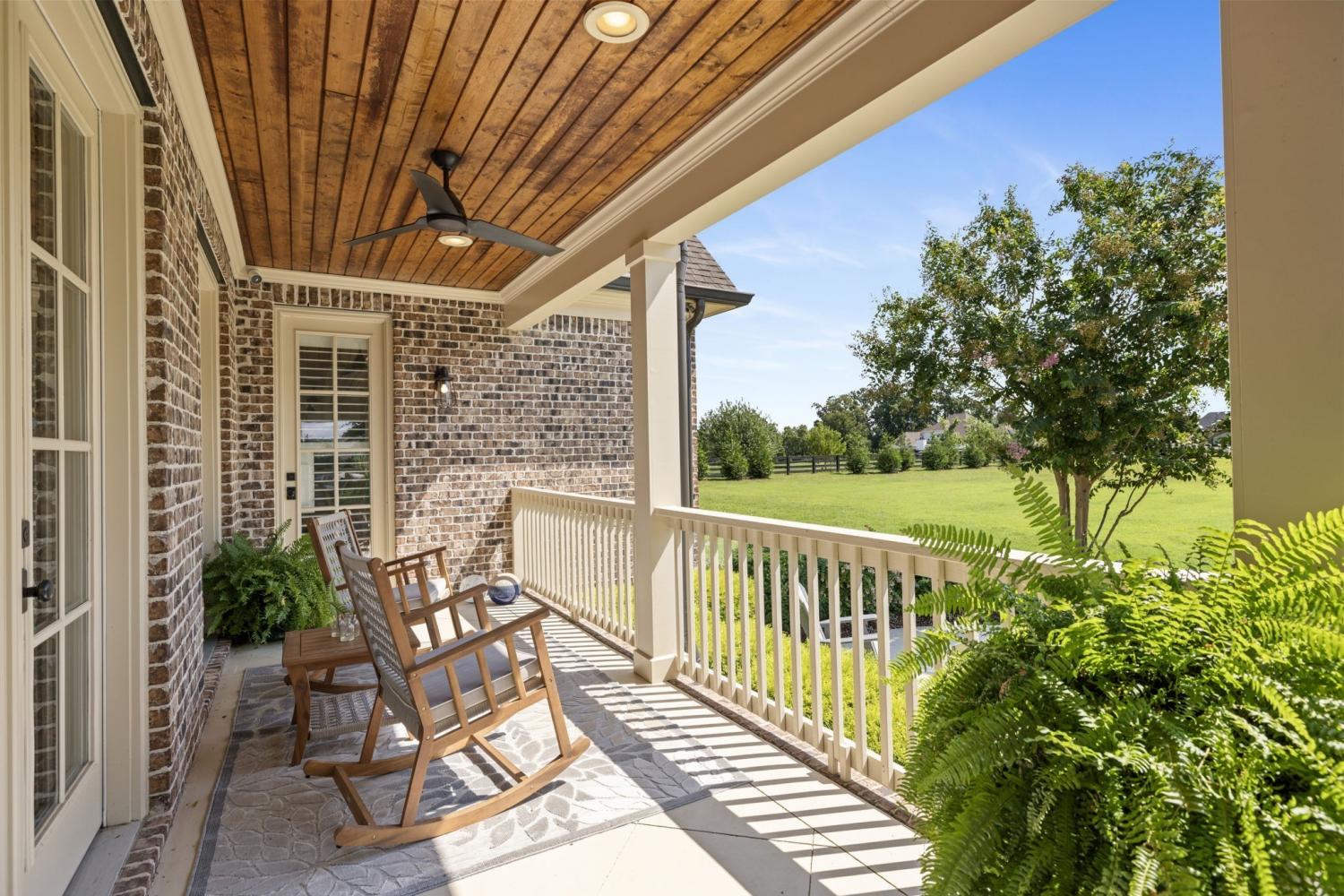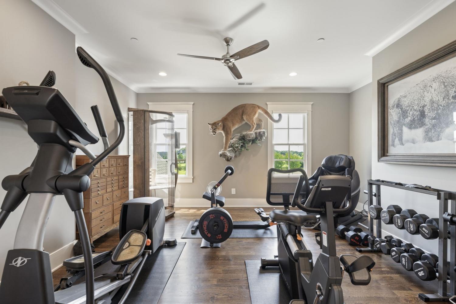 This custom-built home sits on 1.7 flat acres in the highly sought-after Black Hawk neighborhood in beautiful Arrington. The layout features an open-concept main living area with stunning hardwood floors, french doors that flood the space with natural light, and rustic accents throughout. The main level offers a bright formal dining/sitting room with coffered ceilings and two full bedroom suites. Built-in speaker system, home sprinkler system, and automated window treatments. The spacious primary suite includes a spa-style en-suite bath and walk-in closet, while the private guest suite includes a Murphy bed, providing comfort and convenience for visitors, and then transform it into a home office. The chef’s kitchen is equipped with a 48-inch gas range with griddle, built-in refrigerator, oversized island, custom cabinetry, butler’s pantry, wine bar, and a separate cooktop for larger meal preparation needs. The living room is highlighted by a floor-to-ceiling stone fireplace. Upstairs, the home offers two additional bedroom suites, a large recreation room, and a game room, making it an entertainer’s dream! Outdoor living is just as impressive, and it includes a covered patio with built-in gas fire pit, in-ground trampoline, professional landscape lighting, full-yard irrigation, and a fully fenced yard with a high-end electric privacy gate. Enjoy peaceful sunrises from the back patio and vibrant sunsets from the front porch. Additional highlights include a three-car garage, tankless water heater, UV air purifier, and extensive storage and entertaining space. Recent upgrades within the past two years include newly finished epoxy garage floors, newly tiled showers, expanded and upgraded irrigation system, privacy trees, newly added landscape lighting, and new electric gate fencing in the entire property.