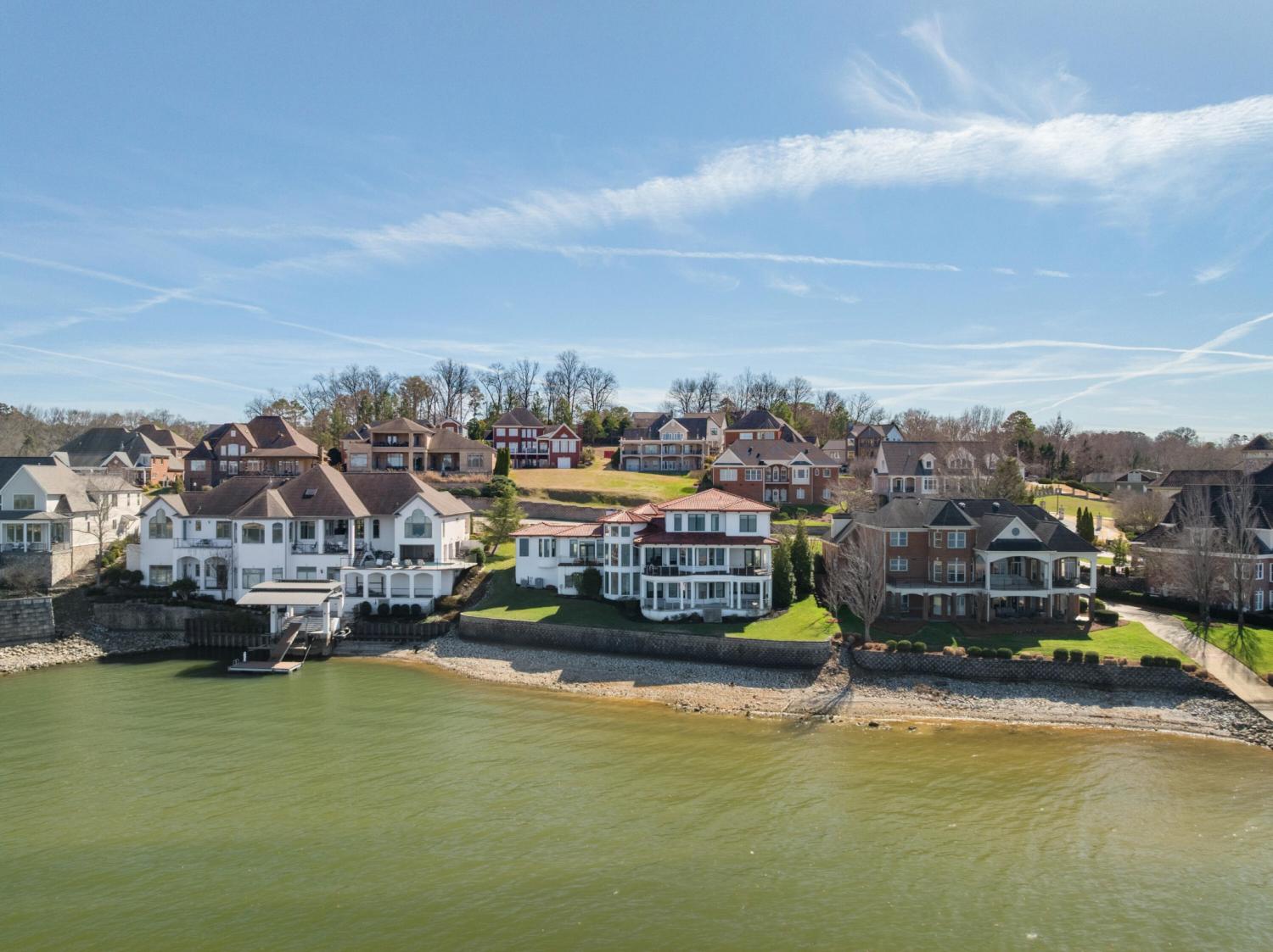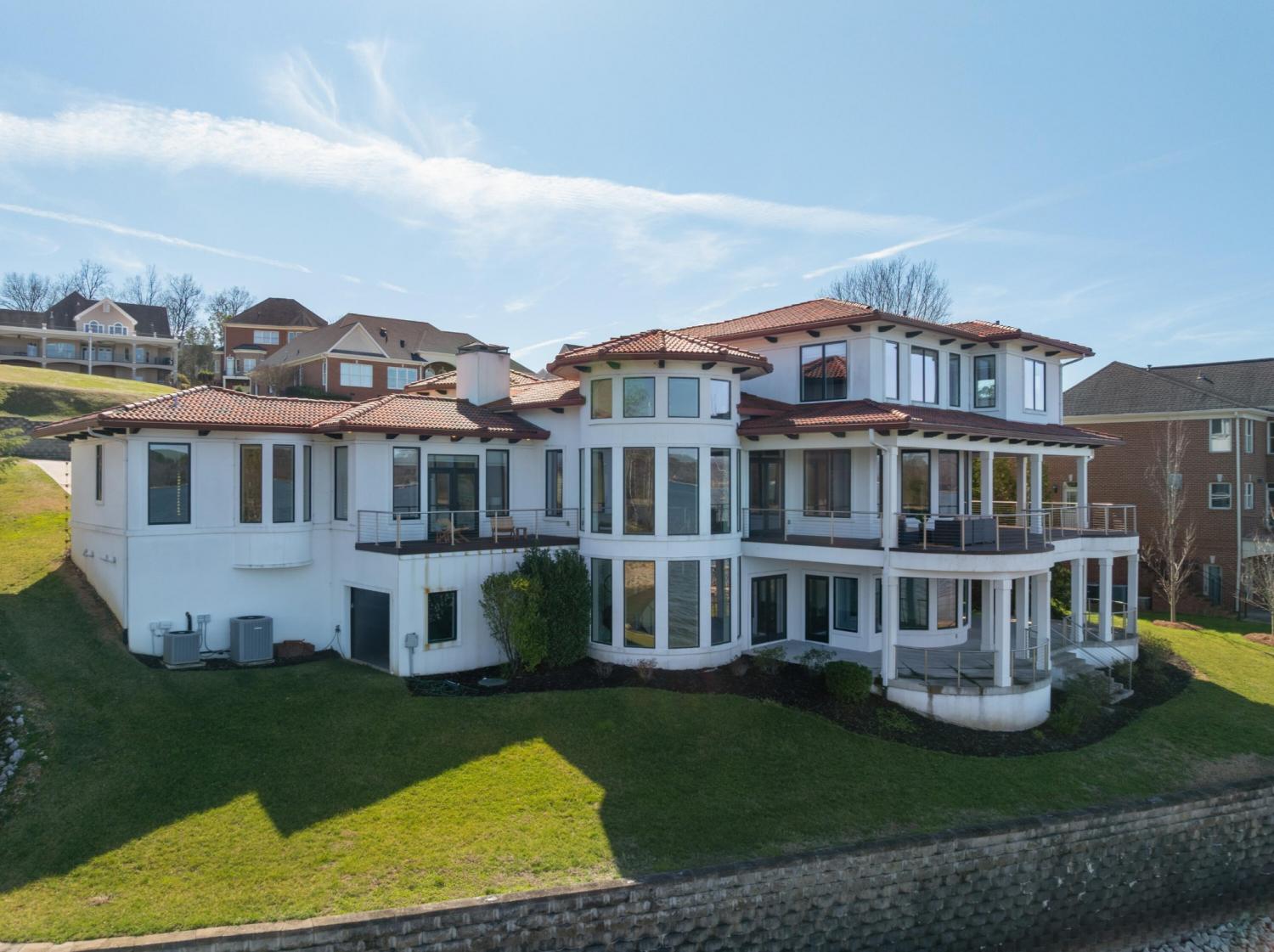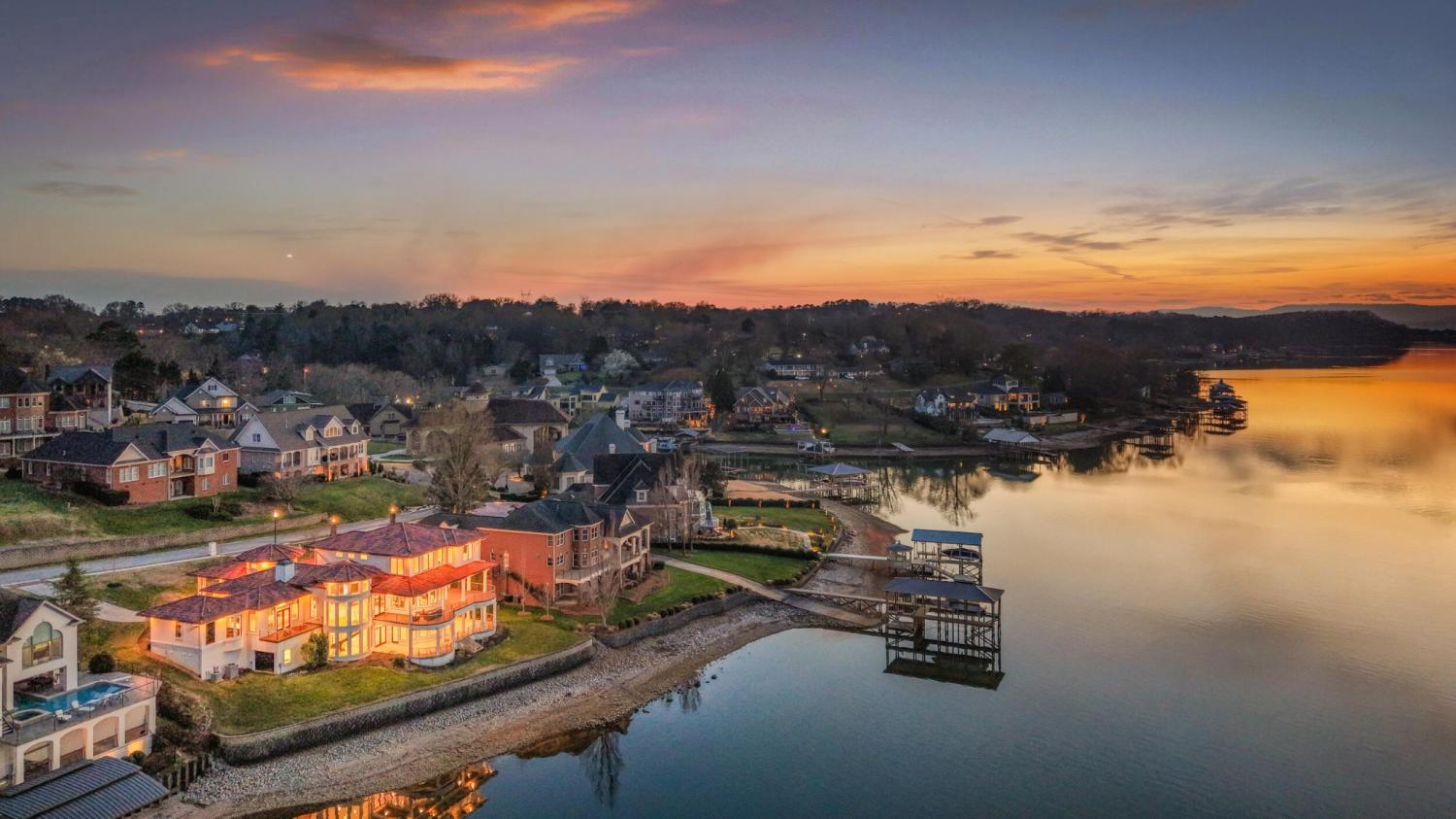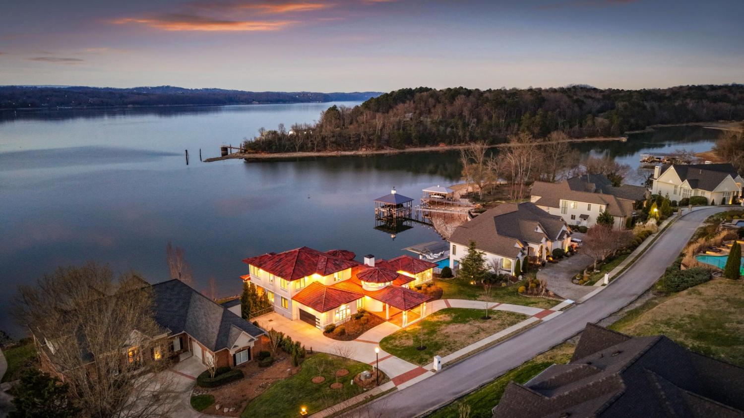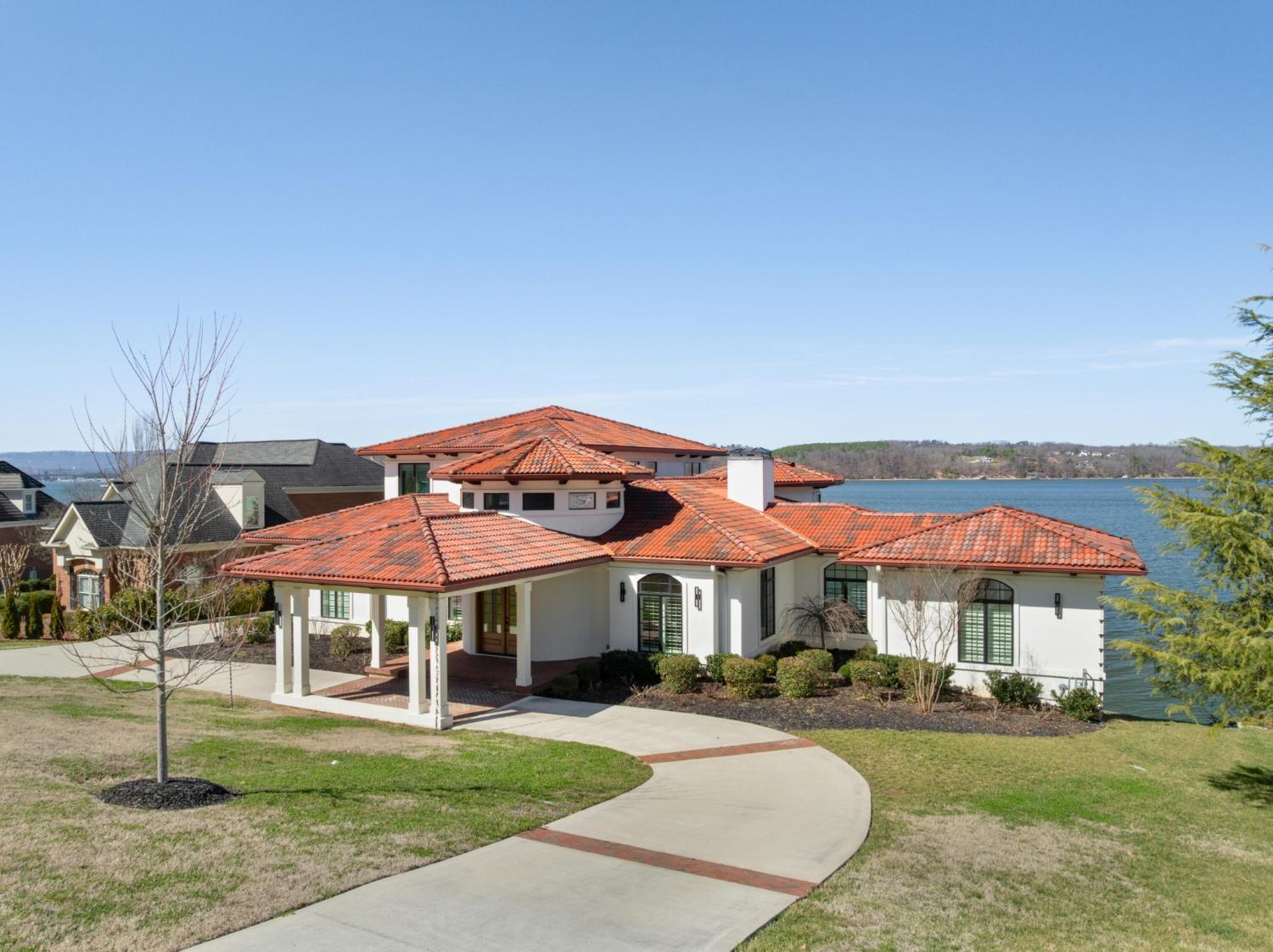 Luxury Lakefront Living! 6 bedrooms 6.5 bath custom home on Chickamauga Lake in the gated Windward Pointe neighborhood approximately 20 minutes from downtown Chattanooga. Premium finishes include marble tile floors, stone countertops, specialty ceilings, architecturally distinctive staircases and lighting, plantation shutters, casement windows, fantastic outdoor living spaces with sweeping views of the water, a double garage, a porte-cochere entry and a utility garage in the daylight basement. The main level has an open floor plan with a large circular foyer and dramatic lighting that sets the tone for the rest of this impressive, modern home. There is an office or sitting area to the right, a spacious great room with a tile accent wall with an inset fireplace, a formal dining room, a well-appointed kitchen with a large island, soft-close and pull-out drawers, under-cabinet and pendant lighting, high-end appliance, a breakfast area and a pantry in the hallway. This space has access to the covered deck that spans the back of the house and provides the perfect flow for both everyday living and entertaining. Just down the hall, you will find the powder room, mudroom with access to the garage for easy loading and unloading, the laundry room, and a guest bedroom suite with access to the deck. The primary suite is on the opposite side of the house and boasts a private deck, a walk-in closet with organizer system, and a beautiful primary bath with separate floating vanities, a deep copper tub positioned and a separate shower with steam, rain head, body sprays and a picture window to take advantage of the views. The upper level has a landing area that would be perfect for an office space and 3 additional bedrooms with walk-in closets and private baths - all with floating vanities and tiled showers. Head downstairs via the sweeping wood and metal staircase where you will find a huge family or rec room that is stubbed for a refreshment center and has multiple doors to the cov