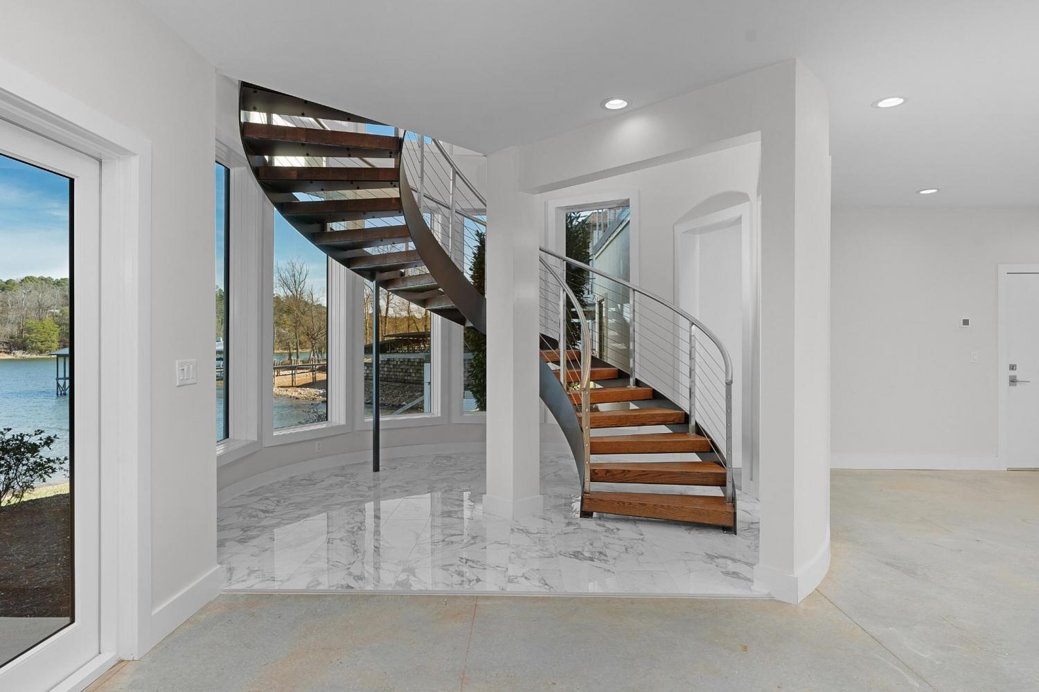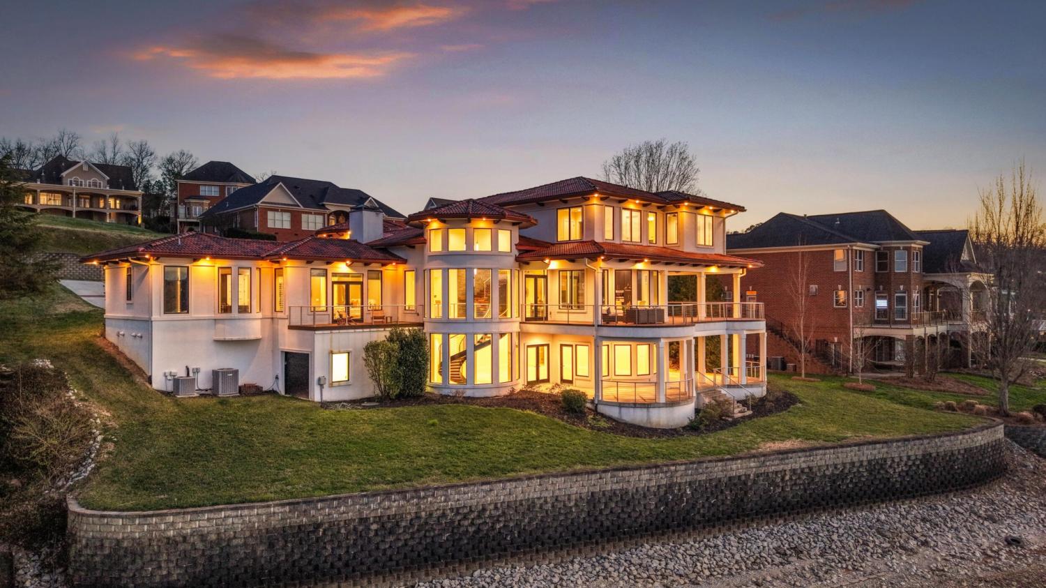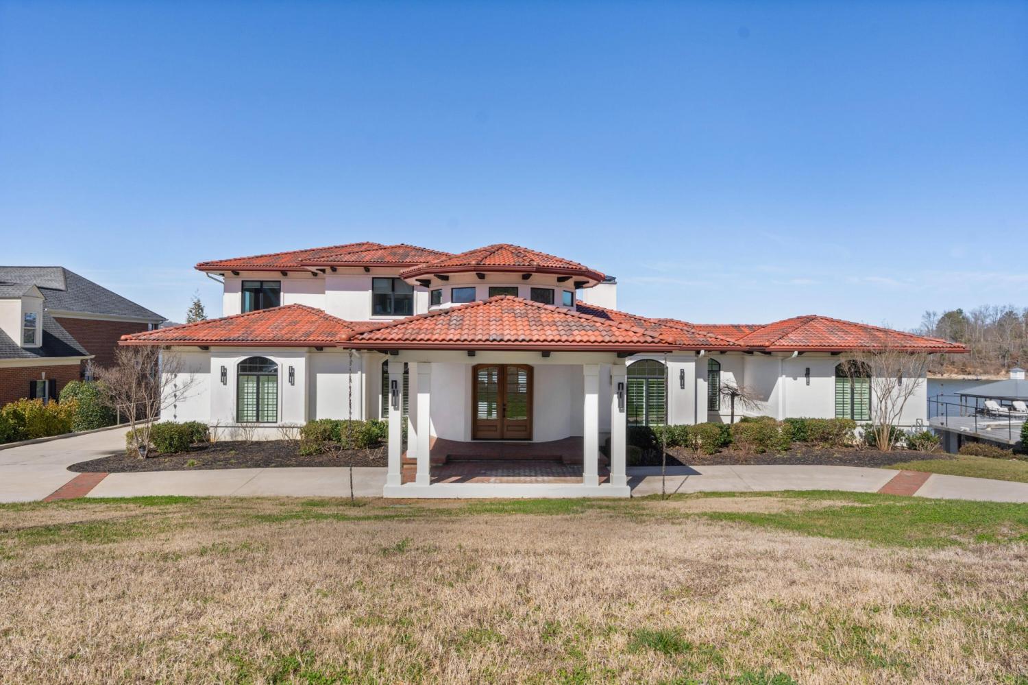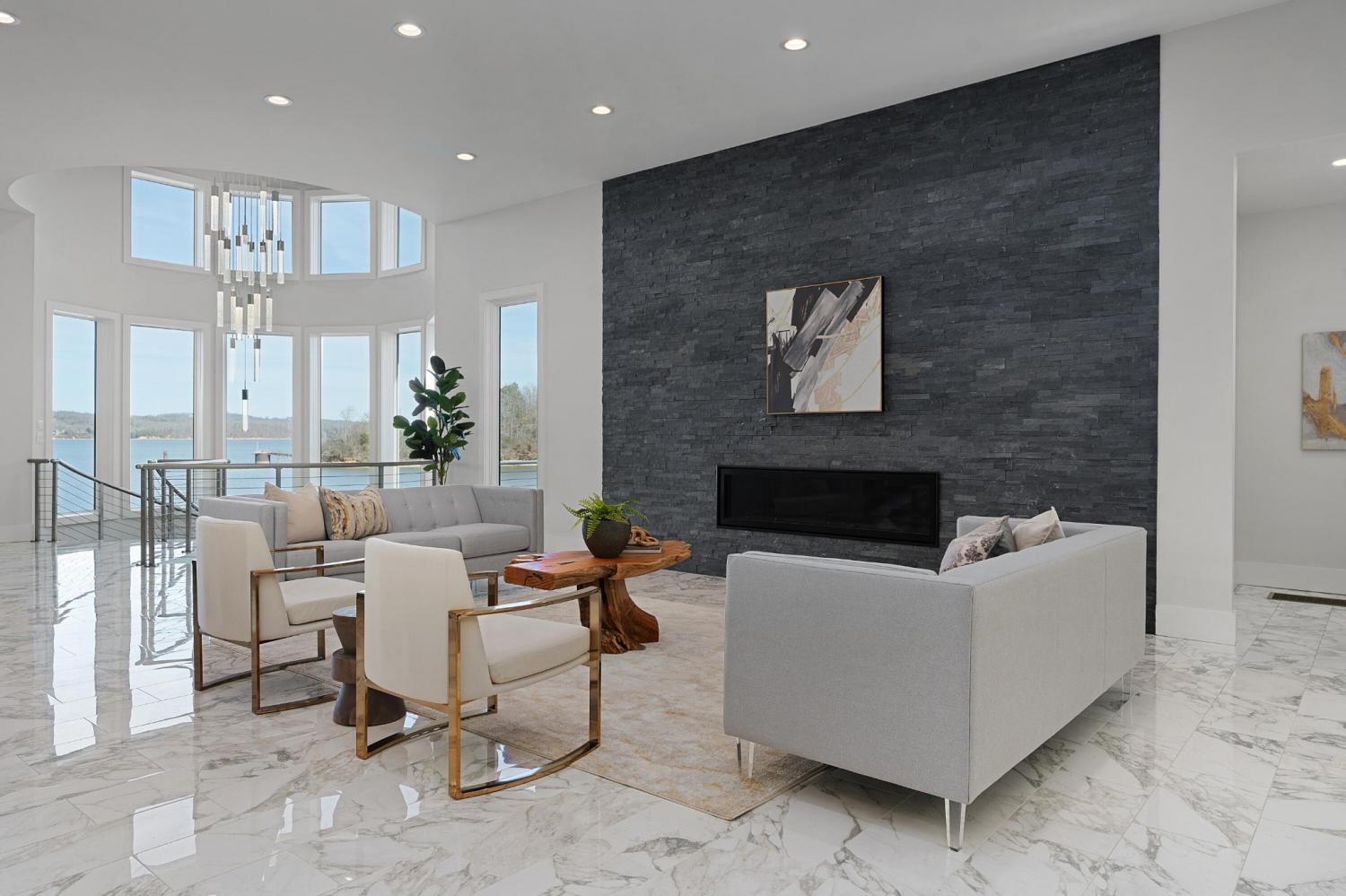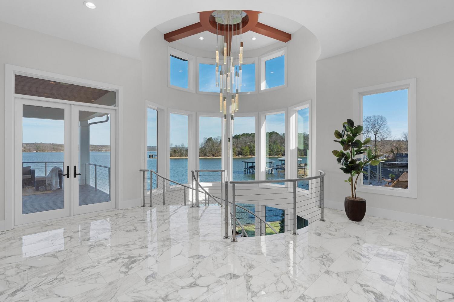 Luxury Lakefront Living! 6 bedrooms 6.5 bath custom home on Chickamauga Lake in the gated Windward Pointe neighborhood approximately 20 minutes from downtown Chattanooga. Premium finishes include marble tile floors, stone countertops, specialty ceilings, architecturally distinctive staircases and lighting, plantation shutters, casement windows, fantastic outdoor living spaces with sweeping views of the water, a double garage, a porte-cochere entry and a utility garage in the daylight basement. The main level has an open floor plan with a large circular foyer and dramatic lighting that sets the tone for the rest of this impressive, modern home. There is an office or sitting area to the right, a spacious great room with a tile accent wall with an inset fireplace, a formal dining room, a well-appointed kitchen with a large island, soft-close and pull-out drawers, under-cabinet and pendant lighting, high-end appliance, a breakfast area and a pantry in the hallway. This space has access to the covered deck that spans the back of the house and provides the perfect flow for both everyday living and entertaining. Just down the hall, you will find the powder room, mudroom with access to the garage for easy loading and unloading, the laundry room, and a guest bedroom suite with access to the deck. The primary suite is on the opposite side of the house and boasts a private deck, a walk-in closet with organizer system, and a beautiful primary bath with separate floating vanities, a deep copper tub positioned and a separate shower with steam, rain head, body sprays and a picture window to take advantage of the views. The upper level has a landing area that would be perfect for an office space and 3 additional bedrooms with walk-in closets and private baths - all with floating vanities and tiled showers. Head downstairs via the sweeping wood and metal staircase where you will find a huge family or rec room that is stubbed for a refreshment center and has multiple doors to the cov