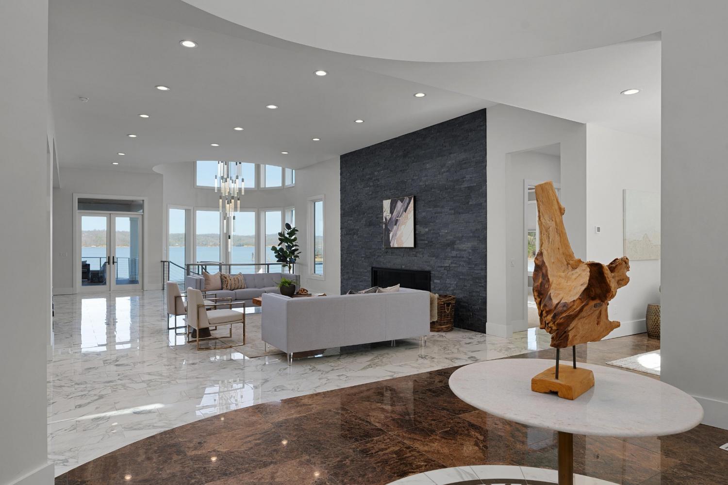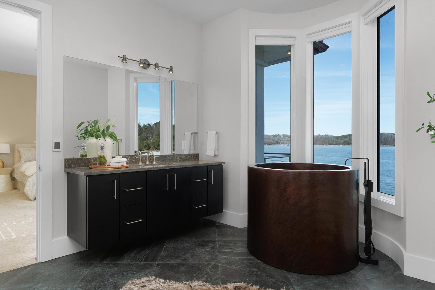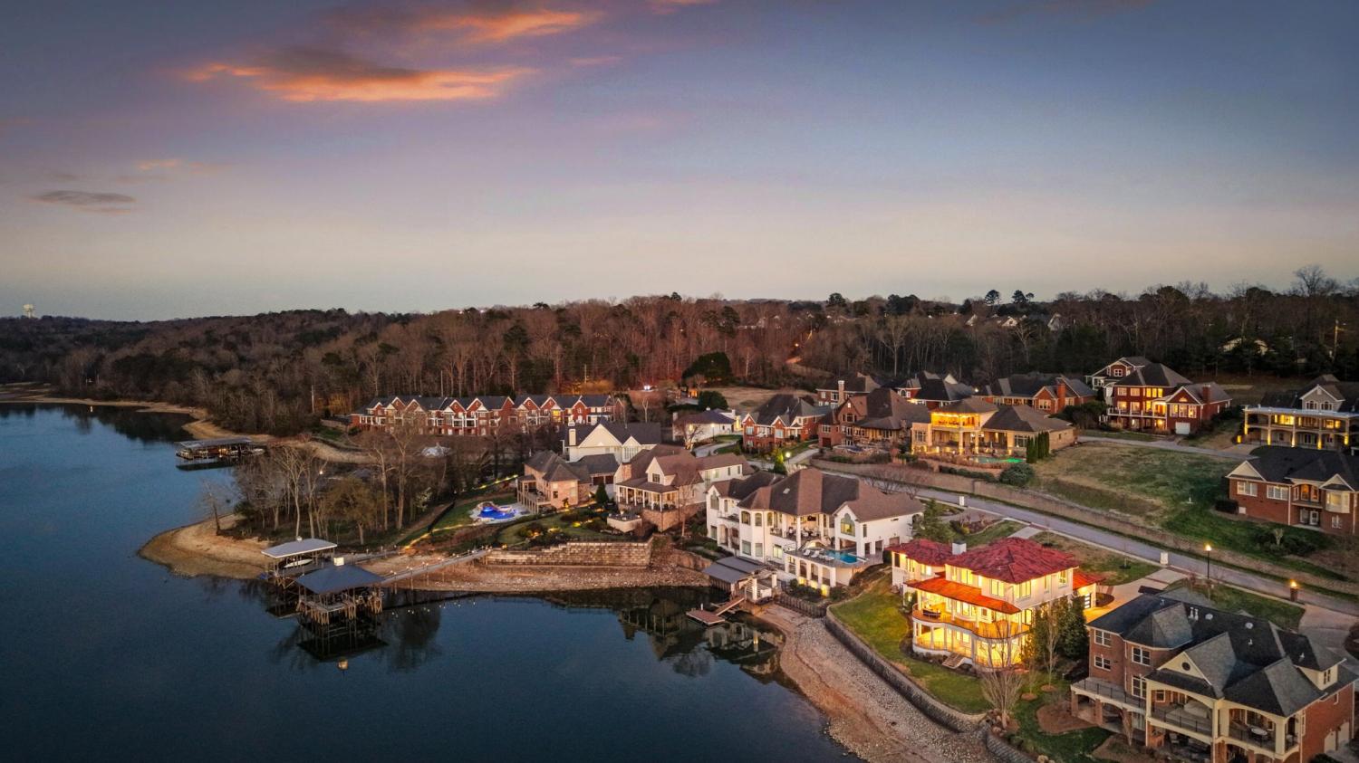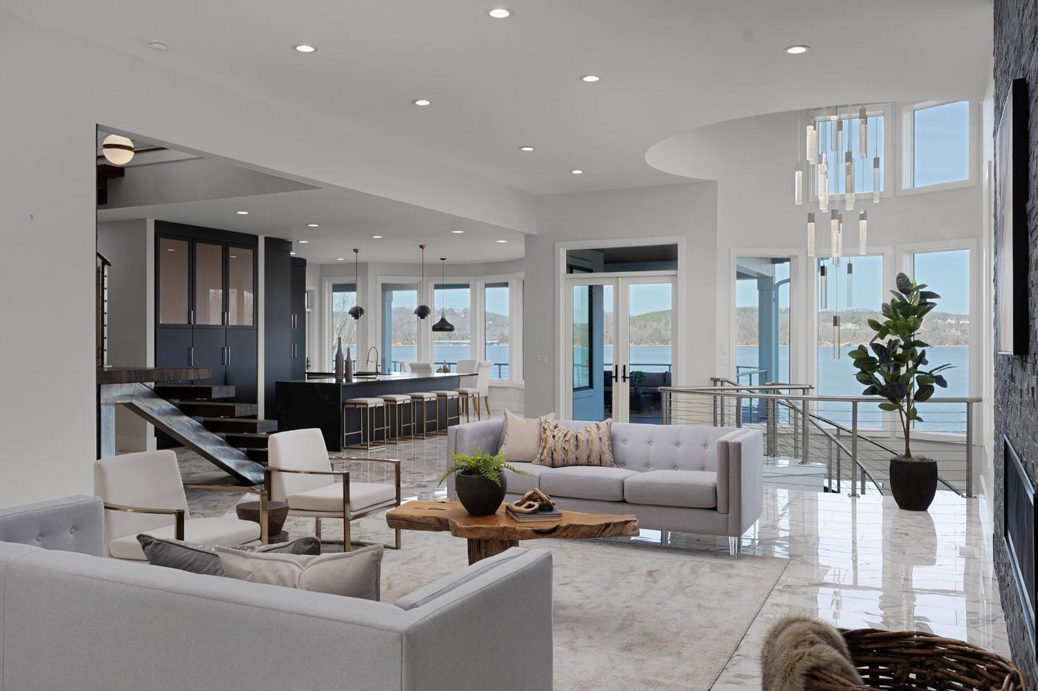 Luxury Lakefront Living! 6 bedrooms 6.5 bath custom home on Chickamauga Lake in the gated Windward Pointe neighborhood approximately 20 minutes from downtown Chattanooga. Premium finishes include marble tile floors, stone countertops, specialty ceilings, architecturally distinctive staircases and lighting, plantation shutters, casement windows, fantastic outdoor living spaces with sweeping views of the water, a double garage, a porte-cochere entry and a utility garage in the daylight basement. The main level has an open floor plan with a large circular foyer and dramatic lighting that sets the tone for the rest of this impressive, modern home. There is an office or sitting area to the right, a spacious great room with a tile accent wall with an inset fireplace, a formal dining room, a well-appointed kitchen with a large island, soft-close and pull-out drawers, under-cabinet and pendant lighting, high-end appliance, a breakfast area and a pantry in the hallway. This space has access to the covered deck that spans the back of the house and provides the perfect flow for both everyday living and entertaining. Just down the hall, you will find the powder room, mudroom with access to the garage for easy loading and unloading, the laundry room, and a guest bedroom suite with access to the deck. The primary suite is on the opposite side of the house and boasts a private deck, a walk-in closet with organizer system, and a beautiful primary bath with separate floating vanities, a deep copper tub positioned and a separate shower with steam, rain head, body sprays and a picture window to take advantage of the views. The upper level has a landing area that would be perfect for an office space and 3 additional bedrooms with walk-in closets and private baths - all with floating vanities and tiled showers. Head downstairs via the sweeping wood and metal staircase where you will find a huge family or rec room that is stubbed for a refreshment center and has multiple doors to the cov