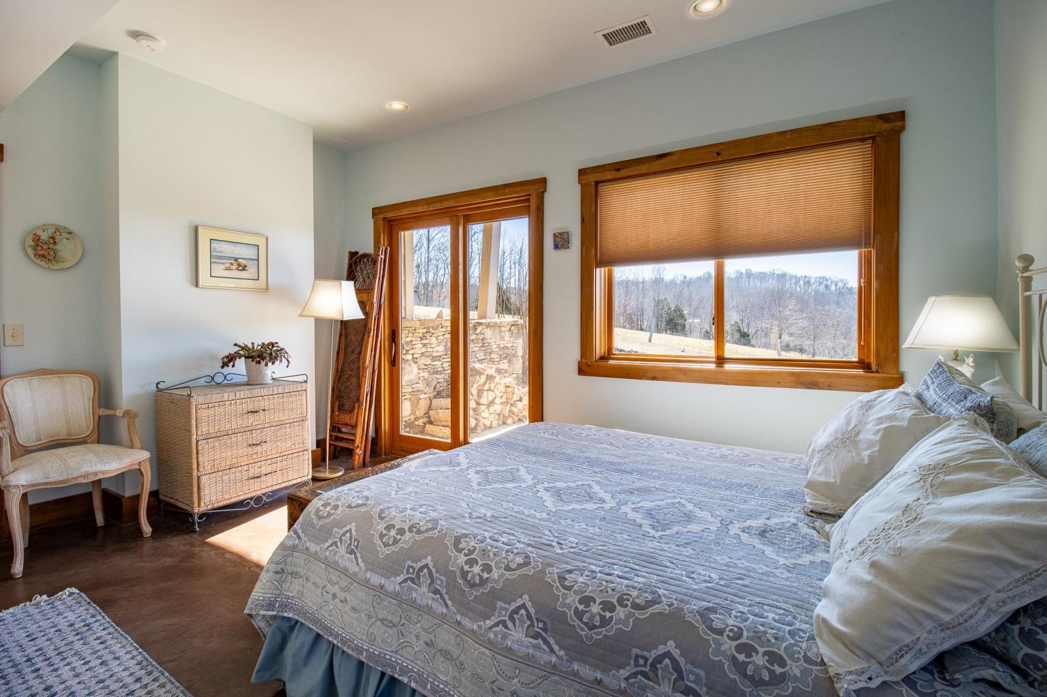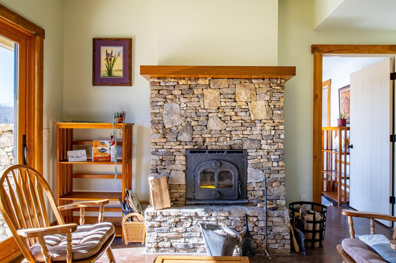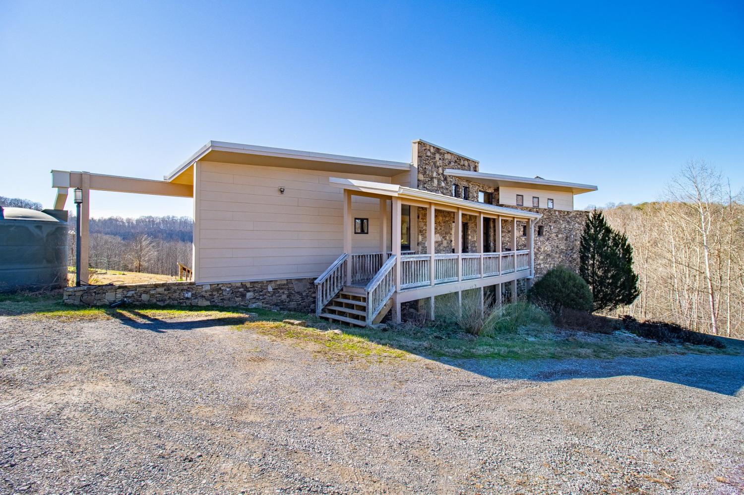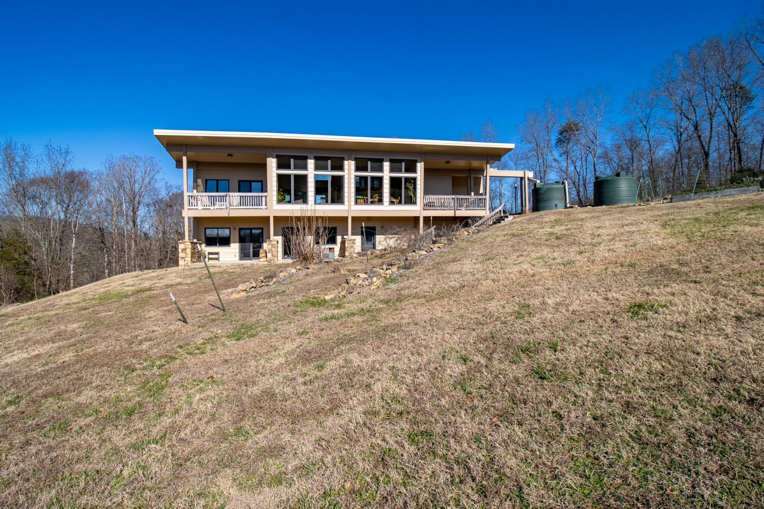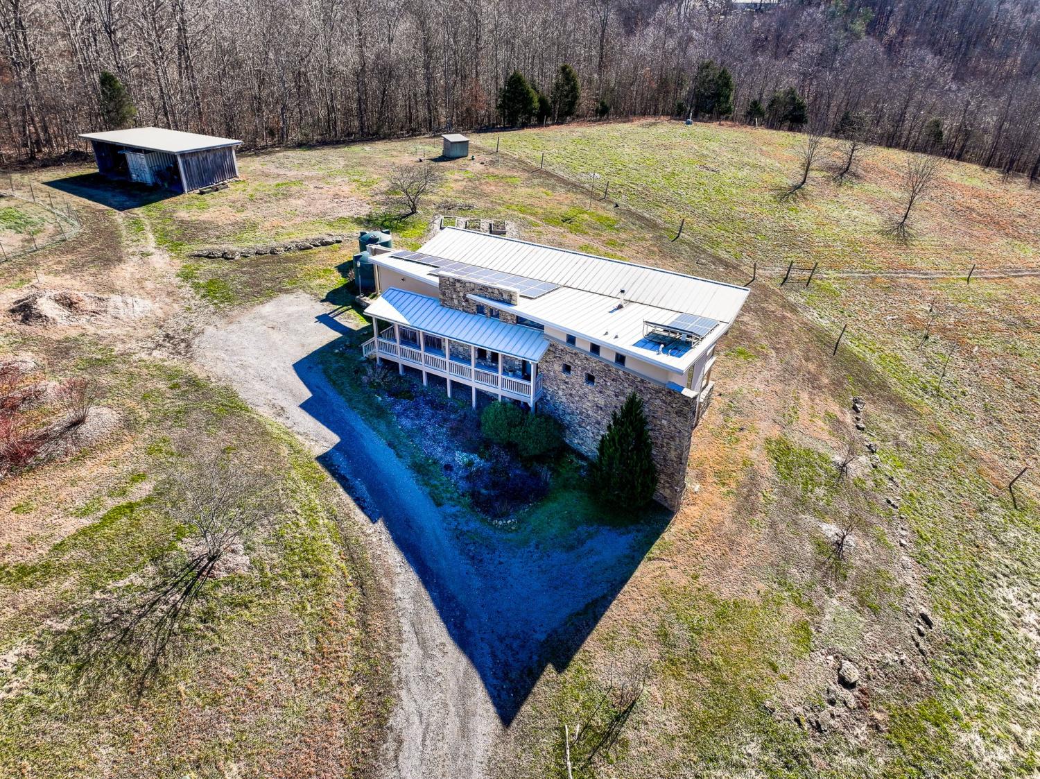 Grow Your Own Food. Produce Your Own Power. Live Exceptionally Well, Nestled in Nature. This LEED Platinum–certified home blends sustainability, craftsmanship, and agricultural abundance. Designed by Exoterra Architects and built by Ryan Nichols with Green Home, it exemplifies stewardship focusing on resource efficiency, resilience, and cultivates an intimate connection with the land. The main level features a vaulted ceiling, open floor plan, and expansive views of rolling hills and pasture. The primary suite on the main level offers dual vanities, tiled walk-in shower, and a south-facing porch overlooking dry-stacked stone terraces and gardens. Constructed with reclaimed materials throughout, the home showcases custom oak kitchen cabinetry, oak flooring and recycled glass countertops. The lower level opens to grade and includes a sitting room with a Morso wood-burning stove, laundry room, built-in root cellar, full bath, and second bedroom with walk-out patio. Exterior finishes include locally harvested fieldstone and Nichiha siding. This home works WITH nature and resource resilience is built in with solar array, geothermal HVAC system, three EV charging stations, Ford home integration system (use a compatible Ford truck as backup power), passive solar design that captures winter sun and stays shaded in summer, rainwater harvesting system and energy star appliances. A rare highlight is the mature blueberry grove, producing hundreds of pounds annually. The property also features a 5-year-old chestnut orchard with 25 trees, fenced fields, muscadine grape vines, and established gardens—ideal for farm-to-table living. A 20' x 40' two-bay farm shed with an enclosed shipping container provides excellent storage or workshop space. See 3D tour. Listing agent can meet for a guided tour of the home and land with advanced scheduling.
