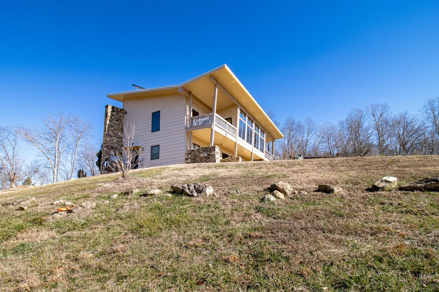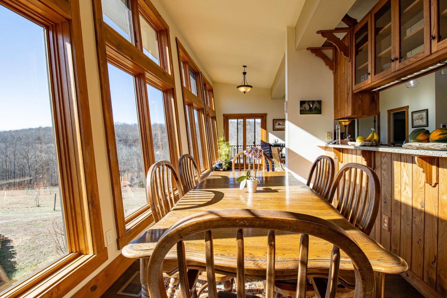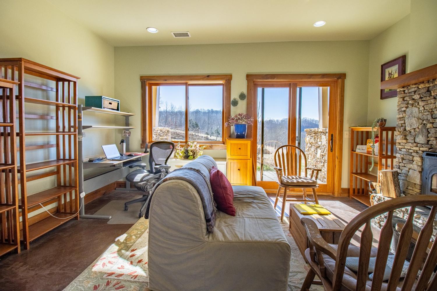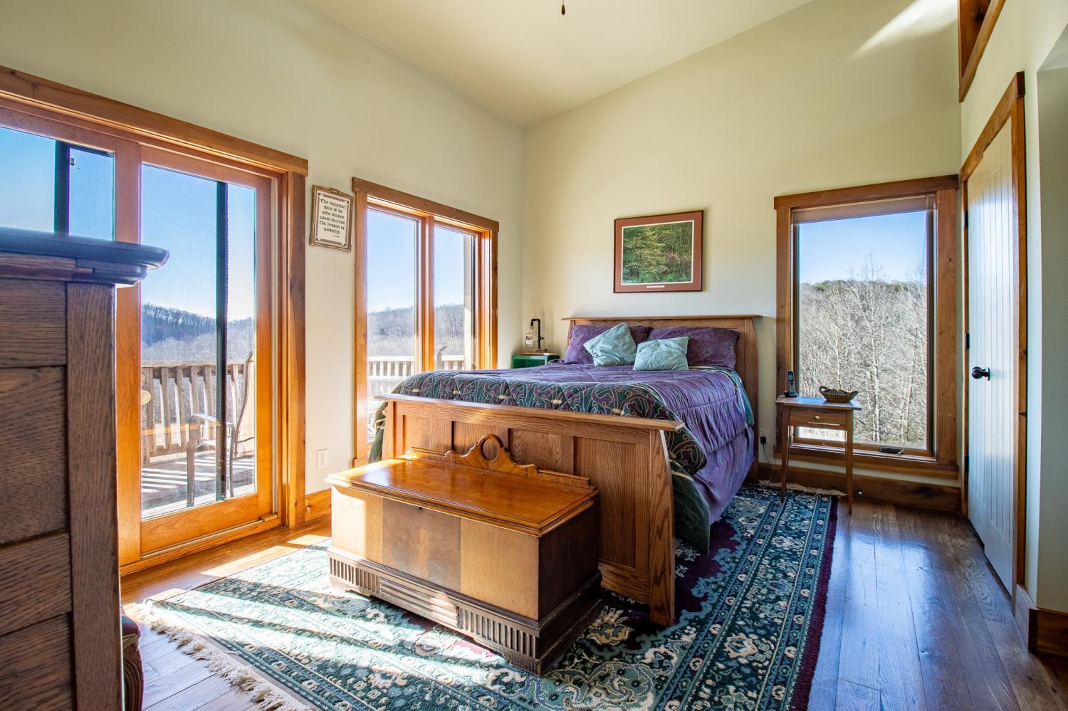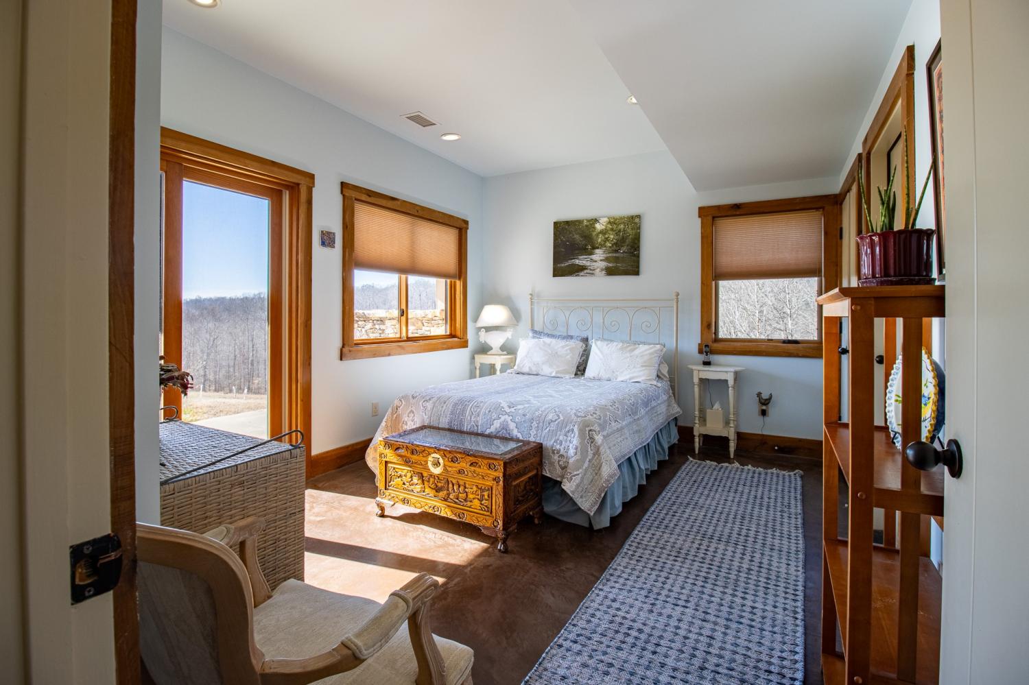 Grow Your Own Food. Produce Your Own Power. Live Exceptionally Well, Nestled in Nature. This LEED Platinum–certified home blends sustainability, craftsmanship, and agricultural abundance. Designed by Exoterra Architects and built by Ryan Nichols with Green Home, it exemplifies stewardship focusing on resource efficiency, resilience, and cultivates an intimate connection with the land. The main level features a vaulted ceiling, open floor plan, and expansive views of rolling hills and pasture. The primary suite on the main level offers dual vanities, tiled walk-in shower, and a south-facing porch overlooking dry-stacked stone terraces and gardens. Constructed with reclaimed materials throughout, the home showcases custom oak kitchen cabinetry, oak flooring and recycled glass countertops. The lower level opens to grade and includes a sitting room with a Morso wood-burning stove, laundry room, built-in root cellar, full bath, and second bedroom with walk-out patio. Exterior finishes include locally harvested fieldstone and Nichiha siding. This home works WITH nature and resource resilience is built in with solar array, geothermal HVAC system, three EV charging stations, Ford home integration system (use a compatible Ford truck as backup power), passive solar design that captures winter sun and stays shaded in summer, rainwater harvesting system and energy star appliances. A rare highlight is the mature blueberry grove, producing hundreds of pounds annually. The property also features a 5-year-old chestnut orchard with 25 trees, fenced fields, muscadine grape vines, and established gardens—ideal for farm-to-table living. A 20' x 40' two-bay farm shed with an enclosed shipping container provides excellent storage or workshop space. See 3D tour. Listing agent can meet for a guided tour of the home and land with advanced scheduling.