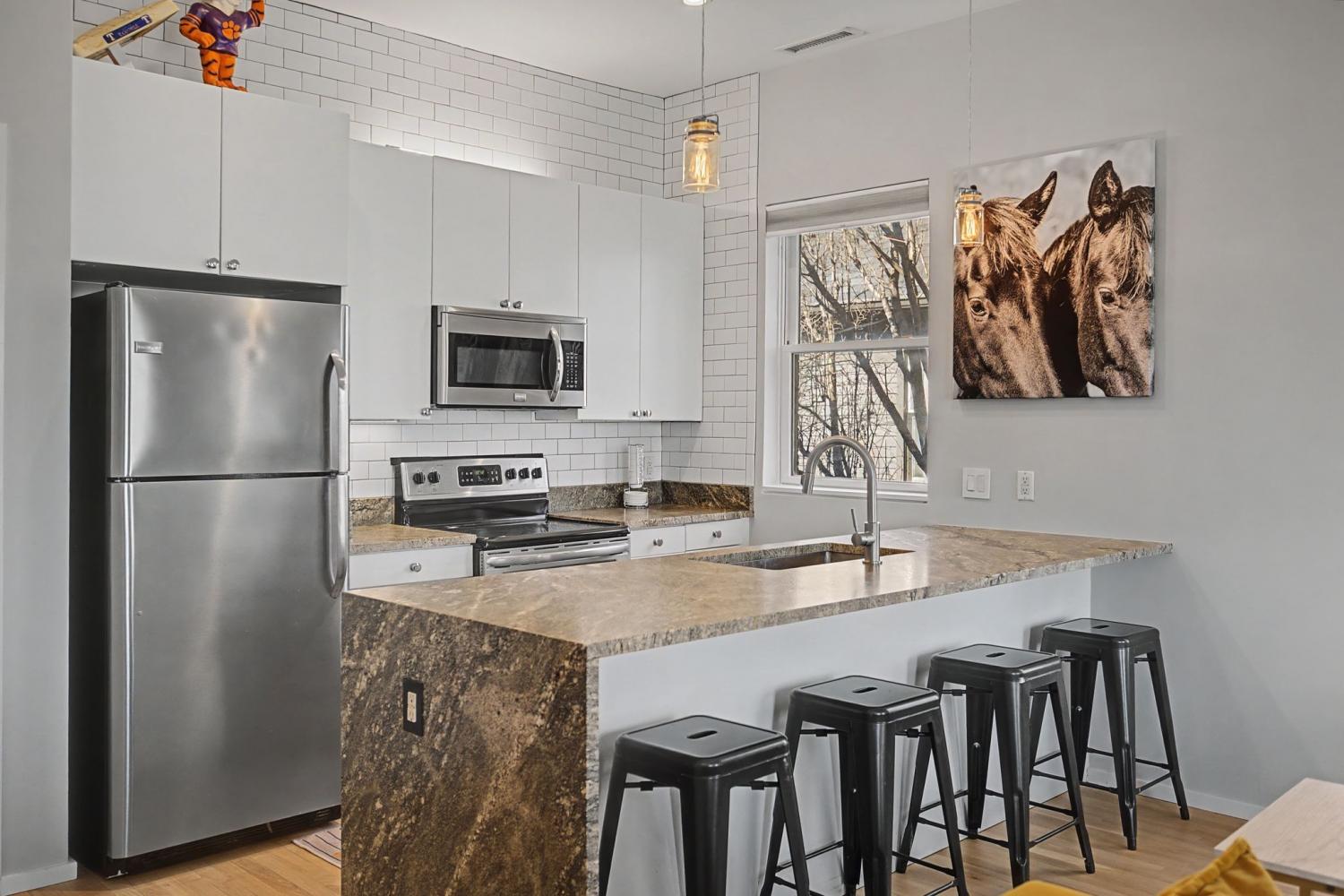 Some addresses change how you experience a city. In Germantown, mornings begin beneath a canopy of mature trees and evenings unfold a few blocks away at one of Nashville’s most celebrated restaurants. Downtown’s skyline sits just one mile south, yet the pace here remains calm, residential, and quietly refined. Residence 414 at 1200 4th Ave North offers a polished retreat in the center of it all. Located in an elevator building with dedicated off street parking, the home delivers true lock and leave convenience without sacrificing sophistication. This beautifully updated one bedroom, one bath condo spans approximately 820 square feet of efficient, elevated living. Fresh paint throughout creates a clean, gallery like backdrop, while a custom trim accent wall introduces warmth and architectural presence. The open layout feels intentional and airy, equally suited for intimate dinners or relaxed evenings at home. The kitchen is anchored by a waterfall edge island that adds sculptural impact and everyday function. It is a natural gathering point for espresso at sunrise or wine before walking to dinner. Natural light filters through the main living area, enhancing the sense of calm and understated luxury. Step outside and the neighborhood becomes an extension of your living room. Within blocks are more than a dozen acclaimed restaurants, including concepts led by James Beard Award winning chefs and one Michelin starred destination. Coffee shops, boutique fitness studios, parks, and cocktail bars are woven into a walkable grid that encourages spontaneity and connection. Here, you can park the car and forget it. Spend the day in meetings downtown, return home in minutes, then stroll out again for dinner without ever feeling rushed. It is city living distilled to its most enjoyable form. A refined urban residence offering style, simplicity, and one of Nashville’s most desirable addresses.