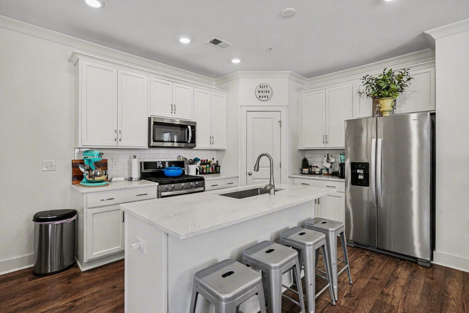 This lovely brick front home features an open floorplan with large great room, white kitchen with quartz countertops and eat in nook as well as a downstairs Master with en suite bath/double vanities/water closet. Upstairs has a GIANT bonus loft with gorgeous custom built ins/shelving and 2 large bedrooms and full bath. You'll be pleasantly surprised at the generous amount of storage in this home, the craftsman trim and designer finishes throughout. The covered back porch enjoys privacy with the fully fenced back yard and easy access to the single car garage.