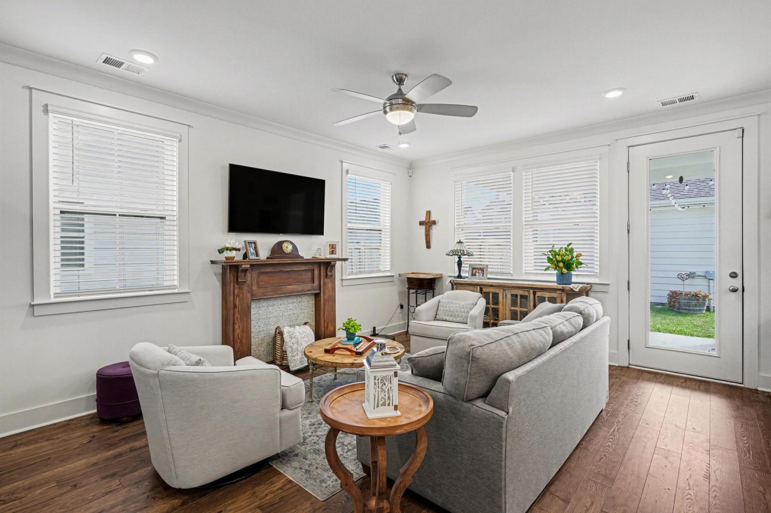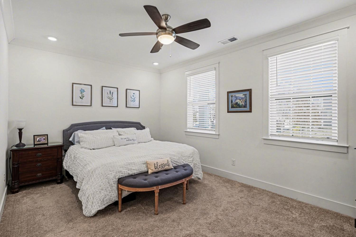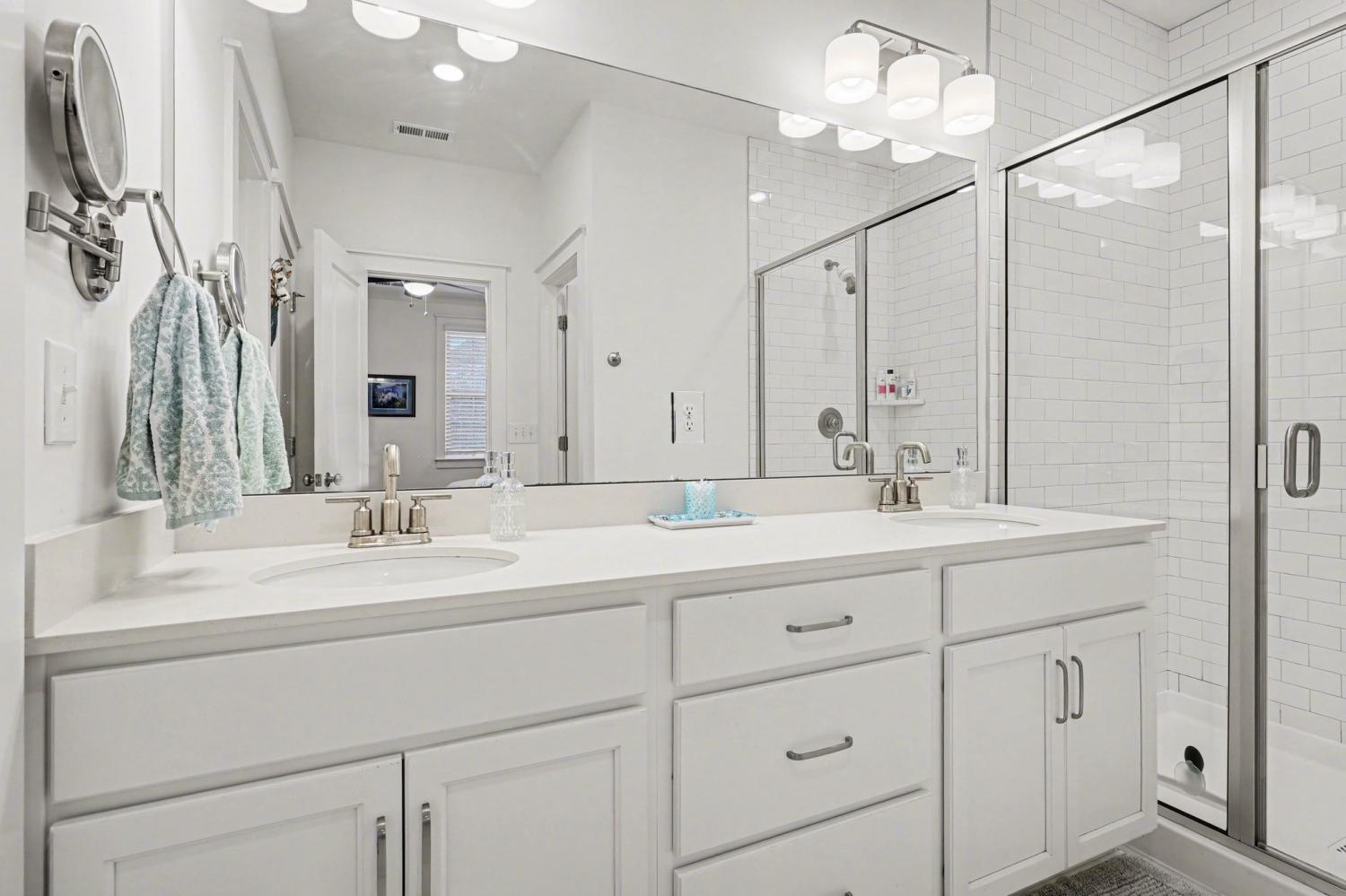 This lovely brick front home features an open floorplan with large great room, white kitchen with quartz countertops and eat in nook as well as a downstairs Master with en suite bath/double vanities/water closet. Upstairs has a GIANT bonus loft with gorgeous custom built ins/shelving and 2 large bedrooms and full bath. You'll be pleasantly surprised at the generous amount of storage in this home, the craftsman trim and designer finishes throughout. The covered back porch enjoys privacy with the fully fenced back yard and easy access to the single car garage.