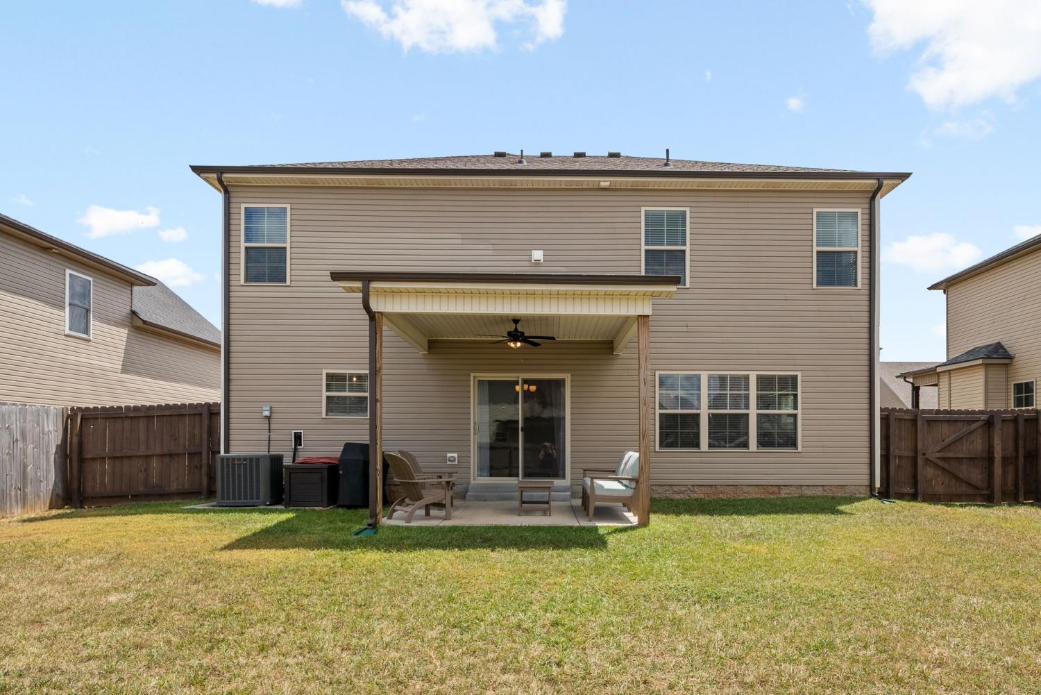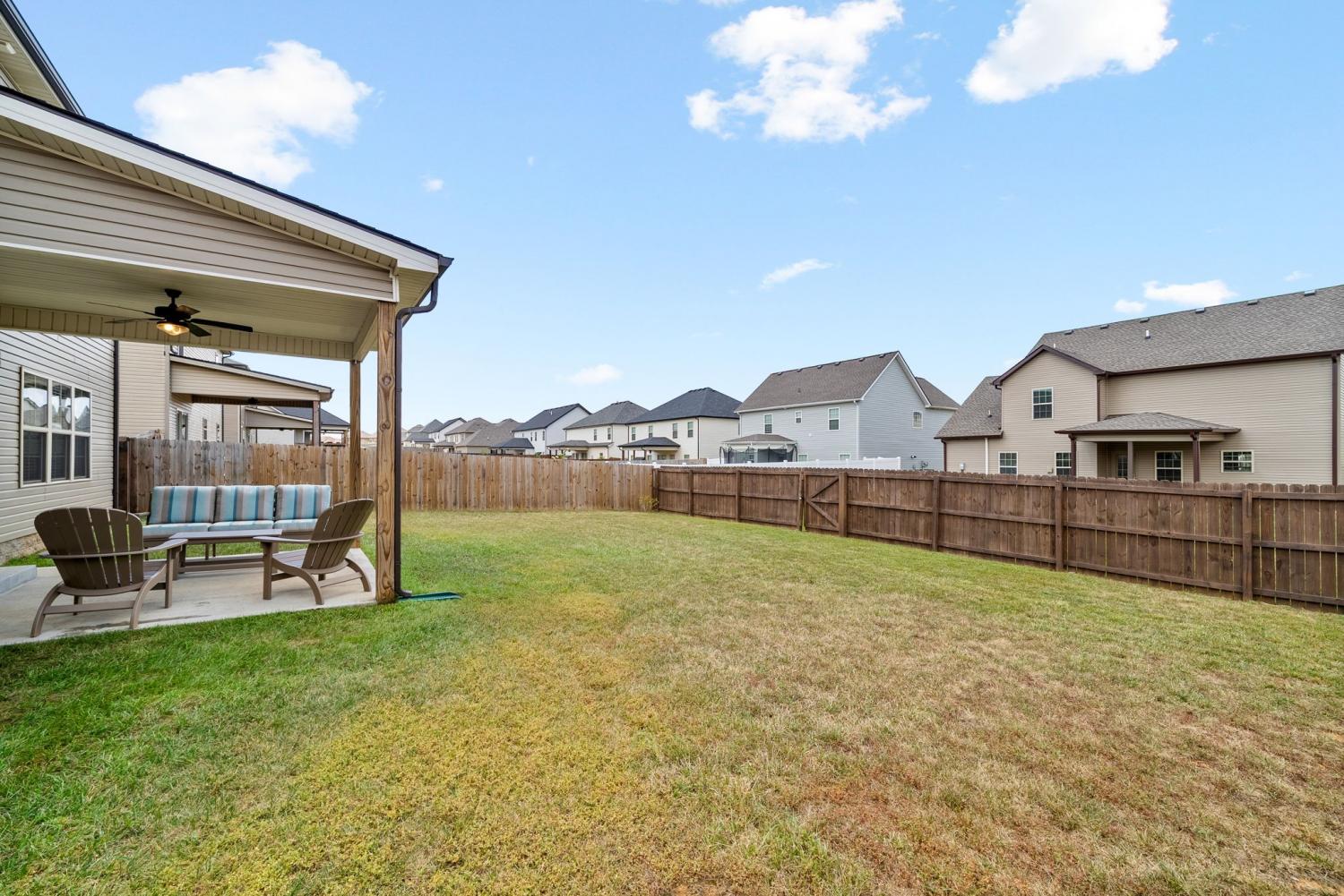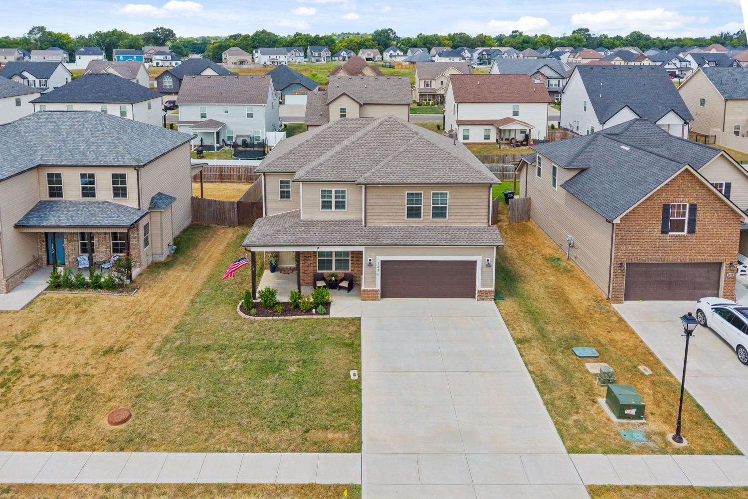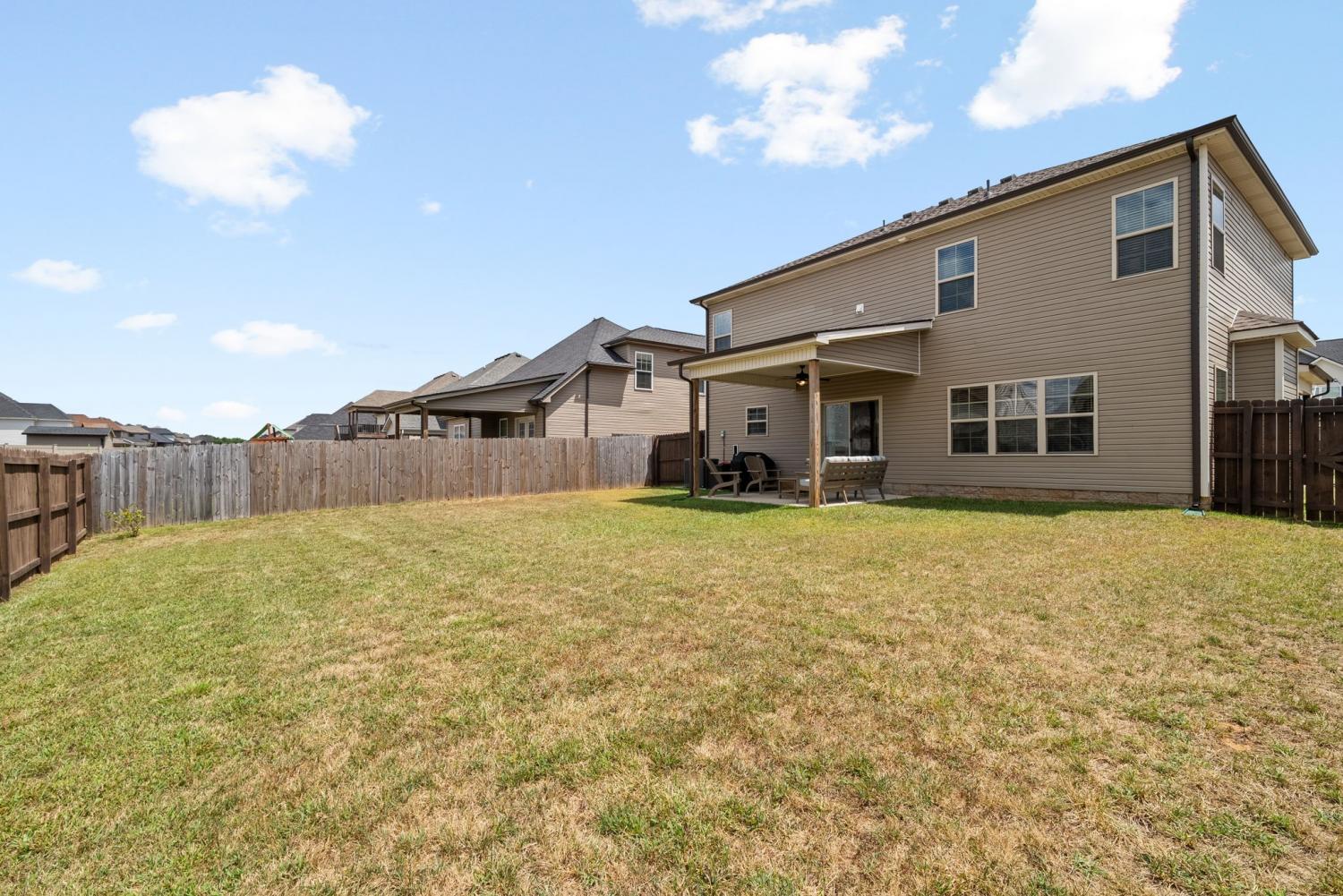 IMMACULATE 4-Bedroom home with custom upgrades and prime location. BETTER THAN NEW and meticulously maintained, this exceptional home offers a spacious open-concept layout on a level lot with thoughtfully curated finishes throughout. From the welcoming foyer, you’ll immediately notice the quality craftsmanship and attention to detail. The main living area is filled with natural lighting, and anchored by a stunning shiplap fireplace. The ceiling features wood accent beams, creating warmth and character. The seamless flow into the kitchen makes entertaining effortless. Designed as the heart of the home, the kitchen features custom cabinetry, ample counter space, and an ideal layout for both daily living and gatherings. A versatile main-level flex room provides the perfect space for a home office, guest suite, playroom, or additional living area to suit your needs. Upstairs, the oversized primary suite serves as a private retreat, complete with a spa-inspired en-suite bath featuring a beautifully tiled shower, double vanity, and an expansive walk-in closet. Additional bedrooms are generously sized and thoughtfully positioned for comfort and functionality. Outdoor living is equally impressive, with a covered front porch ideal for relaxing evenings, and a covered rear patio overlooking the fully fenced backyard. Perfect for entertaining, pets, or play! Residents enjoy access to three nearby community playgrounds and a prime location convenient to schools, shopping, I-24, Fort Campbell, Dunbar Cave State Park, and local golf courses.