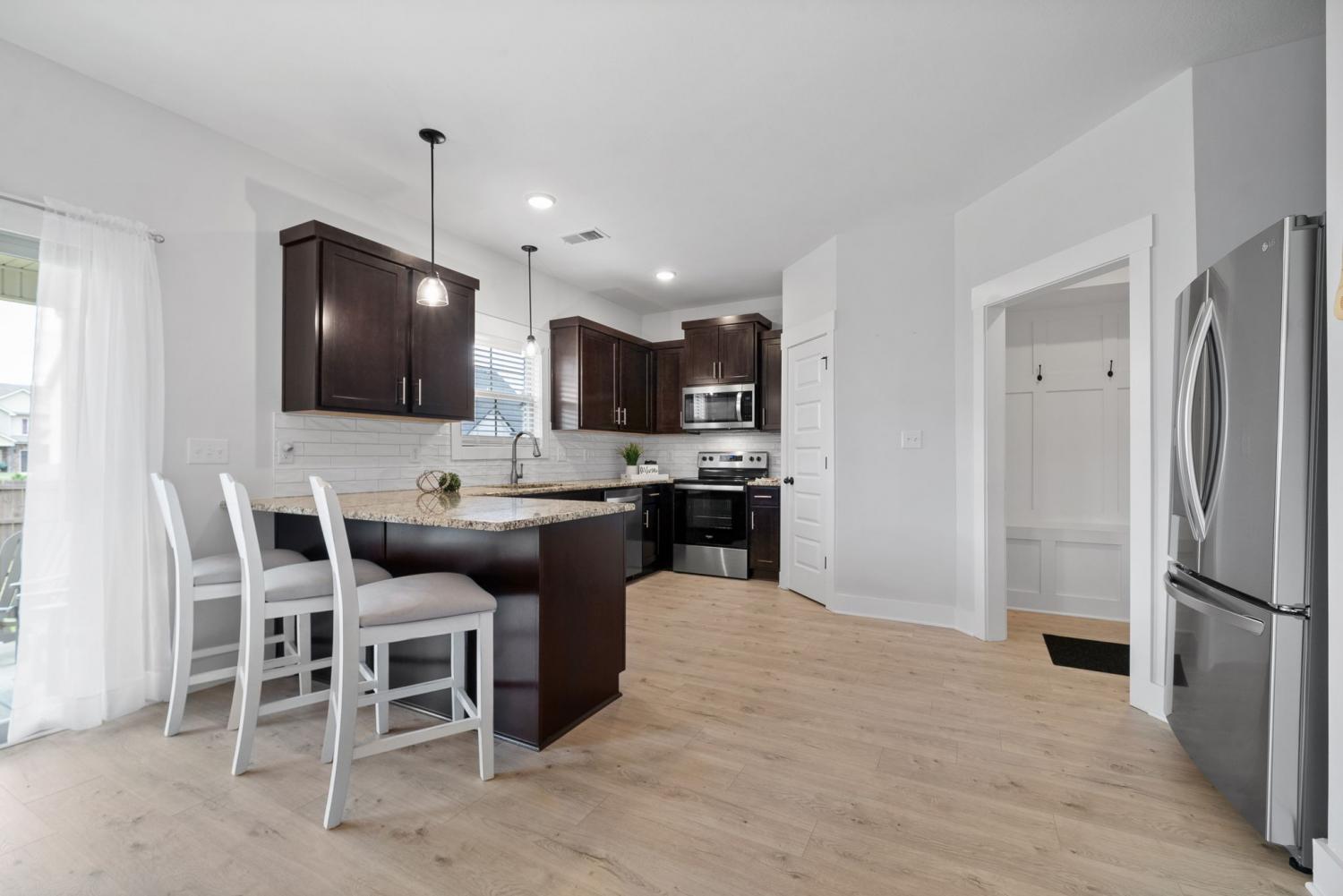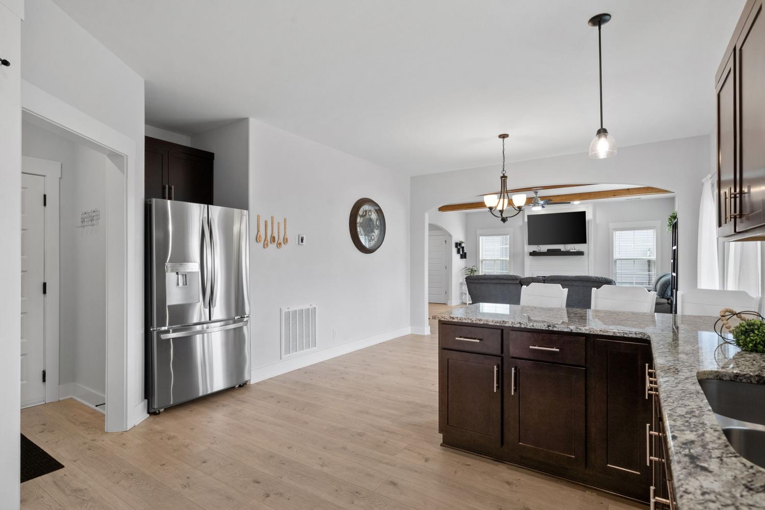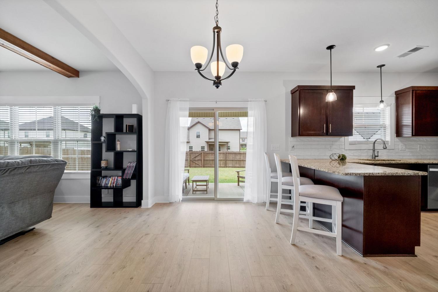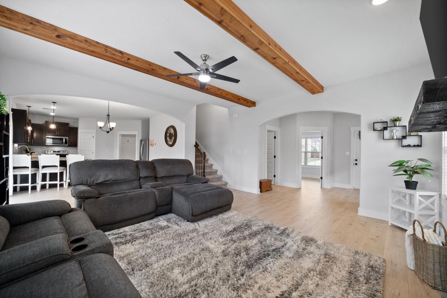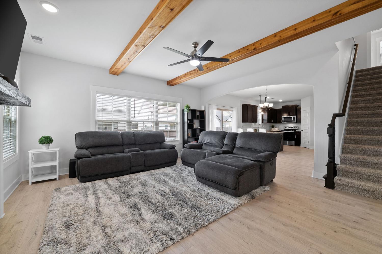 IMMACULATE 4-Bedroom home with custom upgrades and prime location. BETTER THAN NEW and meticulously maintained, this exceptional home offers a spacious open-concept layout on a level lot with thoughtfully curated finishes throughout. From the welcoming foyer, you’ll immediately notice the quality craftsmanship and attention to detail. The main living area is filled with natural lighting, and anchored by a stunning shiplap fireplace. The ceiling features wood accent beams, creating warmth and character. The seamless flow into the kitchen makes entertaining effortless. Designed as the heart of the home, the kitchen features custom cabinetry, ample counter space, and an ideal layout for both daily living and gatherings. A versatile main-level flex room provides the perfect space for a home office, guest suite, playroom, or additional living area to suit your needs. Upstairs, the oversized primary suite serves as a private retreat, complete with a spa-inspired en-suite bath featuring a beautifully tiled shower, double vanity, and an expansive walk-in closet. Additional bedrooms are generously sized and thoughtfully positioned for comfort and functionality. Outdoor living is equally impressive, with a covered front porch ideal for relaxing evenings, and a covered rear patio overlooking the fully fenced backyard. Perfect for entertaining, pets, or play! Residents enjoy access to three nearby community playgrounds and a prime location convenient to schools, shopping, I-24, Fort Campbell, Dunbar Cave State Park, and local golf courses.