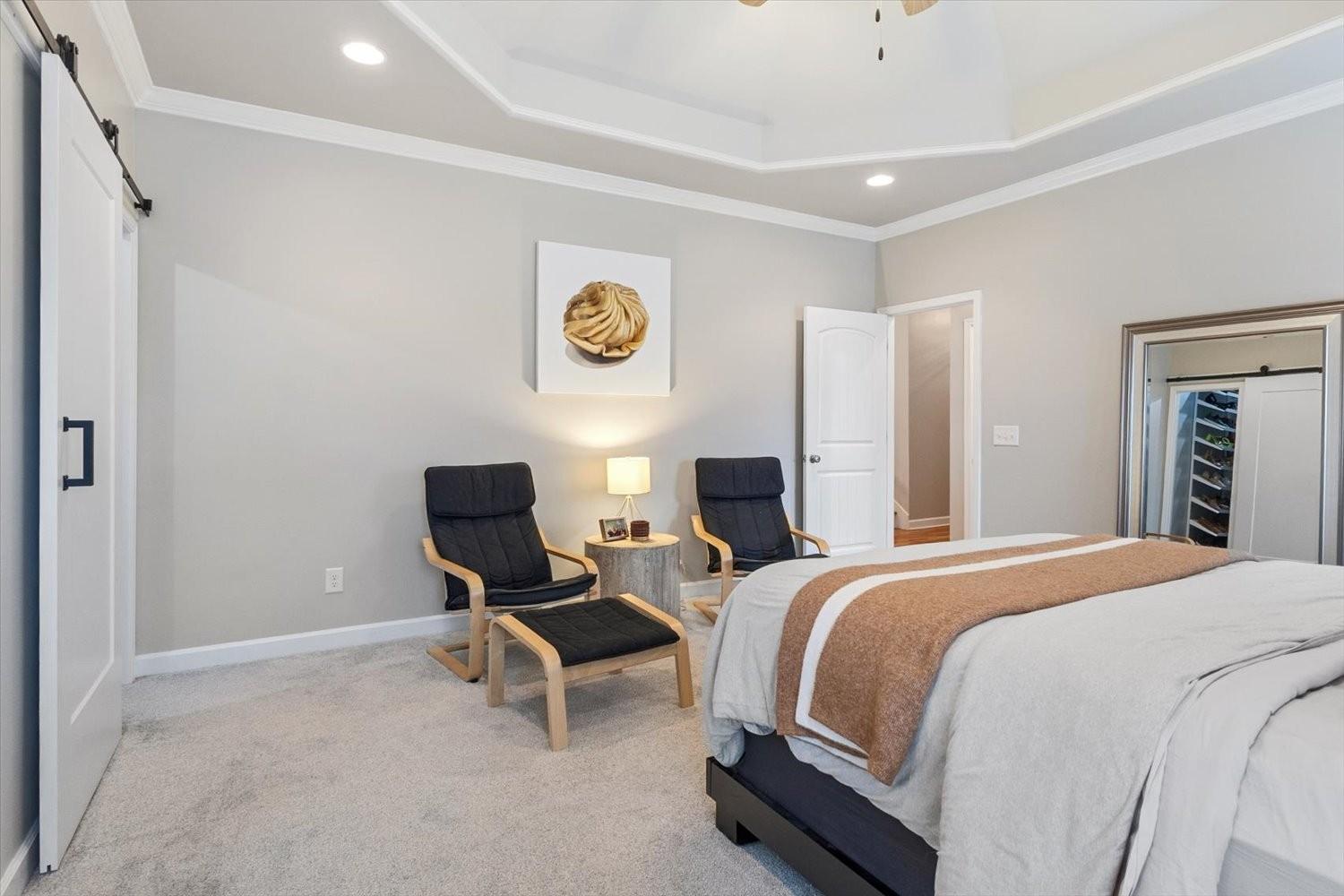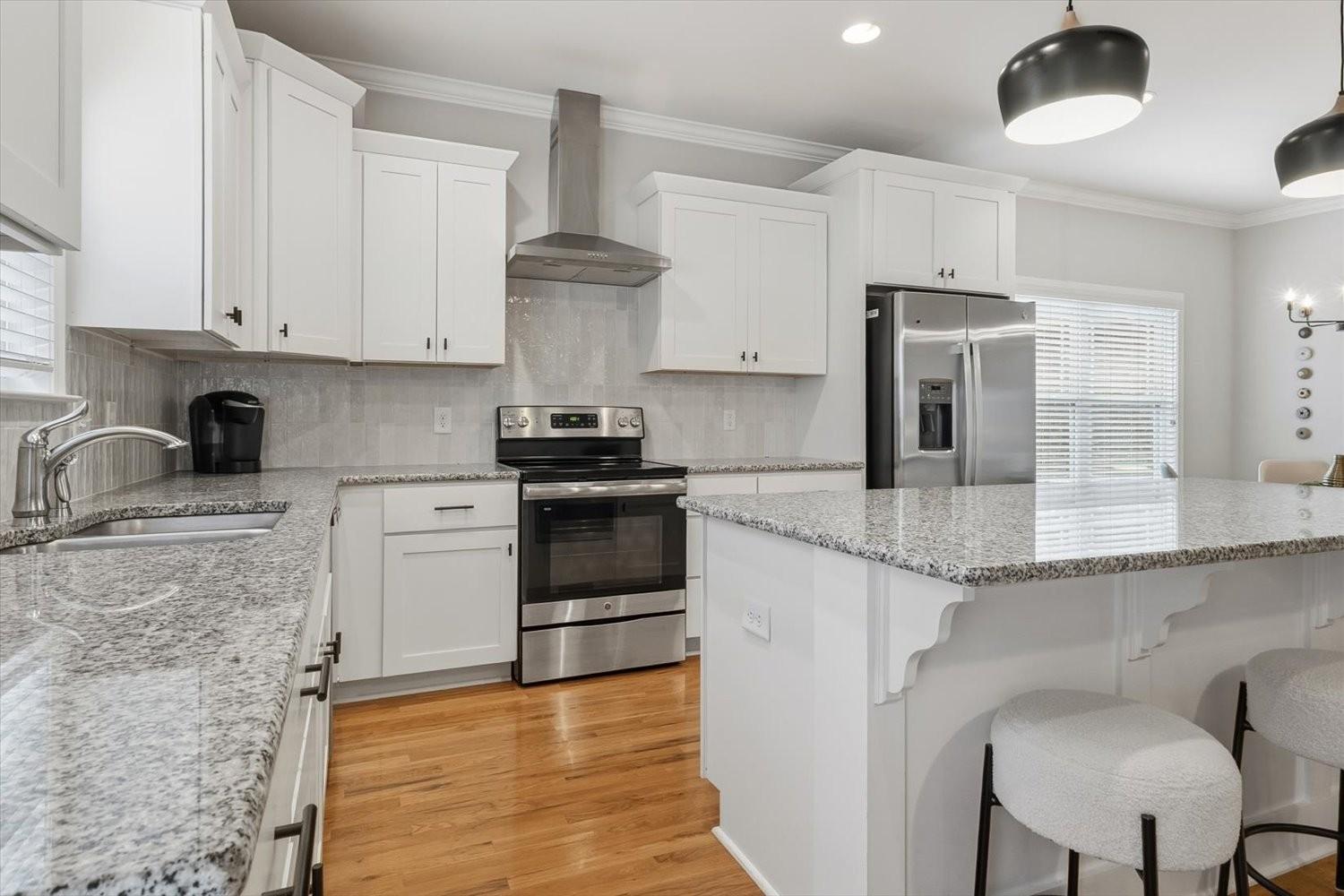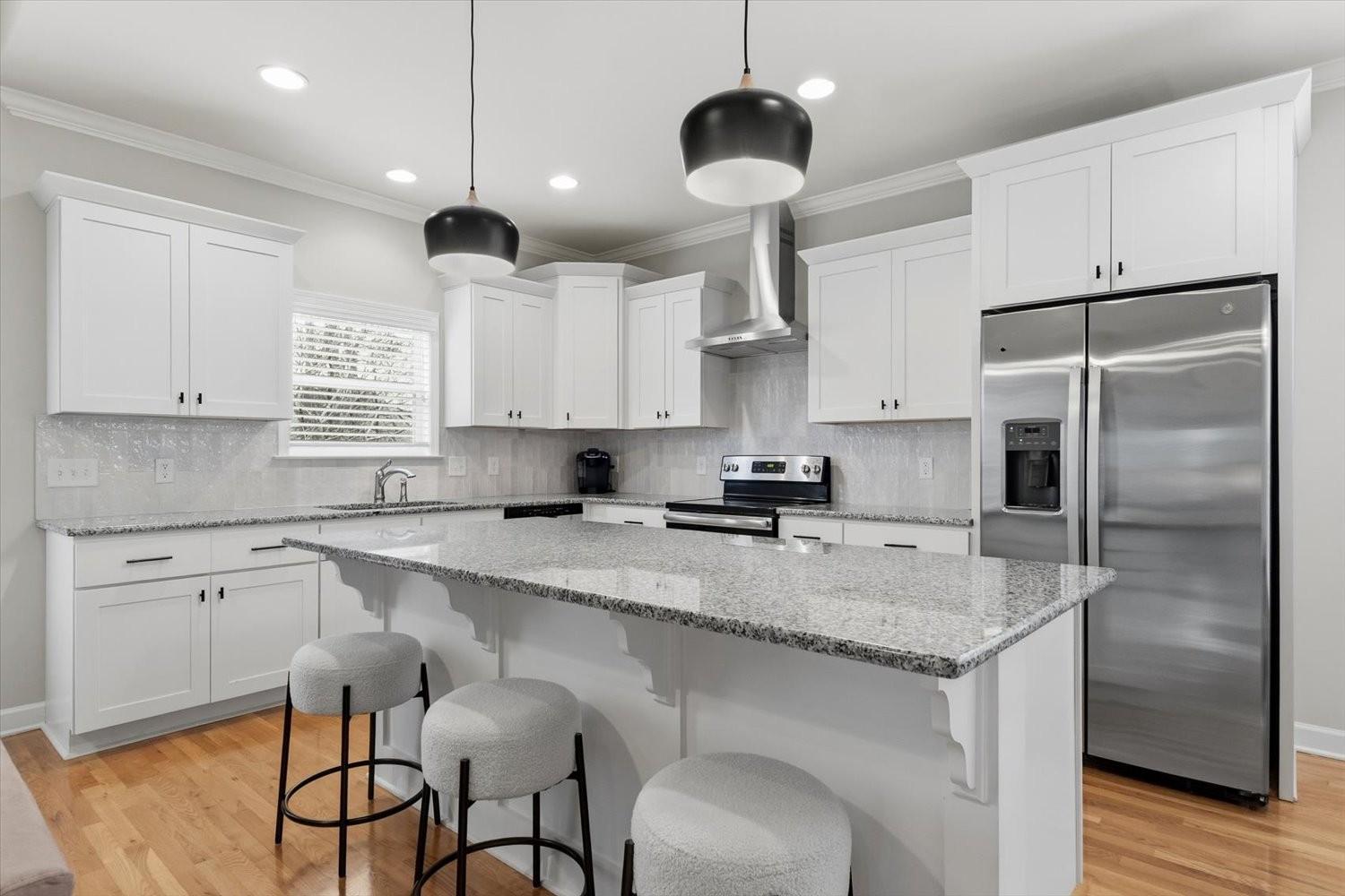 Welcome home to this contemporary remodeled, single-level residence in Wade’s Grove. This newer home offers excellent updated finishes with a convenient floor plan. All bedrooms are conveniently located on the main level, while the spacious upstairs bonus/TV room is tucked away—perfect for enjoying movies or recreational activities without disturbing those resting below. A dry bar upstairs adds an ideal touch for entertaining. From the moment you arrive, you’ll appreciate the flat driveway and inviting Southern-style front porch—perfect for great conversation and memories made. The all-brick exterior not only enhances curb appeal but also provides excellent insulation and energy efficiency. Inside, you’ll find soaring vaulted ceilings and an open-concept layout that connects modern design with function. The contemporary kitchen features updated lighting and stylish fixtures that carry throughout the home. Every closet is outfitted with a custom Container Store organization system, maximizing storage, organization and cleanliness. The primary suite offers a completely remodeled bathroom highlighted by a spacious walk-in shower, creating a retreat atmosphere. Step out back to enjoy a entertaining deck—especially as there is a green space behind the home with plenty of tree cover and privacy. Don’t miss this one-of-a-kind, fully renovated home in Wade’s Grove—where modern collides with timeless Southern charm.