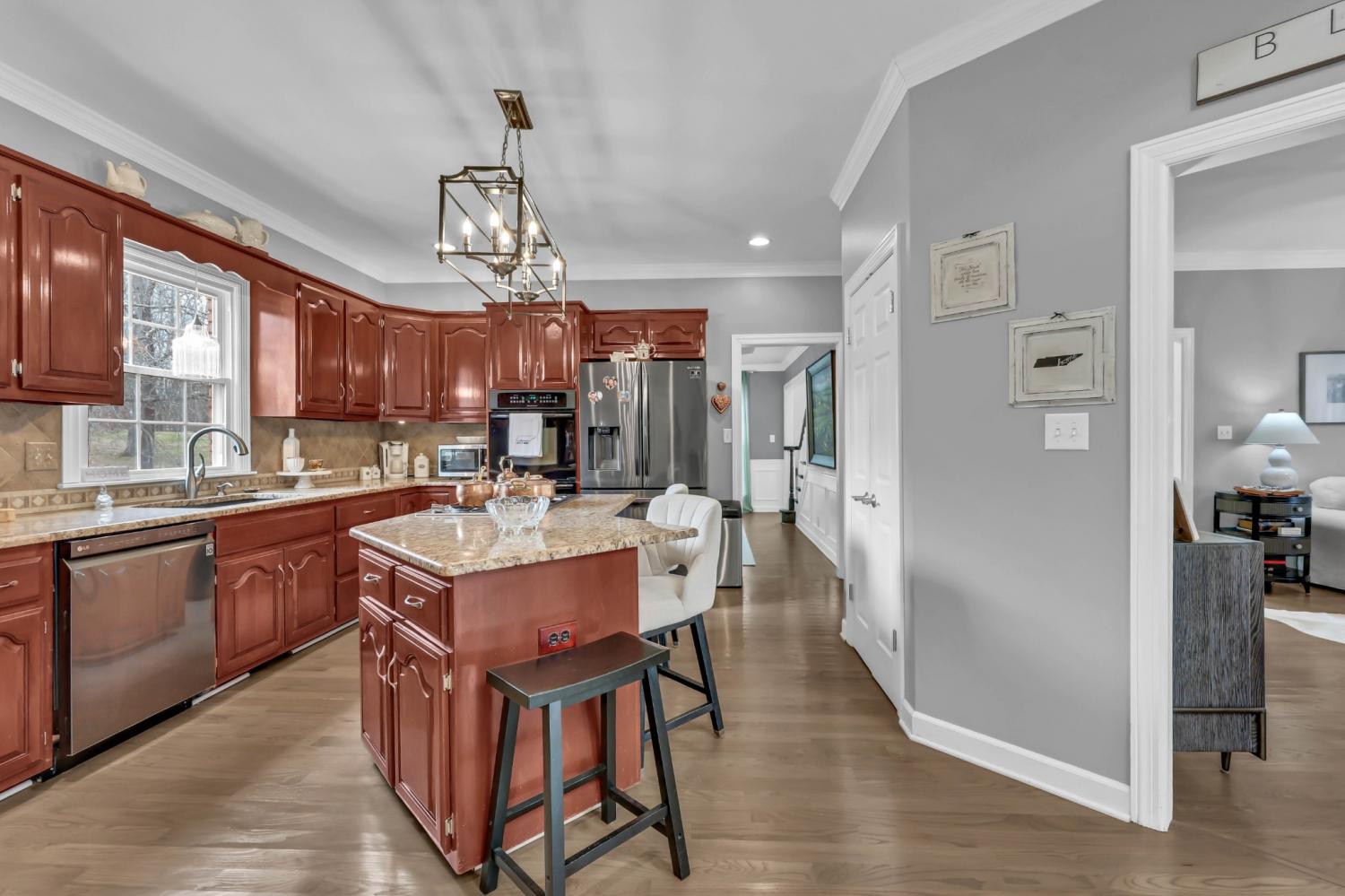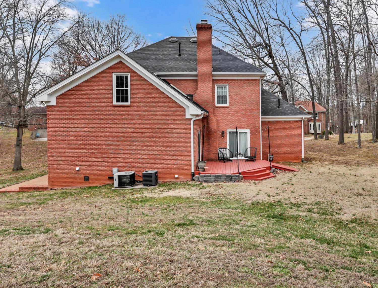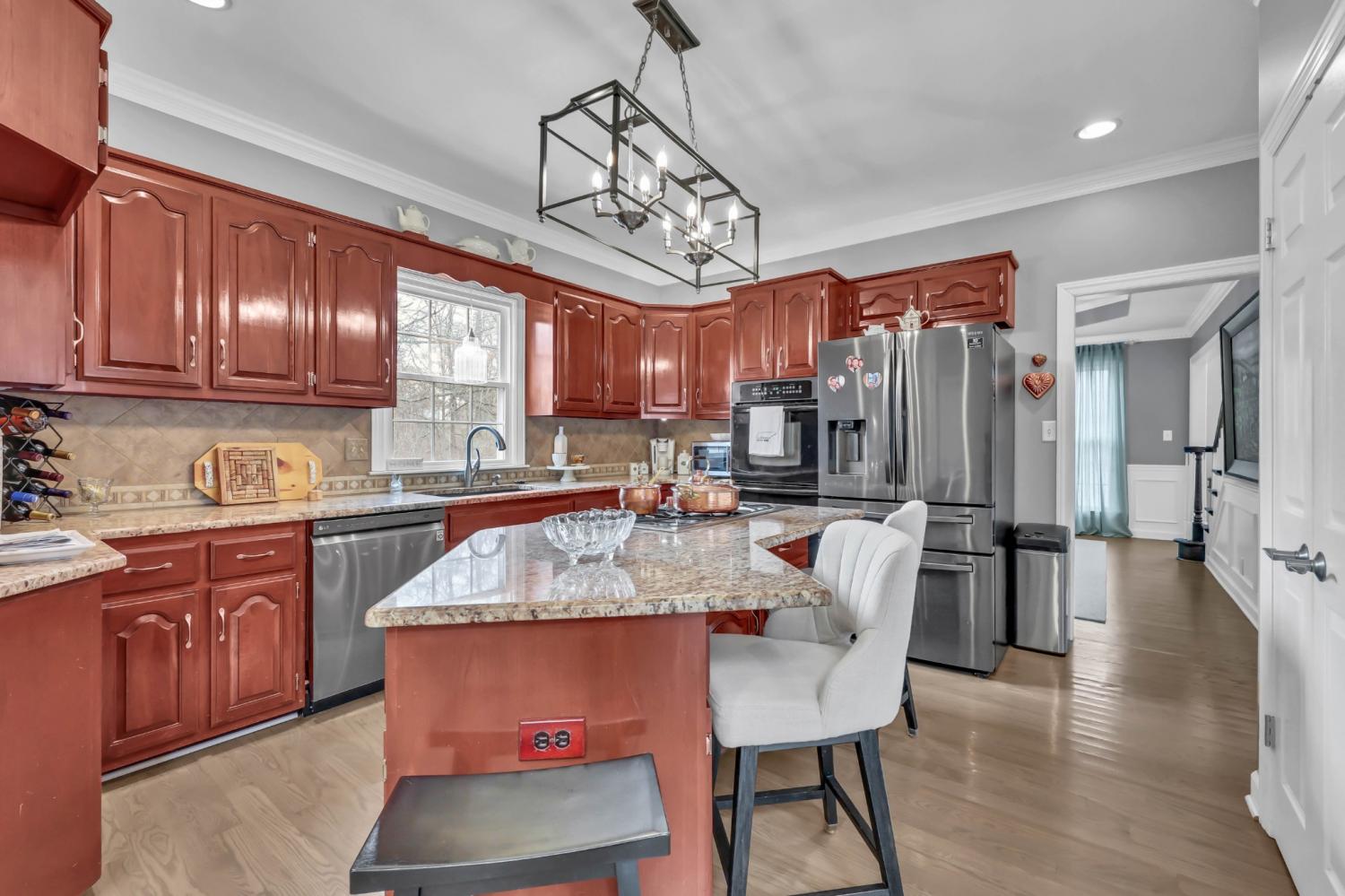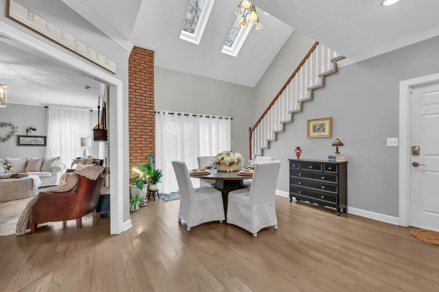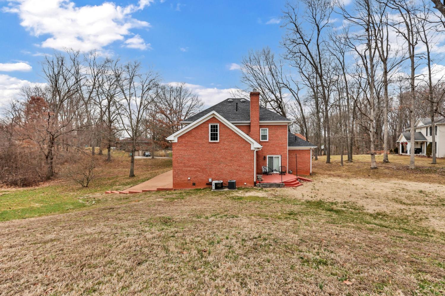 Located in the heart of Sango on 1.39 acres, this impressive all-brick executive-style home offers the perfect balance of space, craftsmanship, and thoughtful design for both everyday living and elevated entertaining. Step into the foyer and you’re immediately greeted by a striking staircase & an abundance of natural light, setting the tone for the quality and scale found throughout. The dining room showcases a trey ceiling and refined architectural detailing, creating a sophisticated backdrop for holidays and formal gatherings. The living room is anchored by a gas-burning fireplace and flows seamlessly into the spacious eat-in kitchen, featuring granite countertops, a gas range, double wall ovens, French door refrigerator, island seating, pantry storage, & abundant cabinetry. The adjoining breakfast room is bright & inviting, enhanced by two skylights & an open-concept layout that fills the space with natural light. Sliding doors lead directly to the back deck, making indoor-outdoor entertaining effortless. A secondary staircase from this area adds both convenience and architectural interest. The main-level primary suite is a private retreat, highlighted by a trey ceiling and a well-appointed bath with dual vanities, soaking tub, tiled shower, and separate his-and-her walk-in closets. Upstairs, you’ll find generously sized secondary bedrooms, a Jack-and-Jill bath, an upper-level loft, and a large vaulted bedroom with built-in bookcases — offering exceptional flexibility for a bonus room, media space, office, or guest suite. Hardwood flooring extends through much of the main level, and a spacious laundry room adds everyday functionality. With a concrete drive, full basement, quality finishes throughout, and a prime Sango location just minutes to the interstate, shopping, and dining, this home combines timeless construction with modern livability. A rare opportunity to own a beautifully designed brick home on acreage in one of Clarksville’s most desirable areas.