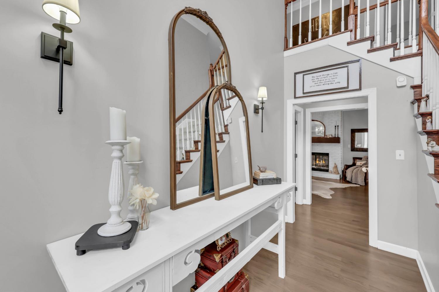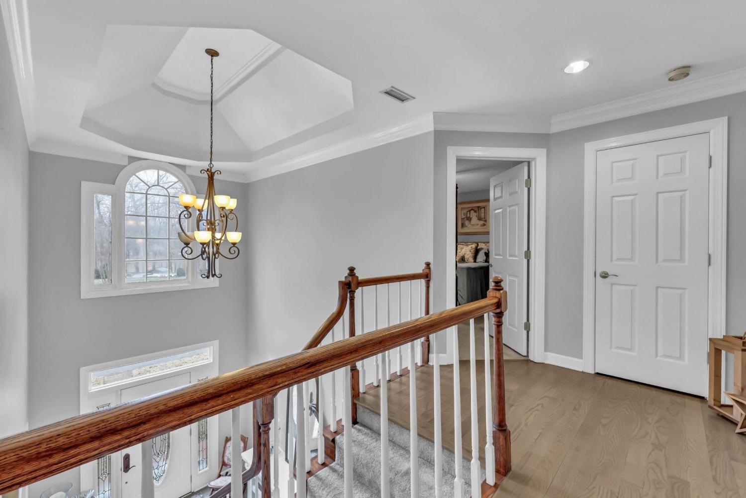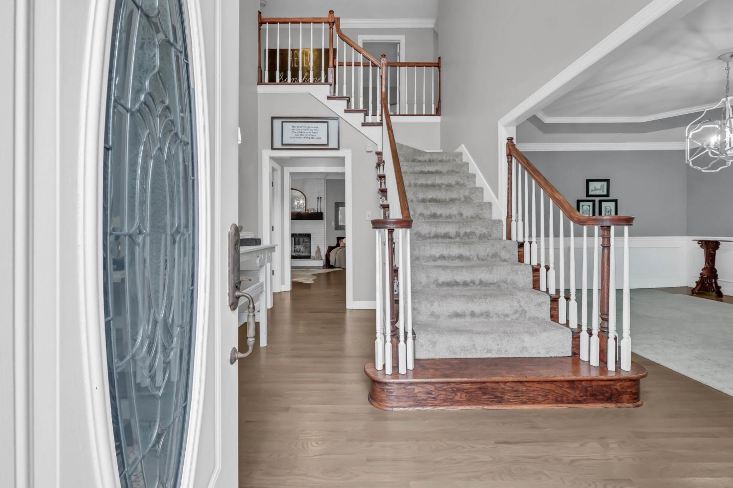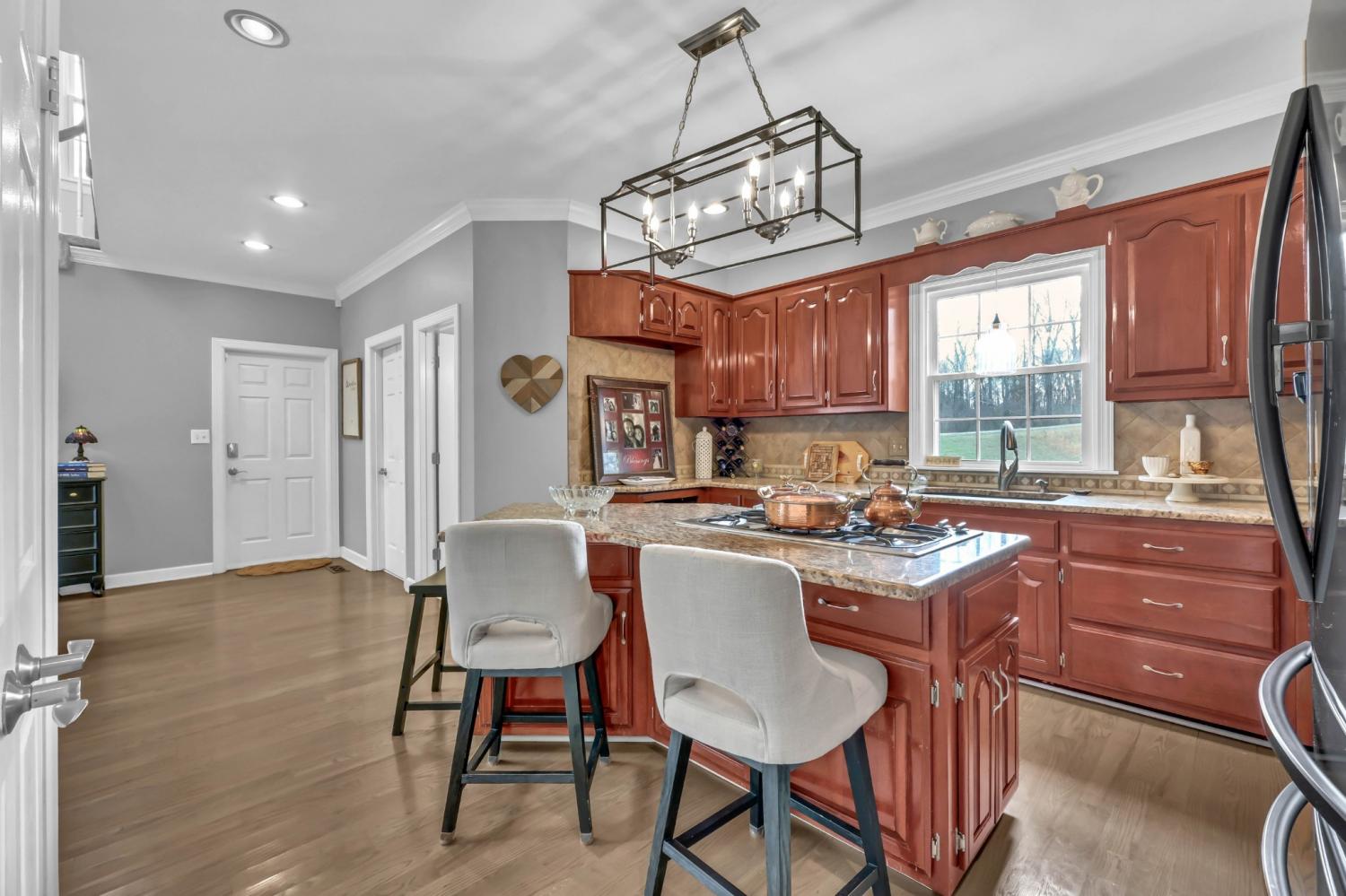 Located in the heart of Sango on 1.39 acres, this impressive all-brick executive-style home offers the perfect balance of space, craftsmanship, and thoughtful design for both everyday living and elevated entertaining. Step into the foyer and you’re immediately greeted by a striking staircase & an abundance of natural light, setting the tone for the quality and scale found throughout. The dining room showcases a trey ceiling and refined architectural detailing, creating a sophisticated backdrop for holidays and formal gatherings. The living room is anchored by a gas-burning fireplace and flows seamlessly into the spacious eat-in kitchen, featuring granite countertops, a gas range, double wall ovens, French door refrigerator, island seating, pantry storage, & abundant cabinetry. The adjoining breakfast room is bright & inviting, enhanced by two skylights & an open-concept layout that fills the space with natural light. Sliding doors lead directly to the back deck, making indoor-outdoor entertaining effortless. A secondary staircase from this area adds both convenience and architectural interest. The main-level primary suite is a private retreat, highlighted by a trey ceiling and a well-appointed bath with dual vanities, soaking tub, tiled shower, and separate his-and-her walk-in closets. Upstairs, you’ll find generously sized secondary bedrooms, a Jack-and-Jill bath, an upper-level loft, and a large vaulted bedroom with built-in bookcases — offering exceptional flexibility for a bonus room, media space, office, or guest suite. Hardwood flooring extends through much of the main level, and a spacious laundry room adds everyday functionality. With a concrete drive, full basement, quality finishes throughout, and a prime Sango location just minutes to the interstate, shopping, and dining, this home combines timeless construction with modern livability. A rare opportunity to own a beautifully designed brick home on acreage in one of Clarksville’s most desirable areas.
