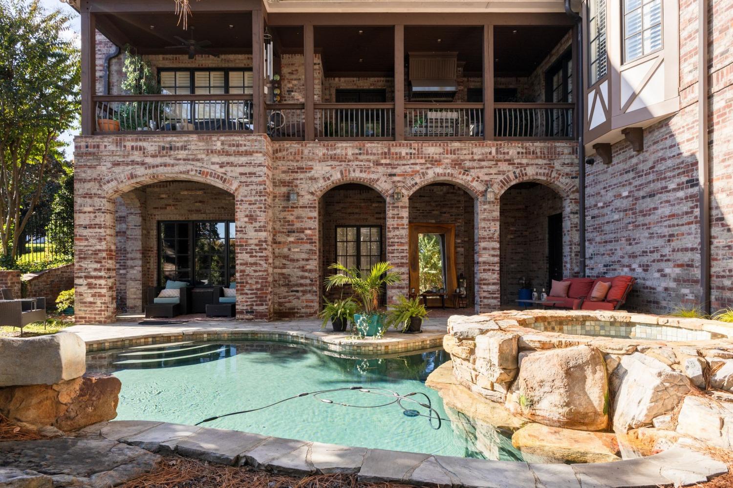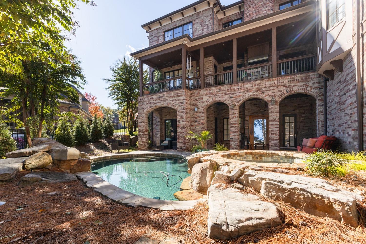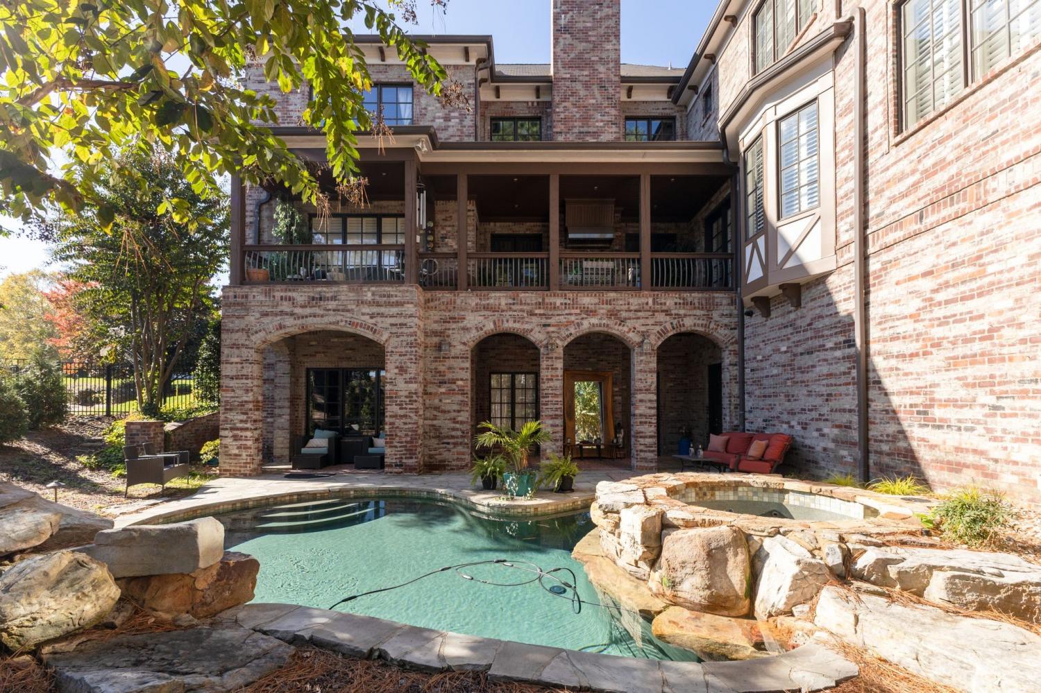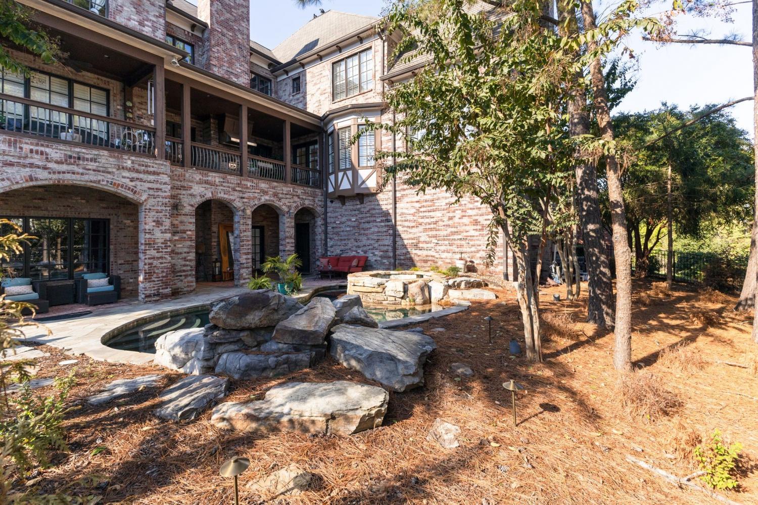 Welcome to the exceptional home you’ve been waiting for—an exquisite European Tudor nestled behind private gates on a quiet Hampton Reserve cul-de-sac. Arrive in style with a grand circular driveway leading to stately double mahogany doors, where timeless stonework, brick, and dual flame lanterns set a sophisticated tone. Step inside to a striking foyer that opens to an elegant two-story formal living area adorned with a chandelier lift and soaring 20-foot ceilings. The gourmet kitchen boasts double ovens, an inviting eat-in bar, and a butler’s pantry—perfect for effortless entertaining. Gather in the spacious hearth room featuring a two-story fireplace and dramatic a-frame ceiling, designed for comfort and connection. Enjoy the convenience of a four-car garage, a dedicated theater room, and a stunning all-wood office with coffered ceilings and built-in bookshelves. Functional luxury continues with laundry rooms on both levels for easy living. The versatile basement offers a large recreation room with slate flooring, a full bar, a workout room with bath, and direct access to the backyard oasis. Outdoors, indulge in a private retreat with a natural stone pool, waterfall, and hot tub—all enveloped by mature trees for ultimate privacy.