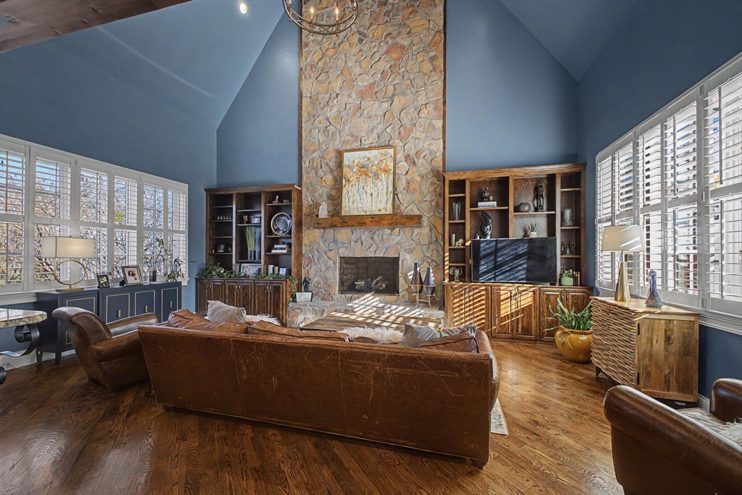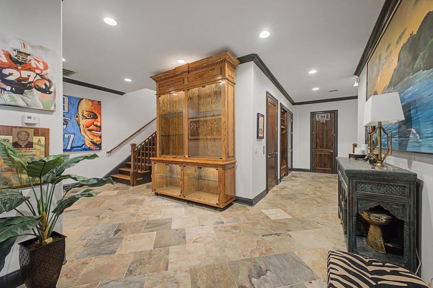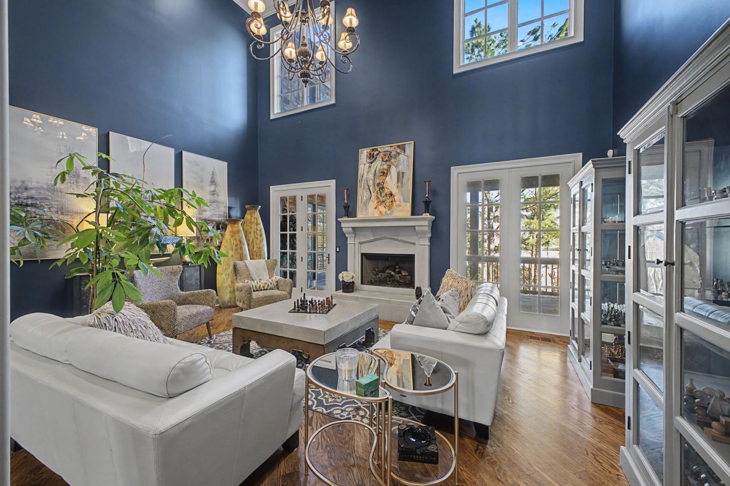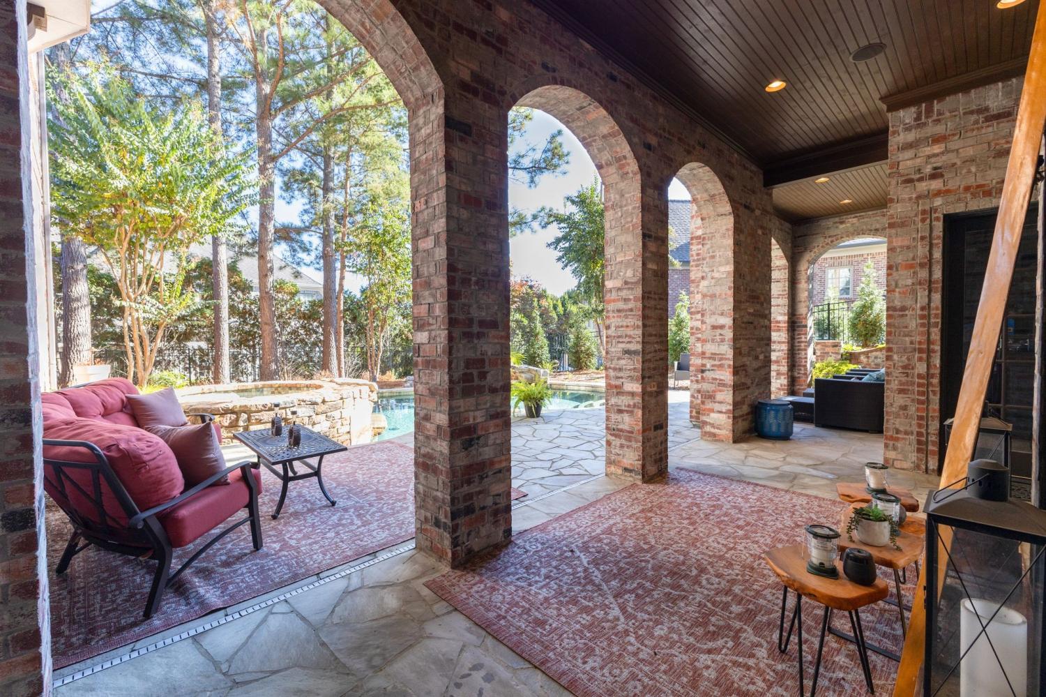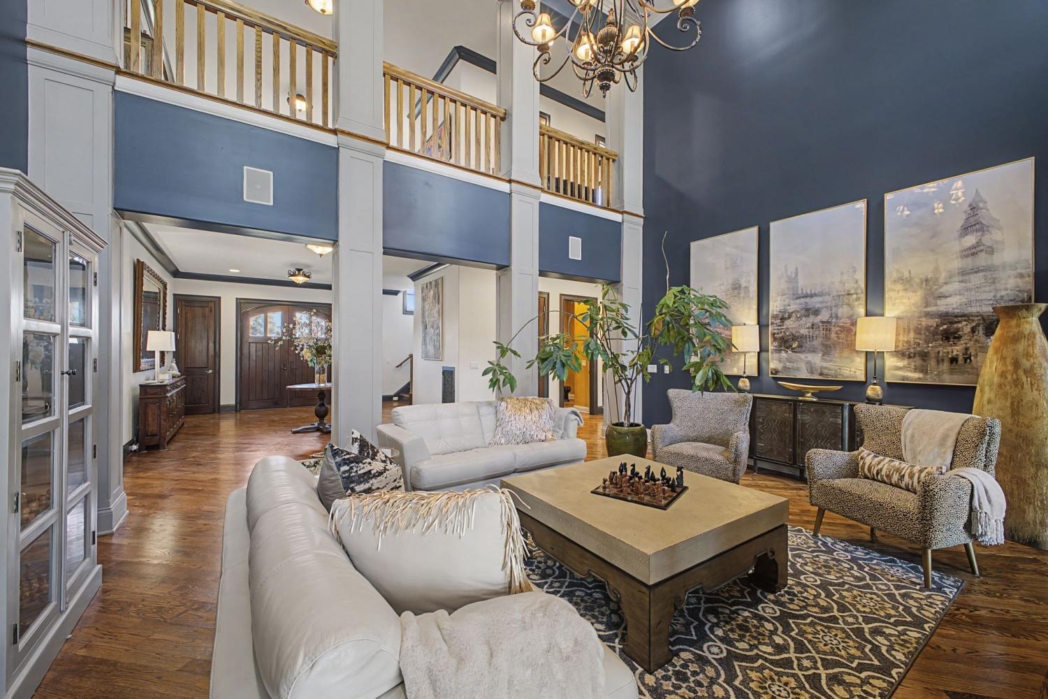 Welcome to the exceptional home you’ve been waiting for—an exquisite European Tudor nestled behind private gates on a quiet Hampton Reserve cul-de-sac. Arrive in style with a grand circular driveway leading to stately double mahogany doors, where timeless stonework, brick, and dual flame lanterns set a sophisticated tone. Step inside to a striking foyer that opens to an elegant two-story formal living area adorned with a chandelier lift and soaring 20-foot ceilings. The gourmet kitchen boasts double ovens, an inviting eat-in bar, and a butler’s pantry—perfect for effortless entertaining. Gather in the spacious hearth room featuring a two-story fireplace and dramatic a-frame ceiling, designed for comfort and connection. Enjoy the convenience of a four-car garage, a dedicated theater room, and a stunning all-wood office with coffered ceilings and built-in bookshelves. Functional luxury continues with laundry rooms on both levels for easy living. The versatile basement offers a large recreation room with slate flooring, a full bar, a workout room with bath, and direct access to the backyard oasis. Outdoors, indulge in a private retreat with a natural stone pool, waterfall, and hot tub—all enveloped by mature trees for ultimate privacy.