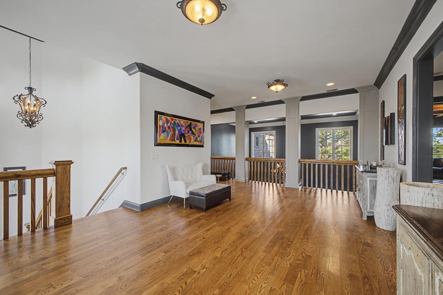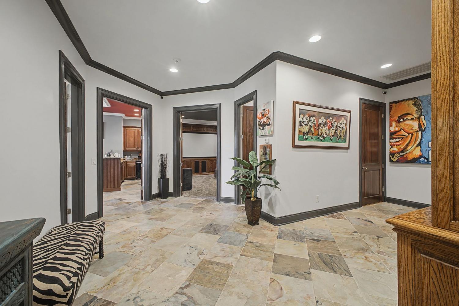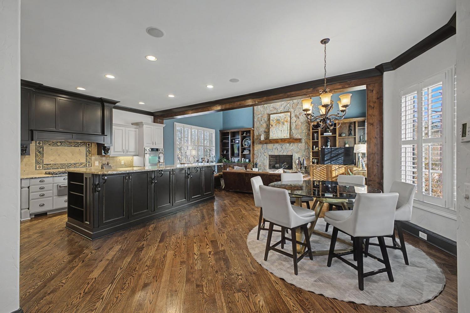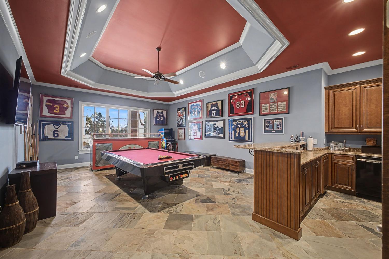 Welcome to the exceptional home you’ve been waiting for—an exquisite European Tudor nestled behind private gates on a quiet Hampton Reserve cul-de-sac. Arrive in style with a grand circular driveway leading to stately double mahogany doors, where timeless stonework, brick, and dual flame lanterns set a sophisticated tone. Step inside to a striking foyer that opens to an elegant two-story formal living area adorned with a chandelier lift and soaring 20-foot ceilings. The gourmet kitchen boasts double ovens, an inviting eat-in bar, and a butler’s pantry—perfect for effortless entertaining. Gather in the spacious hearth room featuring a two-story fireplace and dramatic a-frame ceiling, designed for comfort and connection. Enjoy the convenience of a four-car garage, a dedicated theater room, and a stunning all-wood office with coffered ceilings and built-in bookshelves. Functional luxury continues with laundry rooms on both levels for easy living. The versatile basement offers a large recreation room with slate flooring, a full bar, a workout room with bath, and direct access to the backyard oasis. Outdoors, indulge in a private retreat with a natural stone pool, waterfall, and hot tub—all enveloped by mature trees for ultimate privacy.