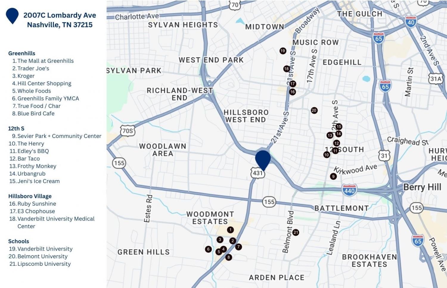 Welcome to refined living in the heart of Green Hills. This stunning single-family residence offers nearly 4,000 square feet of thoughtfully designed space, blending elegance, comfort, and effortless functionality. Step inside to an airy open-concept floor plan filled with natural light and beautifully updated finishes throughout. With a large primary suite and spacious guest bedroom/office both on the main level, the layout is as practical as it is luxurious — ideal for both everyday living and hosting guests with ease. Upstairs, you will find the expansive bonus room and three additional bedrooms providing endless possibilities— a media retreat, game room, private office, or additional guest suites…the choice is yours. Outside, the inviting patio creates the perfect backdrop for unforgettable evenings of entertaining or quiet mornings with coffee. Just blocks from premier dining and high-end shopping, you’re moments away from everything Green Hills and 12th South has to offer. Take a short golf-cart ride to 12th South for Thursday night farmers markets, boutique shopping, and some of the city’s most sought-after restaurants. Whether you’re searching for your dream home or a savvy investment, this property delivers. With a proven track record as an income-producing asset and financials available upon request, it presents a rare opportunity to own both luxury and long-term value. Come get the keys to the perfect combination of location, lifestyle, and income potential. Plus NO HOA + Google fiber is already installed at the property. Call us to schedule your private tour today! Up to 1% lender credit on the loan amount when buyer uses Seller's Preferred Lender. Call Keni Henderson to schedule your private showing - (216) 233-6963.