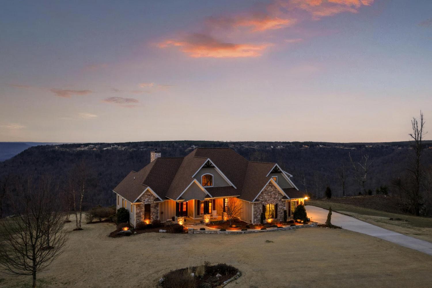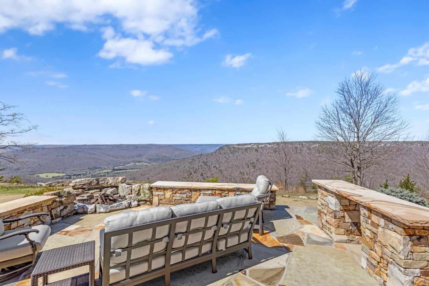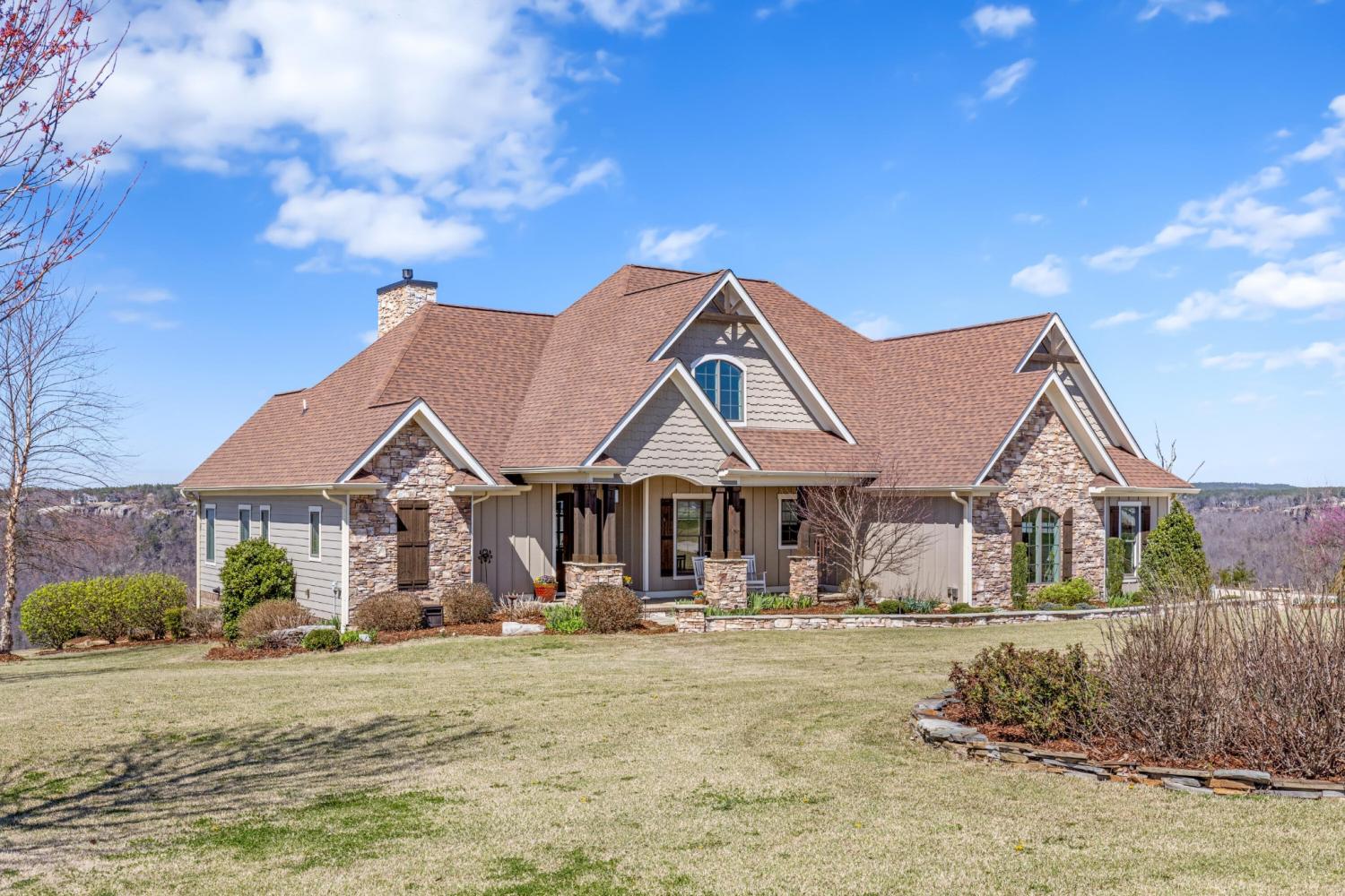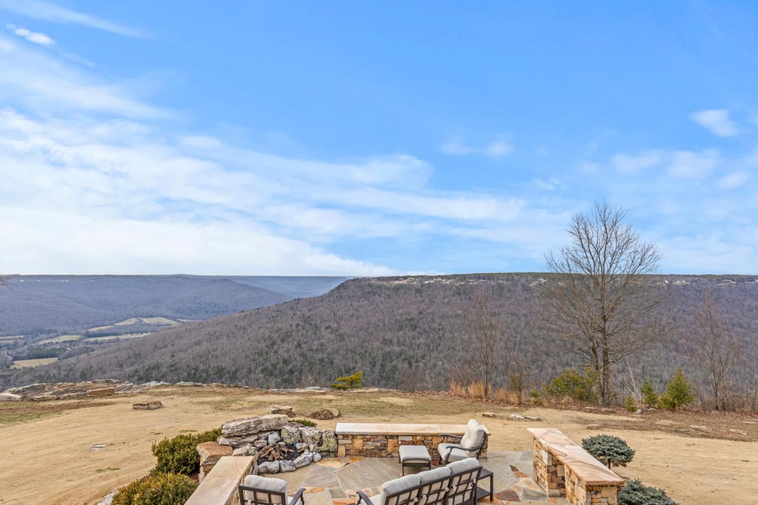 Endless Mountain Views from a Quiet Bluff Retreat Extraordinary Bluff Estate | 325+ Ft Brow Frontage, Quiet Mountain Setting, 1.8 Acres, Sweeping Plateau & Valley Views Perched along one of the most coveted bluff lines in Jasper Highlands, 985 Sunset Circle offers a rare opportunity to experience luxury mountain living on 1.8 private acres with over 325 feet of exceptional brow frontage on a quiet mountain peninsula. From this extraordinary vantage point, breathtaking panoramic views unfold across the Cumberland Plateau and deep into the Sequatchie Valley, creating a dramatic landscape of rolling mountains, expansive skies, and unforgettable sunsets. Uniquely positioned on the brow, the property enjoys both inspiring sunrises and spectacular sunsets, filling the home with ever-changing mountain light throughout the day. Thoughtfully designed to capture the scenery, inspiring mountain views are enjoyed from many of the home's primary living spaces, creating a constant connection to the surrounding landscape. Designed to embrace its spectacular setting, the home features multiple outdoor living spaces positioned to capture the remarkable bluff views. Just off the living room, a covered bluff-side deck provides an elevated vantage point for enjoying the surrounding mountains and valley below. Vaulted hardwood ceilings and custom-designed motorized blinds create a comfortable setting for relaxing or entertaining while immersed in the scenery. Below the deck, a beautifully crafted flagstone patio offers an inviting outdoor retreat surrounded by the natural beauty of the bluff and enhanced by thoughtfully designed mature landscaping that complements the natural mountain setting. A dramatic gas fire pit crafted from locally sourced mountain rock creates the perfect setting for evening gatherings beneath the stars, while a custom cascading waterfall feature provides a striking natural centerpiece, its gentle flow adding a soothing soundtrack to this tranquil out